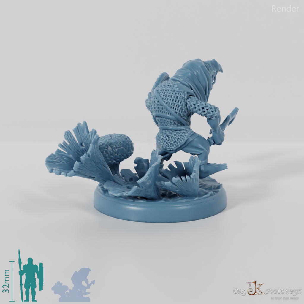 Gerüsteter und bewaffneter Goblin. Kopf und Waffe(n) des Modells sind modular und können beliebig mit allen Goblinmodellen von Asgard Rising kombiniert werden. Modell wahlweise mit szenischer 25mm-Rundbase verfügbar