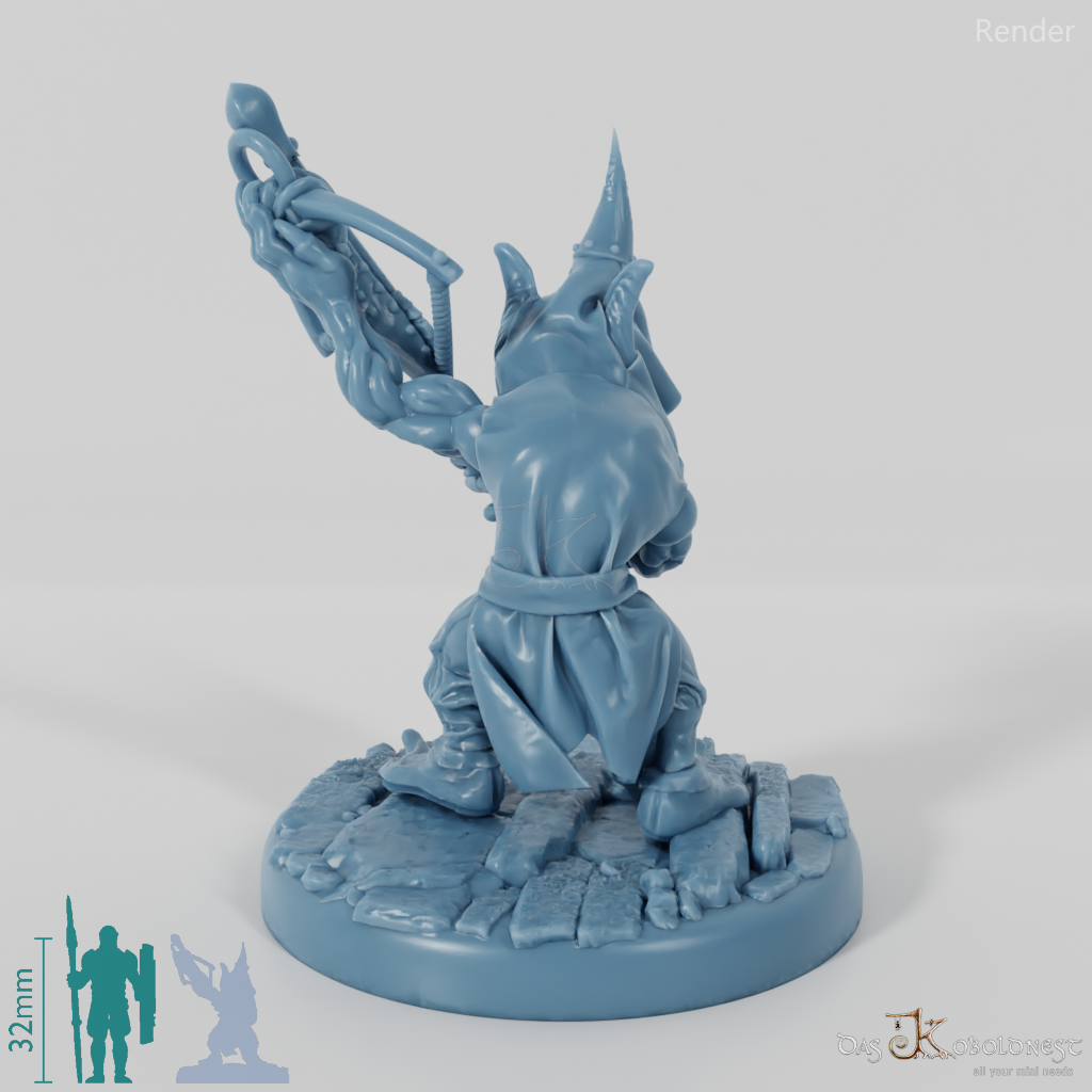 Gerüsteter und bewaffneter Goblin mit Fernkampfwaffe. Kopf und Waffe(n) des Modells sind modular und können beliebig mit allen Goblinmodellen von Asgard Rising kombiniert werden. Modell wahlweise mit szenischer 25mm-Rundbase verfügbar