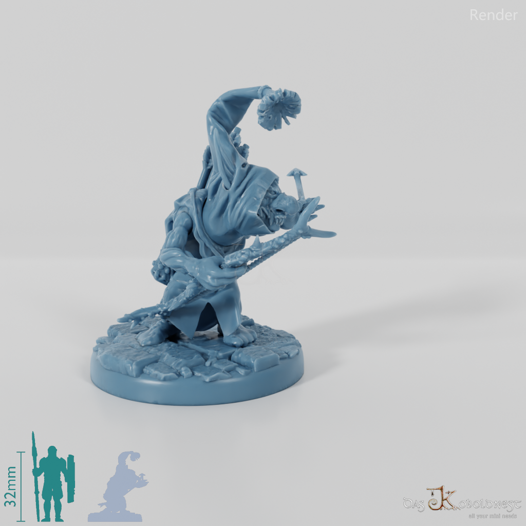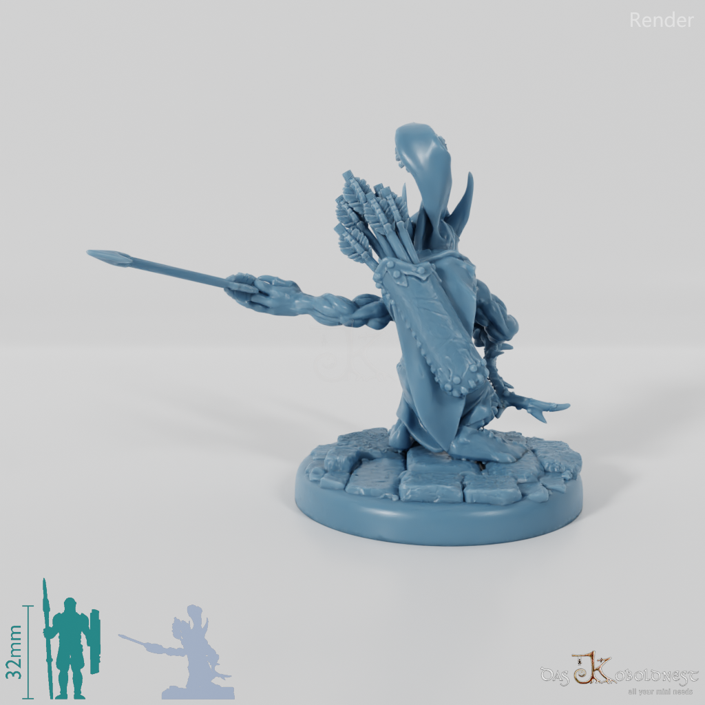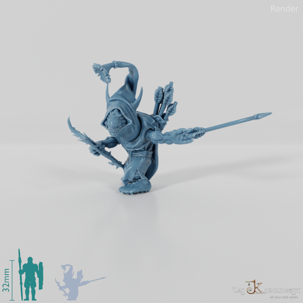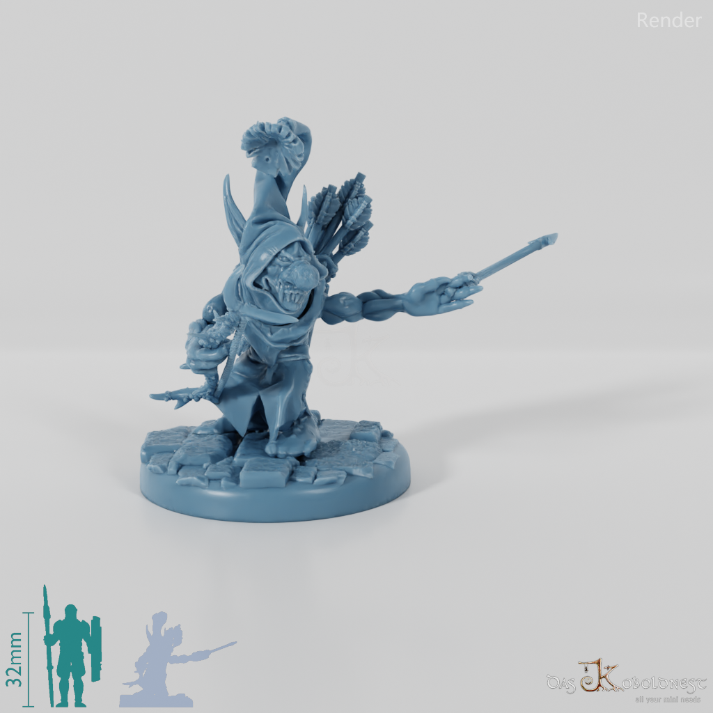 Gerüsteter und bewaffneter Goblin mit Fernkampfwaffe. Kopf und Waffe(n) des Modells sind modular und können beliebig mit allen Goblinmodellen von Asgard Rising kombiniert werden. Modell wahlweise mit szenischer 25mm-Rundbase verfügbar