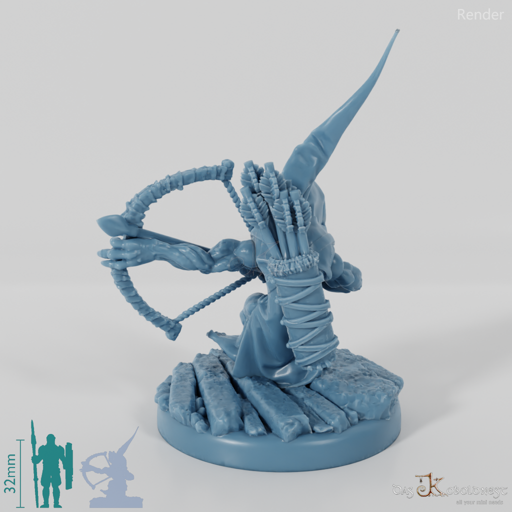 Gerüsteter und bewaffneter Goblin mit Fernkampfwaffe. Kopf und Waffe(n) des Modells sind modular und können beliebig mit allen Goblinmodellen von Asgard Rising kombiniert werden. Modell wahlweise mit szenischer 25mm-Rundbase verfügbar