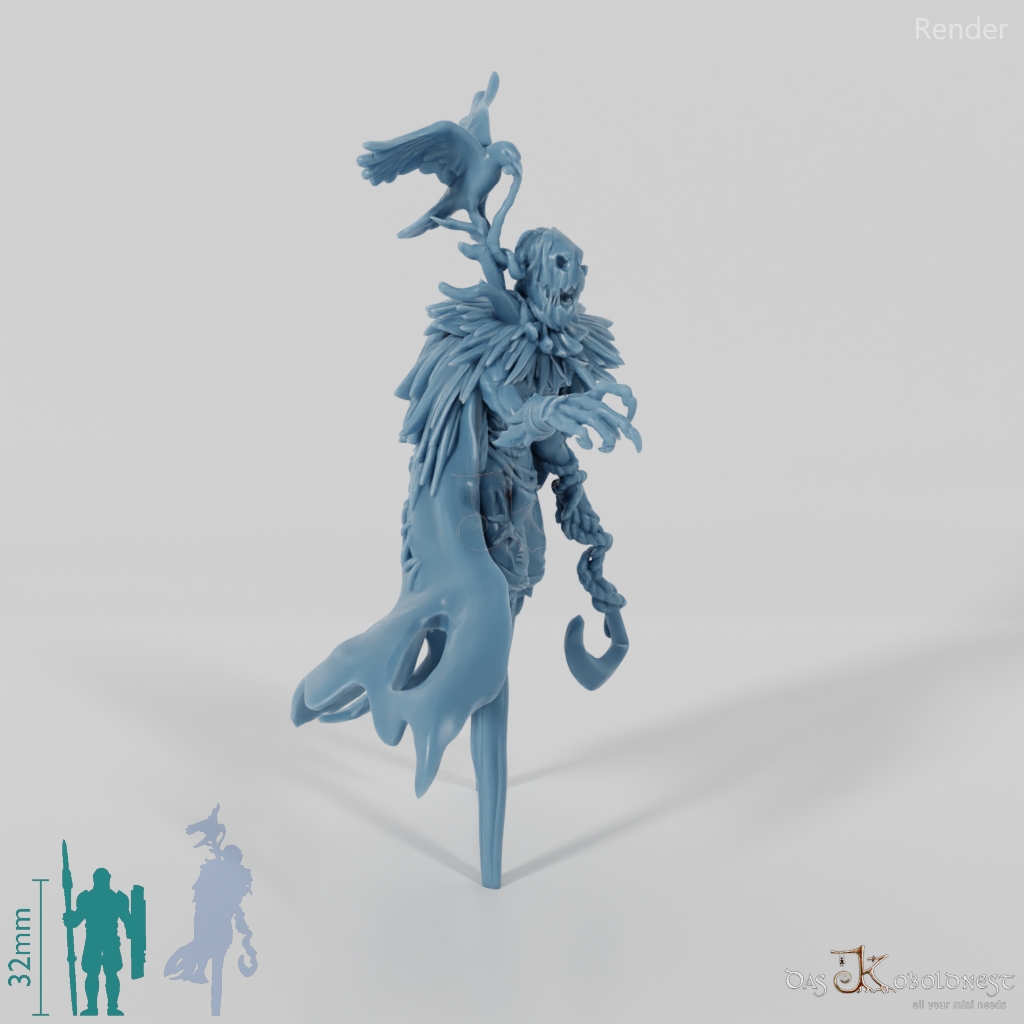 Lebendige Vogelscheuche, die sich auf Holzstelzen fortbewegt, eine Krähe auf der Schulter hat und mit einem großen Metallhaken bewaffnet ist