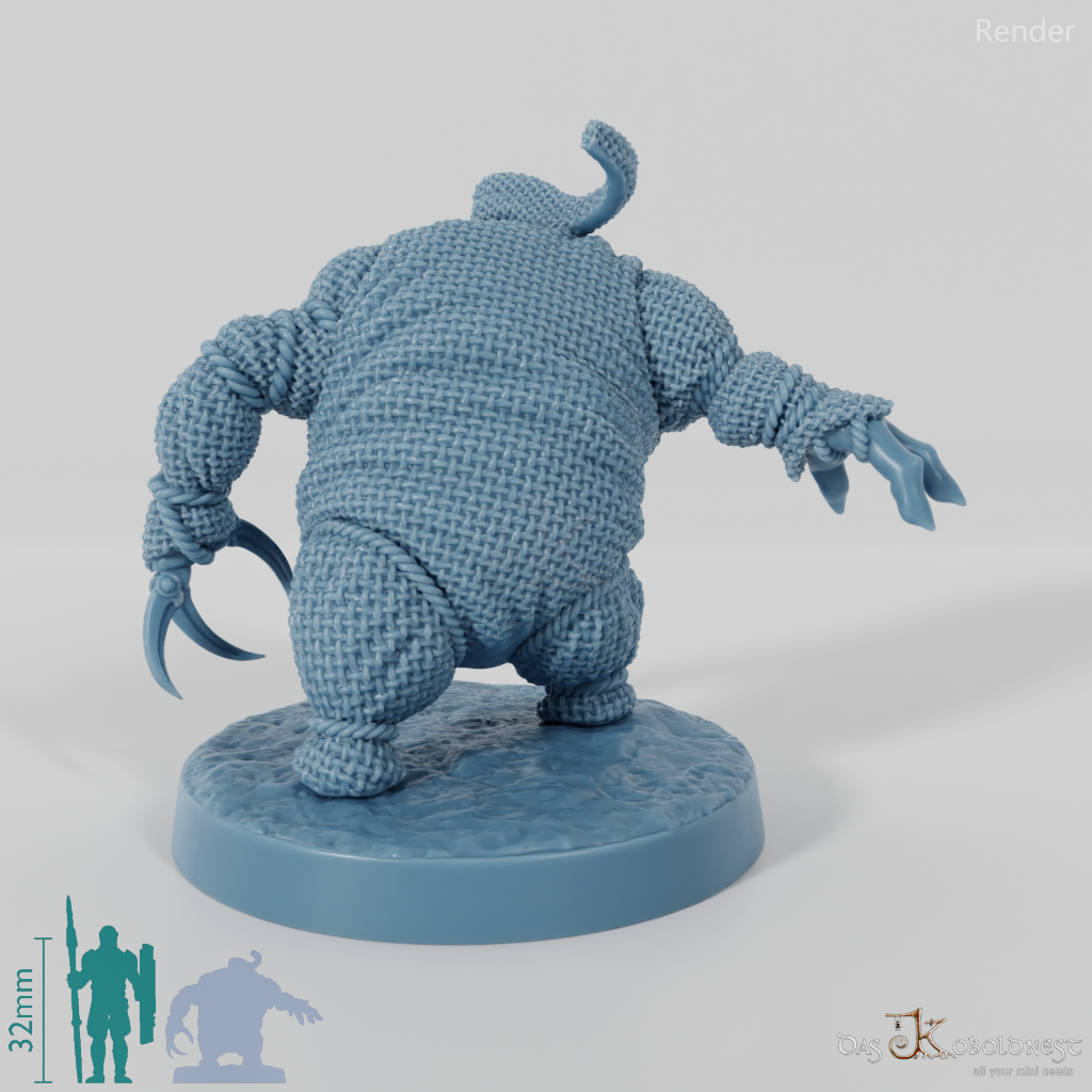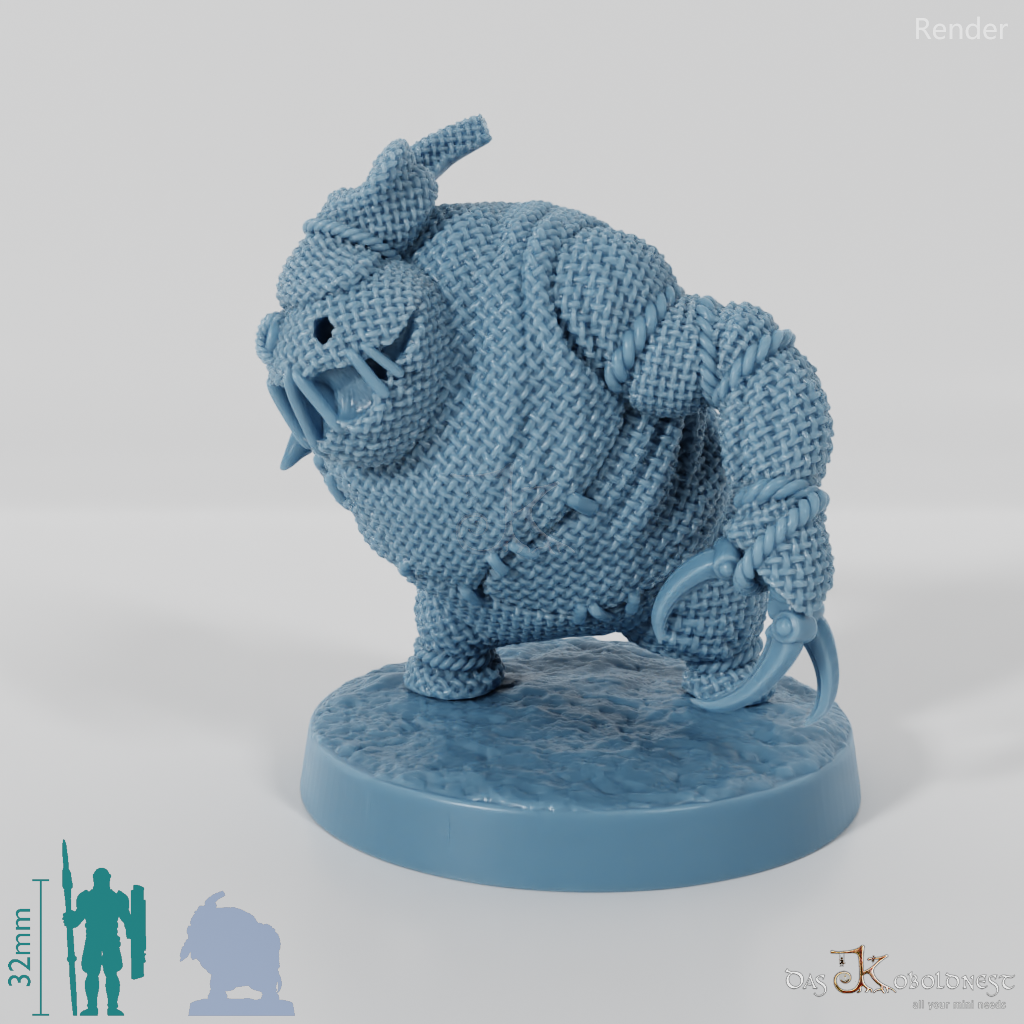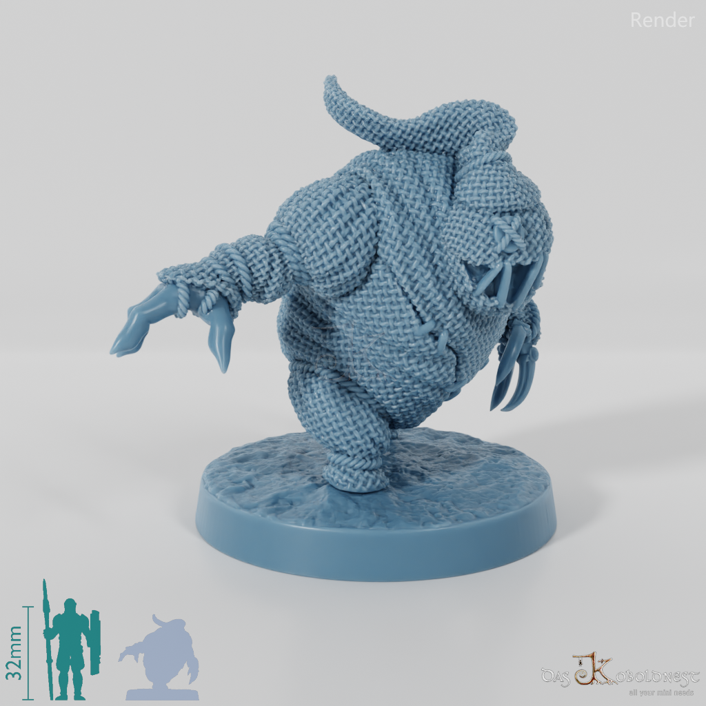 Belebter Kartoffelsack mit grob zugenähtem Mund, Knopfaugen und scharfen Klauen