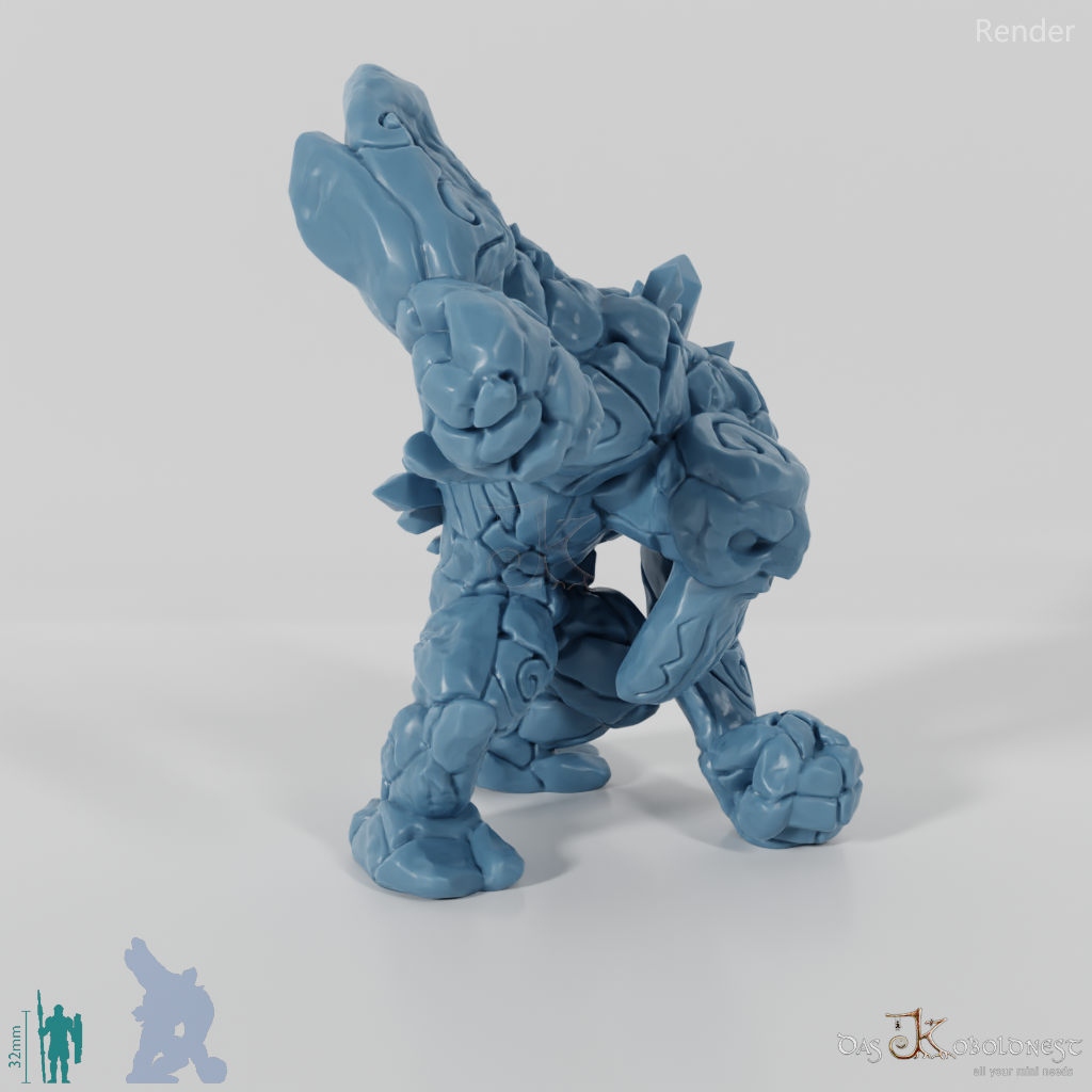 Riesige, felsige Gestalt, deren Körper mit Runen verziert ist und aus der sich Kristalle erheben.