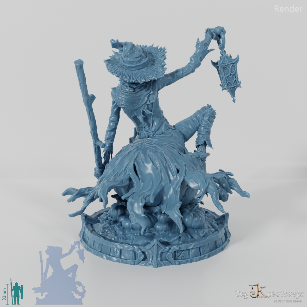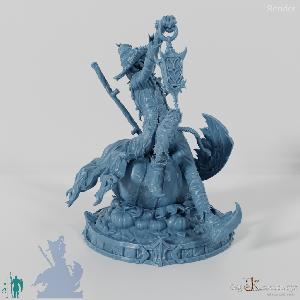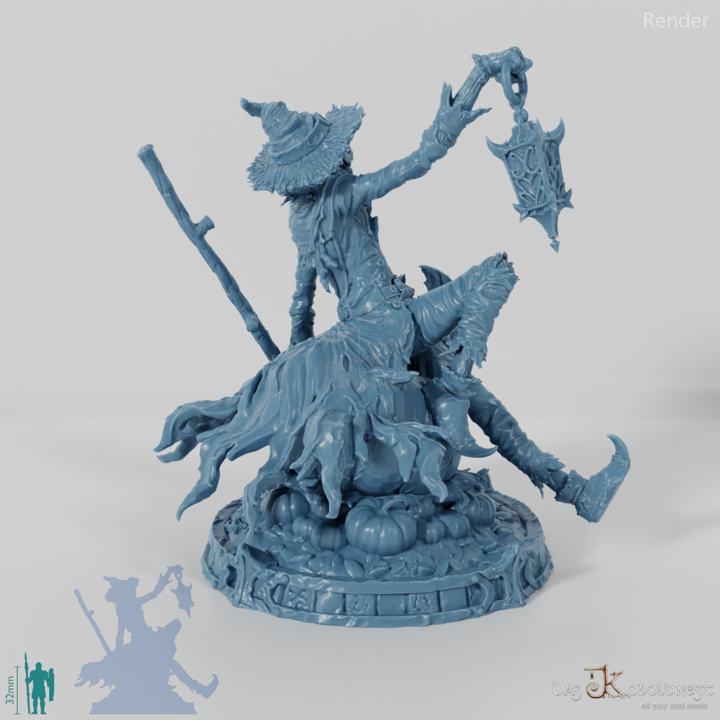 Vogelscheuche mit geschnitztem Kürbiskopf, Lederweste und Strohhut, die auf einem Riesenkürbis sitzt, eine Sense trägt und eine Laterne in die Höhe hält
