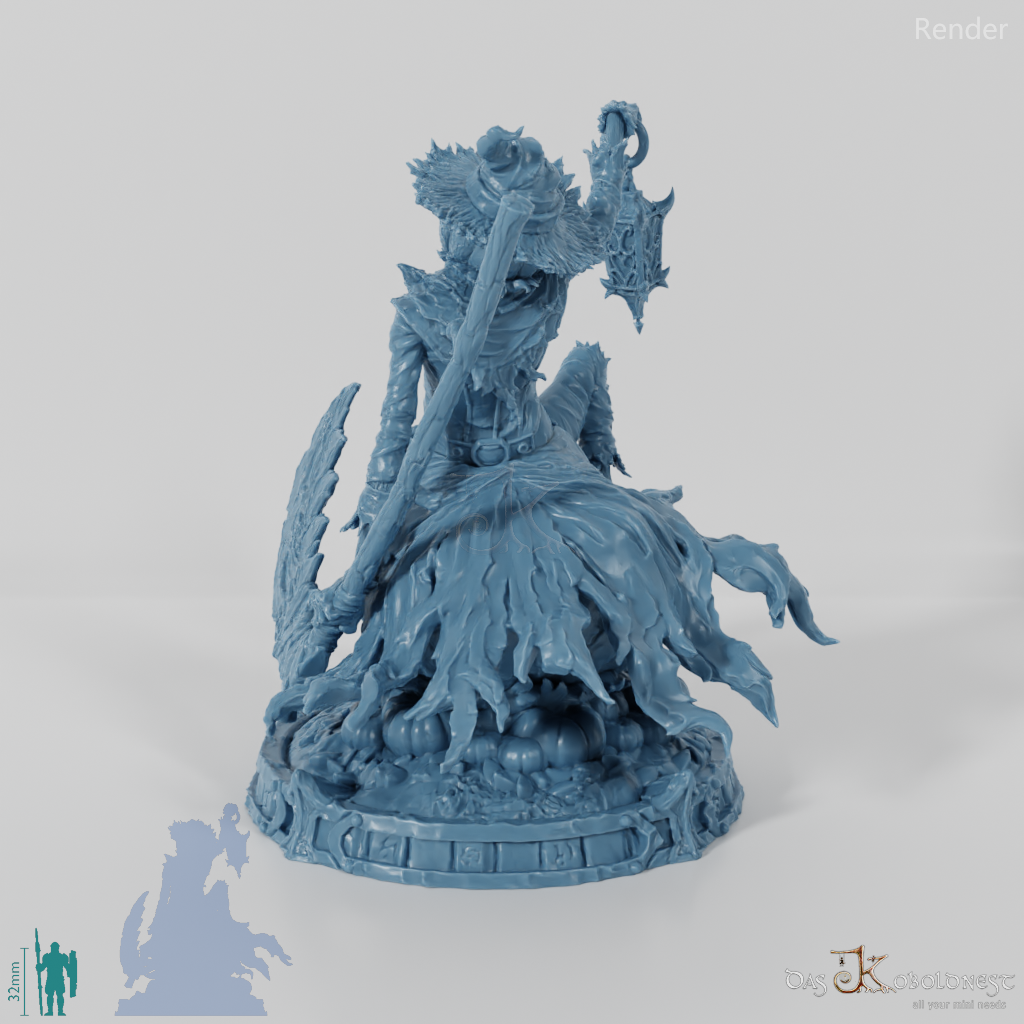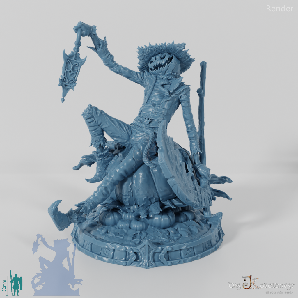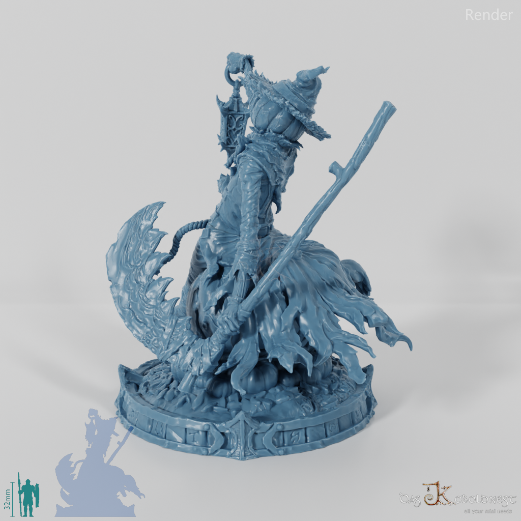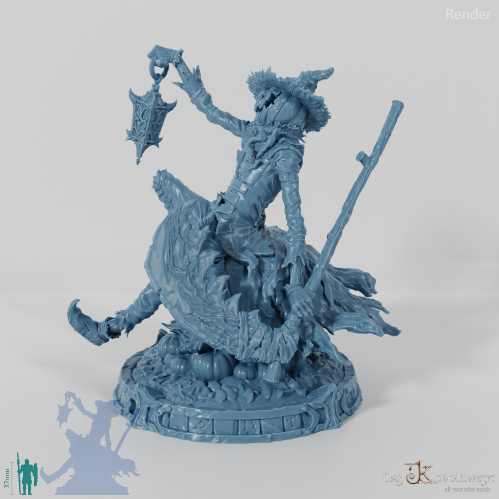 Vogelscheuche mit geschnitztem Kürbiskopf, Lederweste und Strohhut, die auf einem Riesenkürbis sitzt, eine Sense trägt und eine Laterne in die Höhe hält