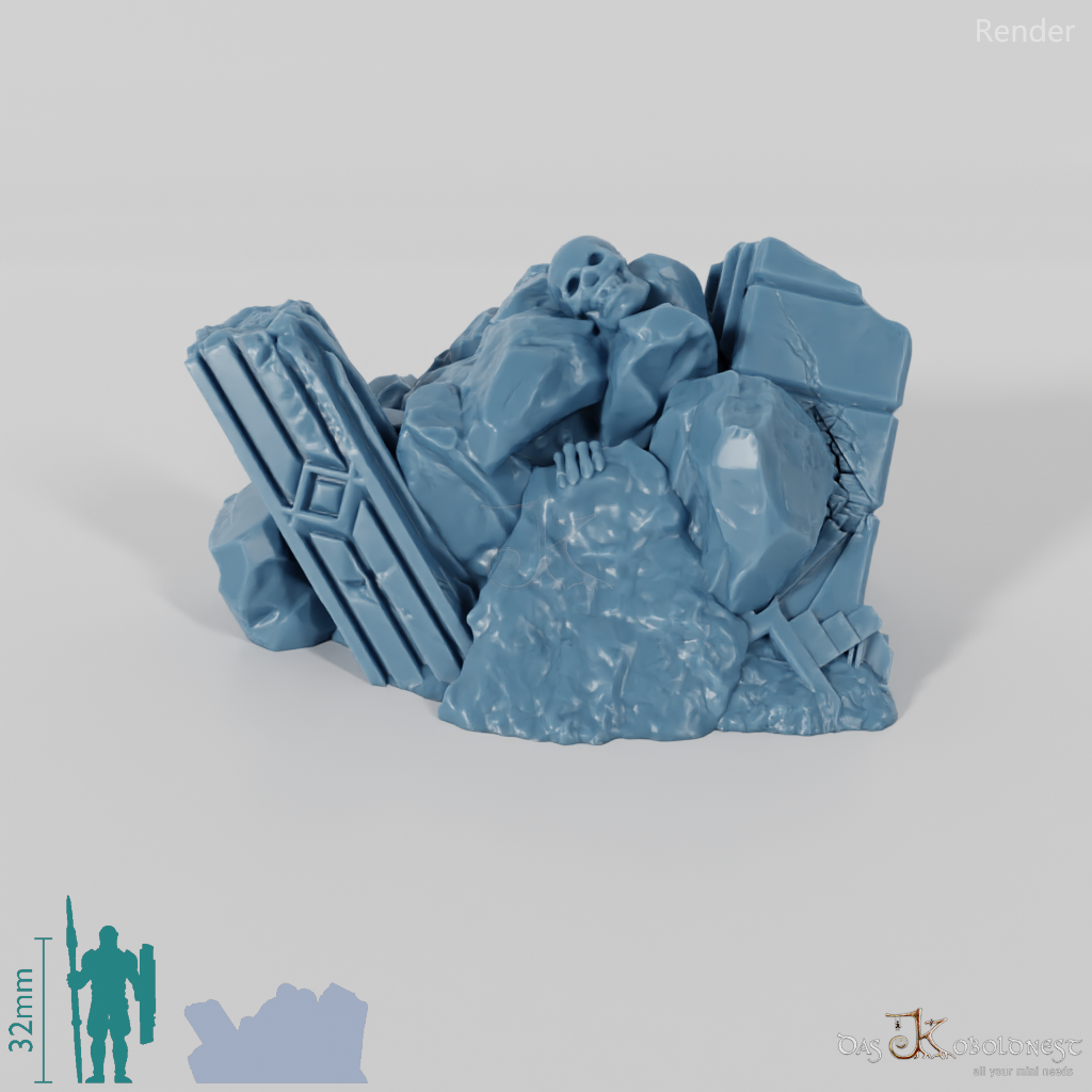 Zwergische Ruinenbruchstücke mit Zwergenschädel, zwischen denen eine knochige Hand hervorkriecht und zwei Augen aus der Dunkelheit starren