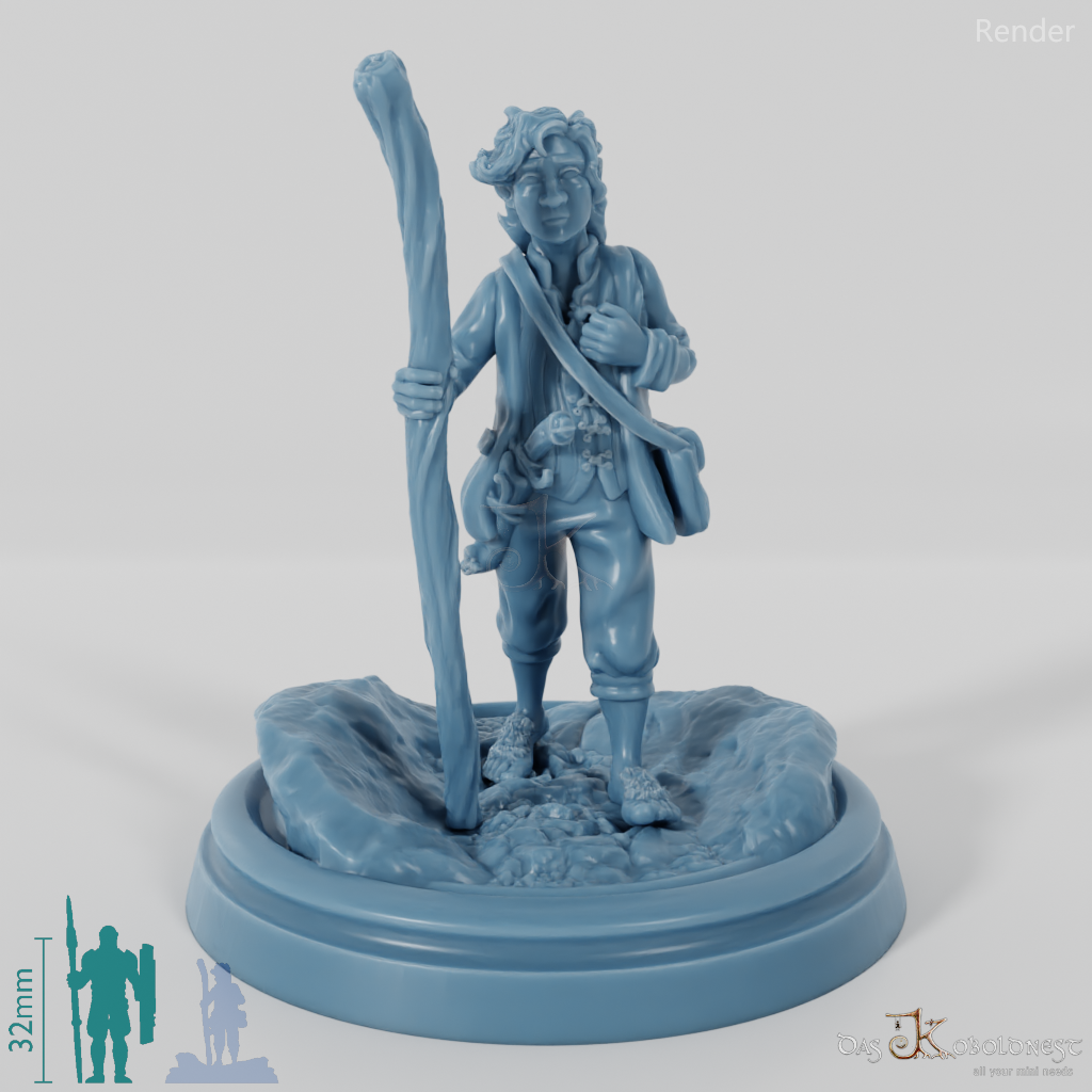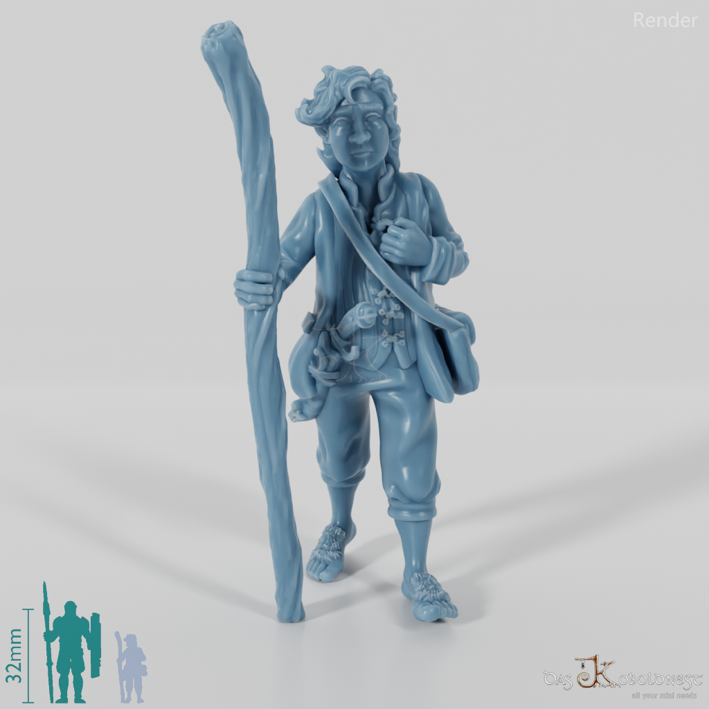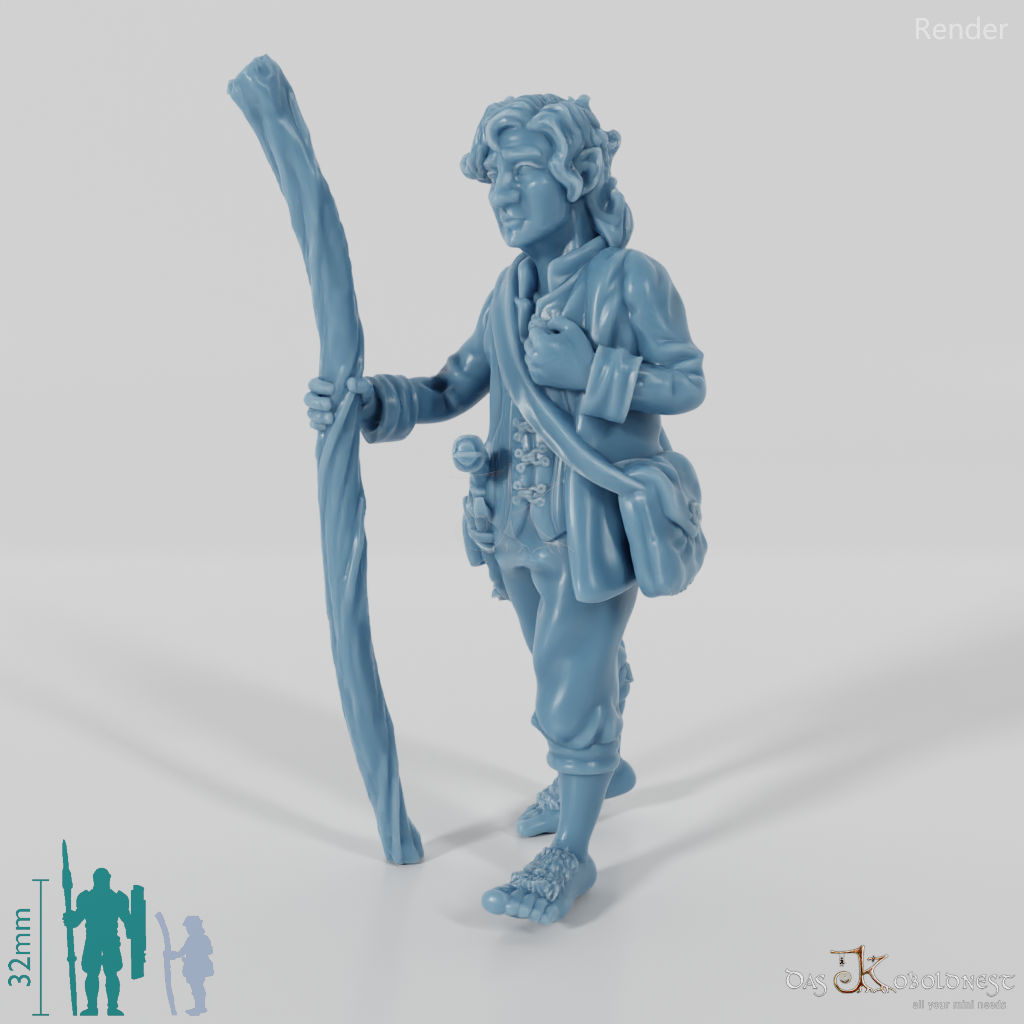 Halbling mit Wanderstab und Umhängetasche, der mit der Hand nach einem Ring an seiner Halskette greift