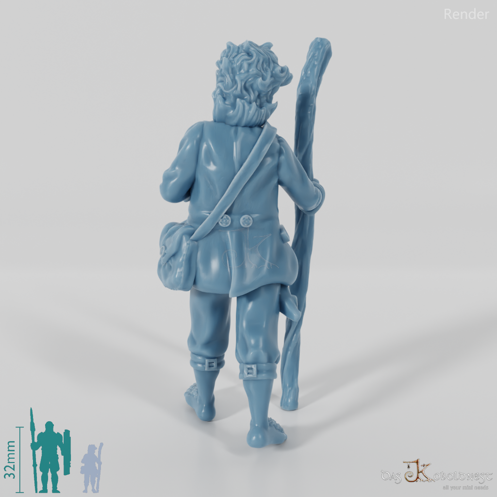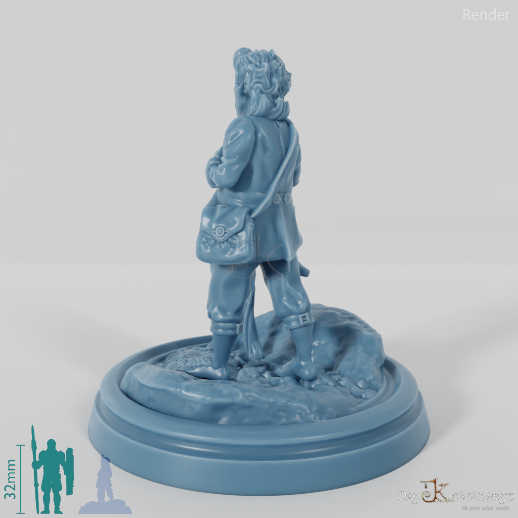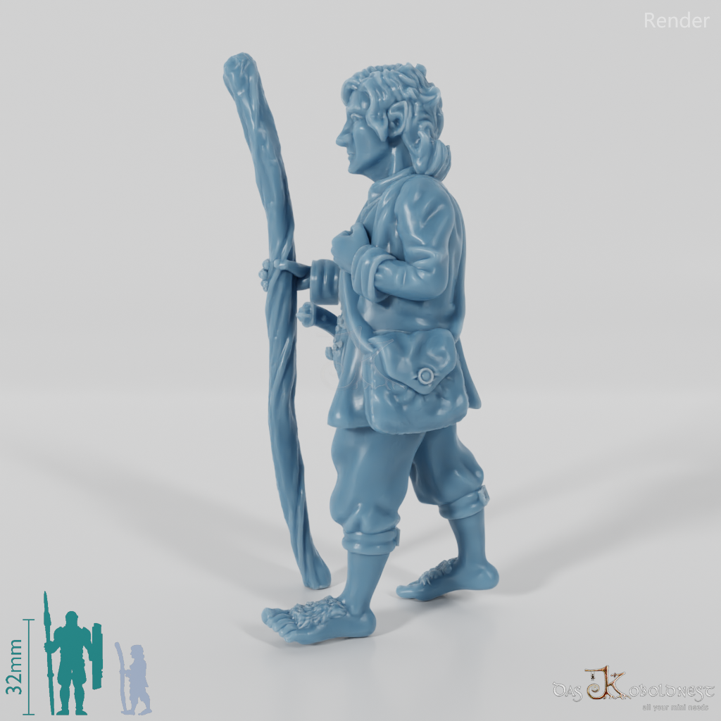 Halbling mit Wanderstab und Umhängetasche, der mit der Hand nach einem Ring an seiner Halskette greift