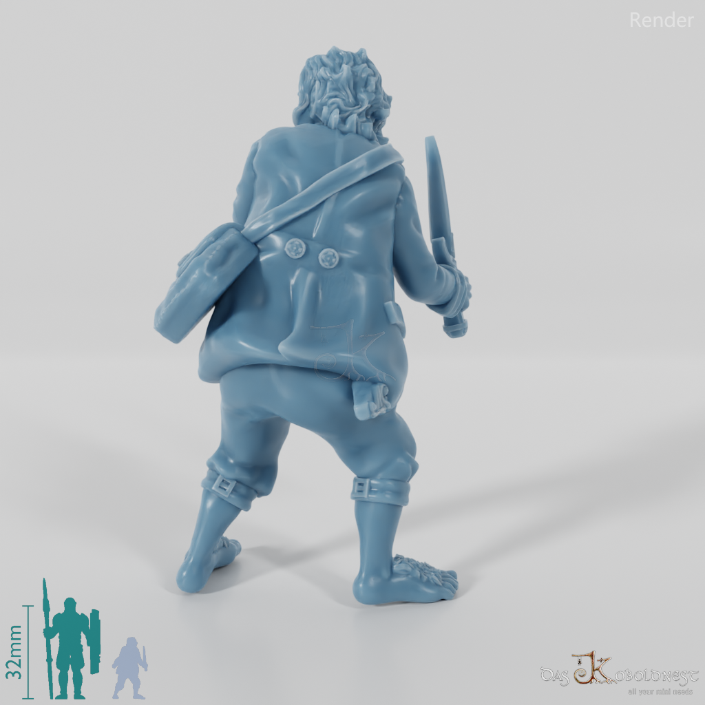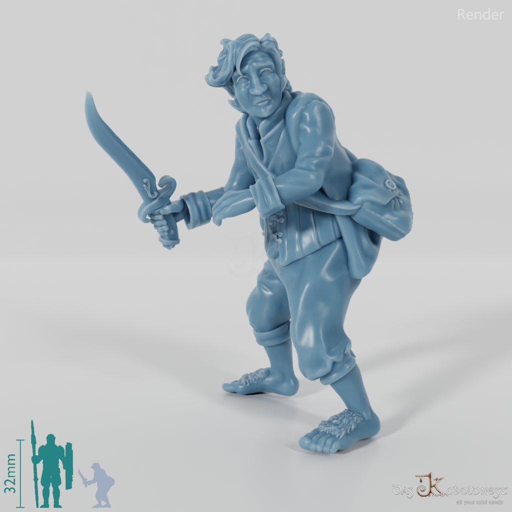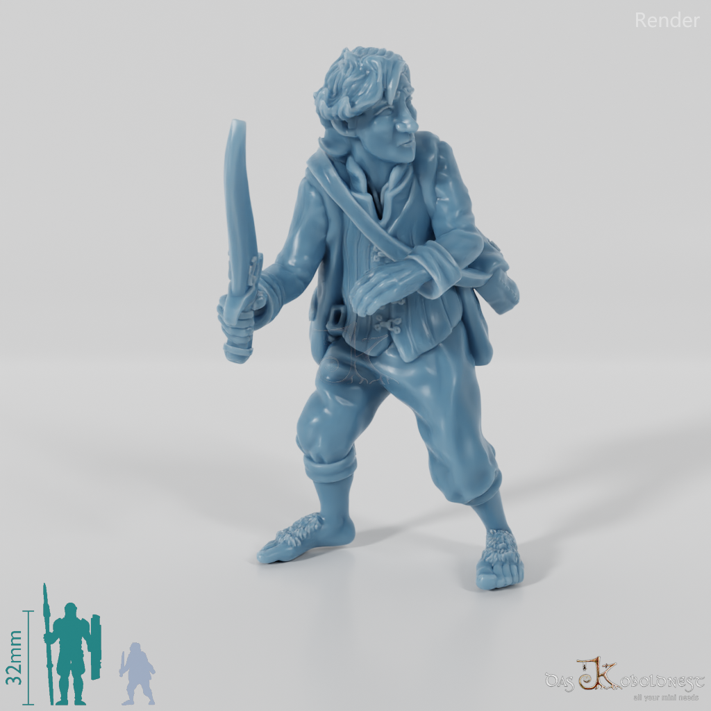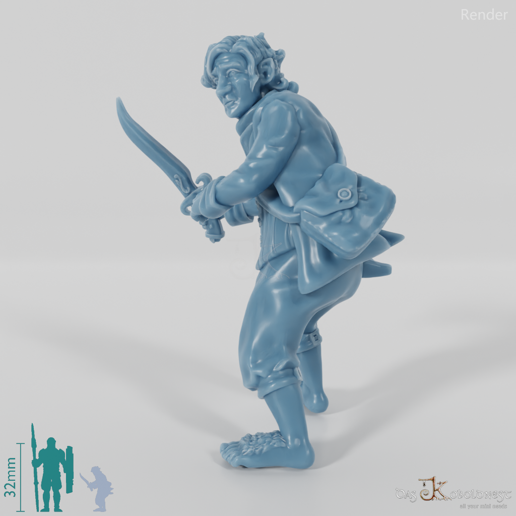 Halbling, der leicht geduckt ein kurzes, gebogenes Schwert vor sich hält