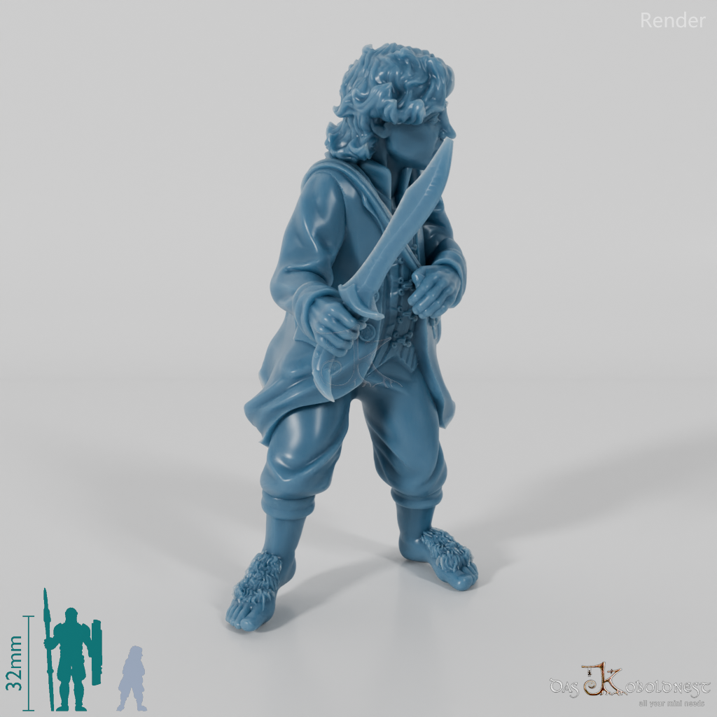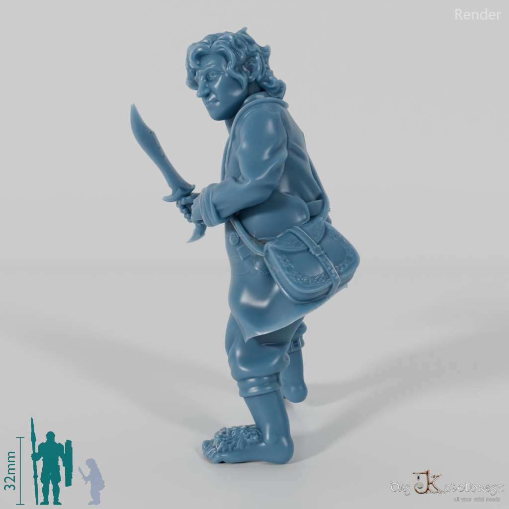 Halbling, der leicht geduckt ein kurzes, gebogenes Schwert vor sich hält. Dies ist eine Neuauflage des ursprünglichen Modells.