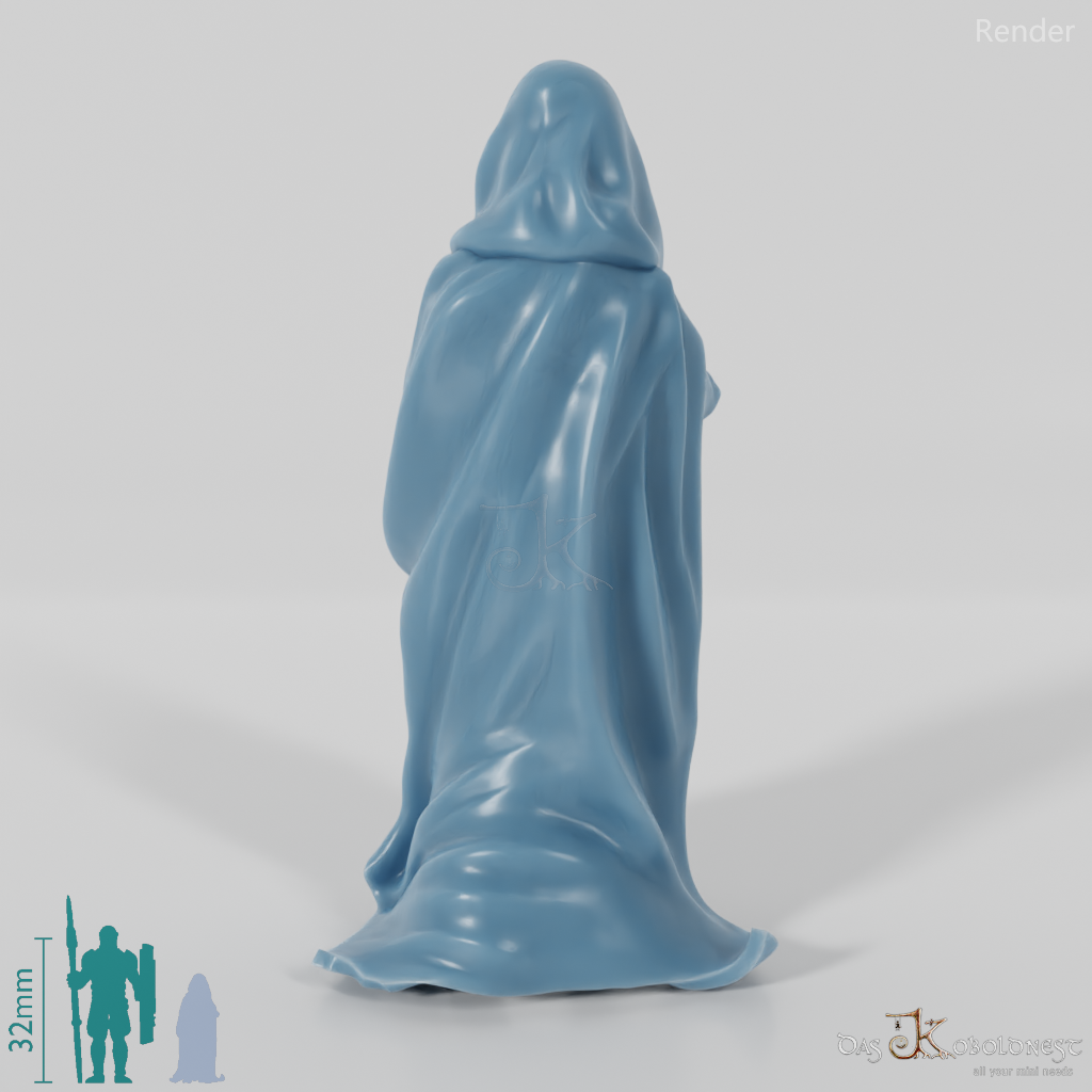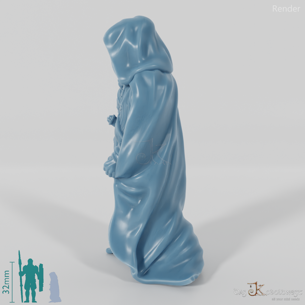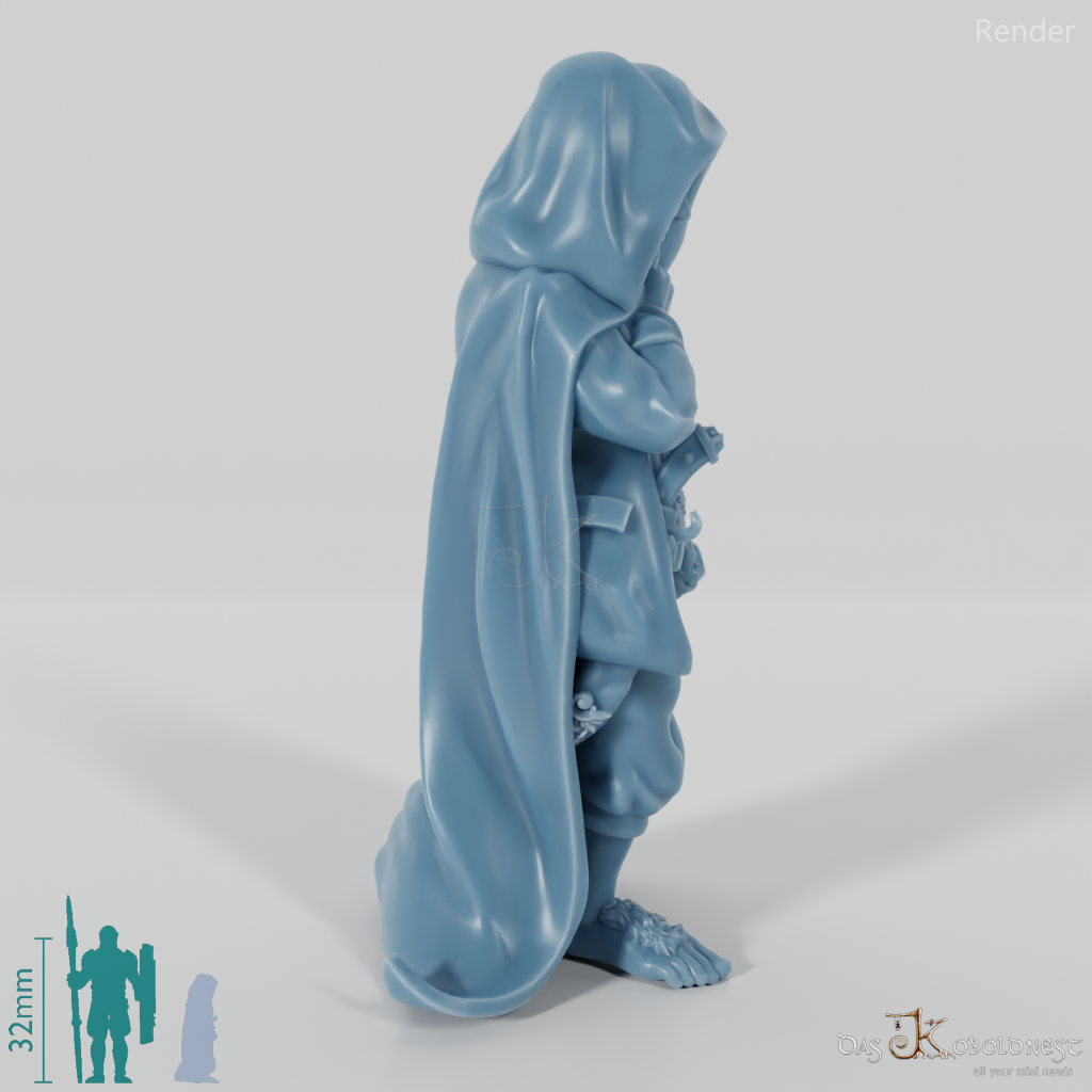 Halbling mit ins Gesicht gezogener Kapuze, der mit der Hand an eine Kette um seinen Hals fasst