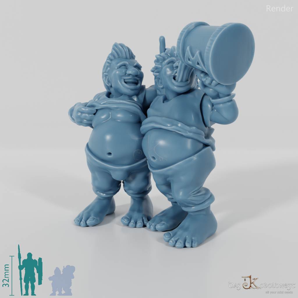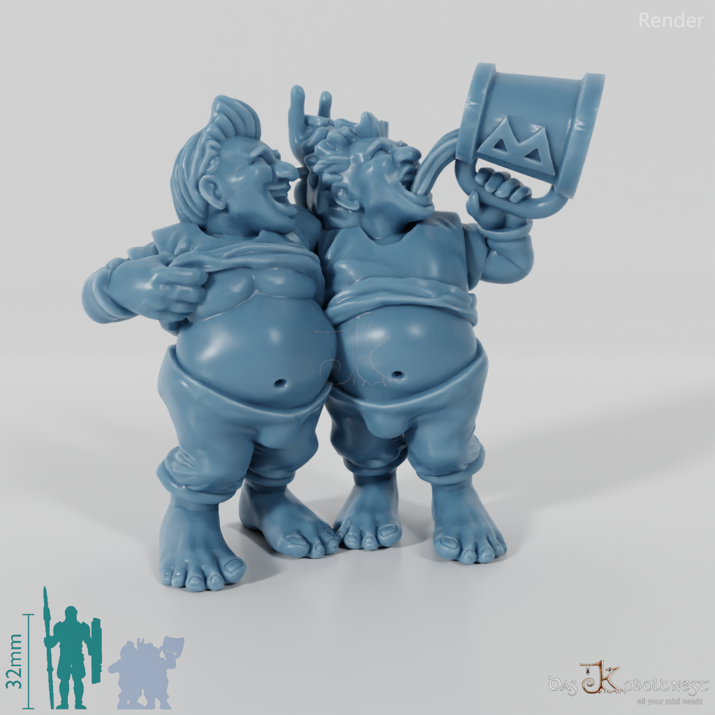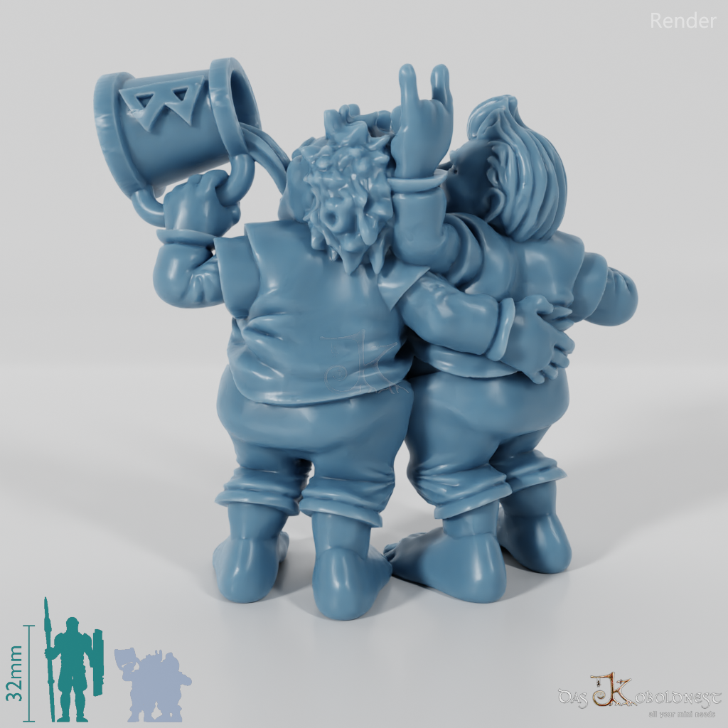 Zwei Halblinge, Arm in Arm, mit hochgezogenen Oberteilen. Ein Halbling trinkt aus einem riesigen Bierkrug, während der andere ihm mit der Hand Hörner hinter dem Kopf zeigt.