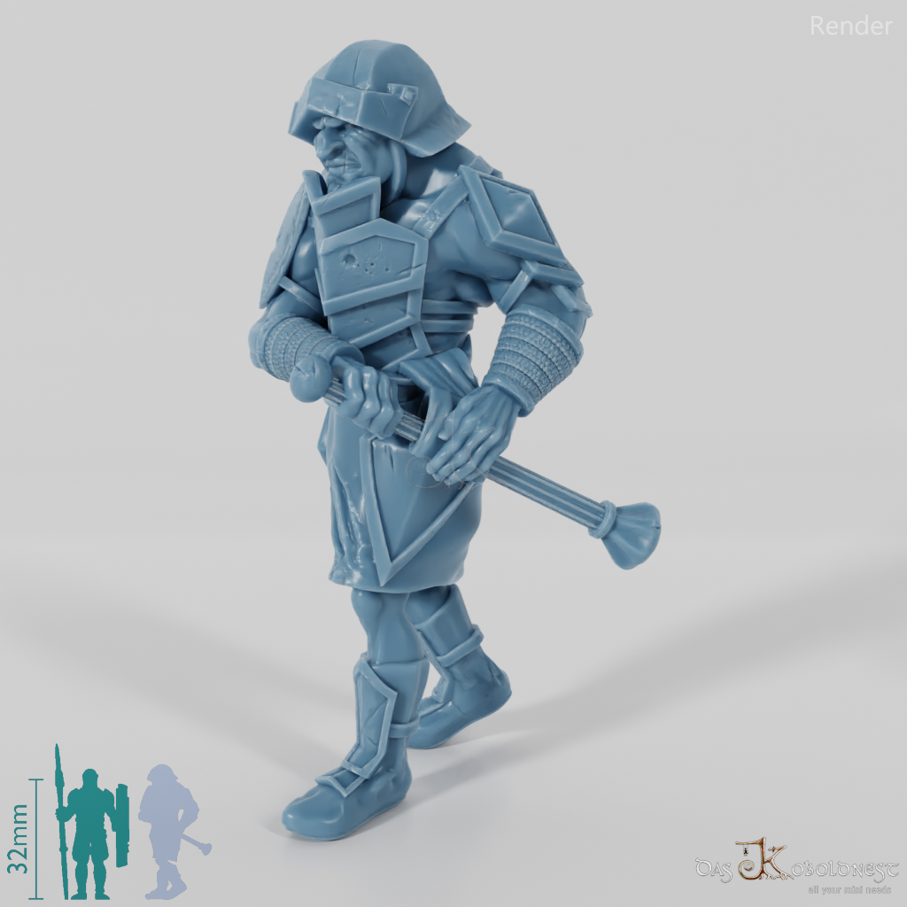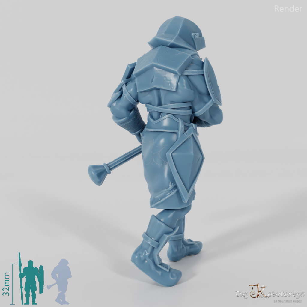 Schwer gerüsteter Halbork mit Plattenhelm, der einen Streitkolben zieht