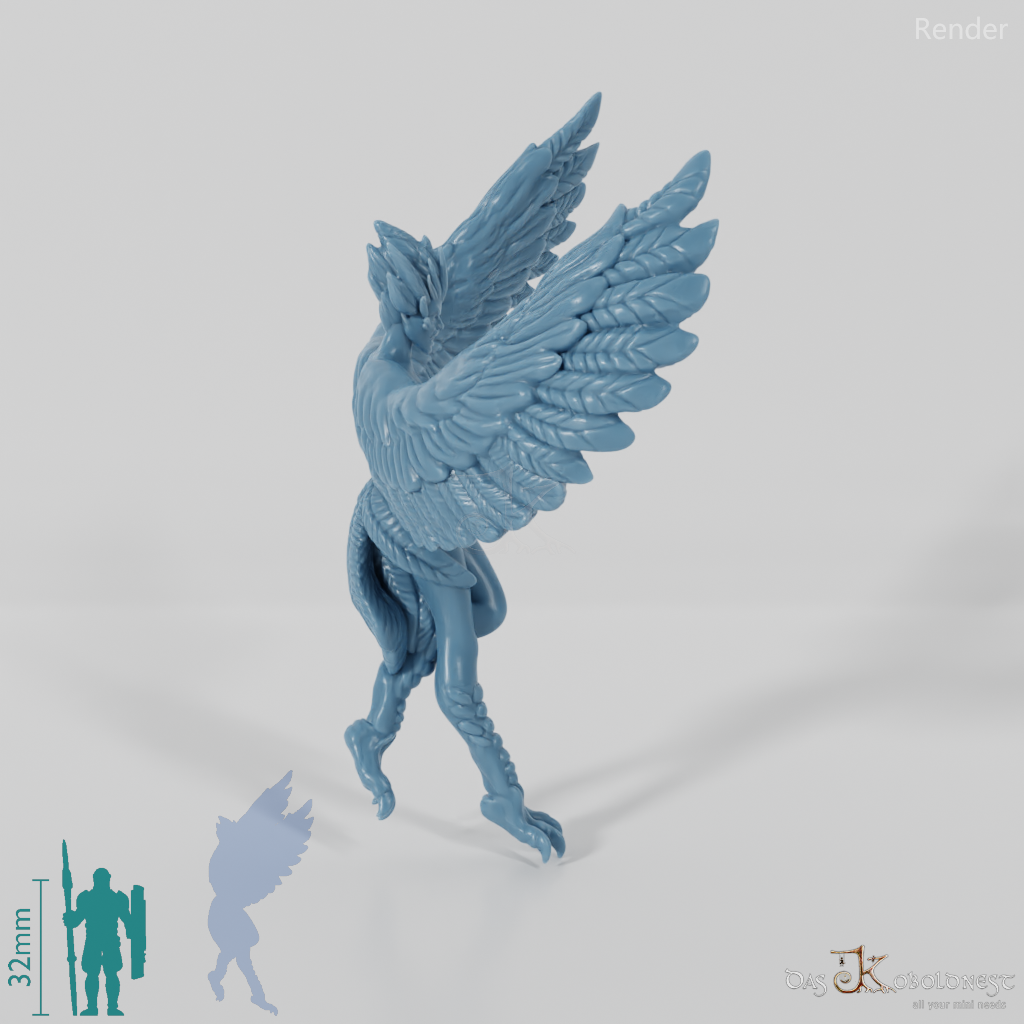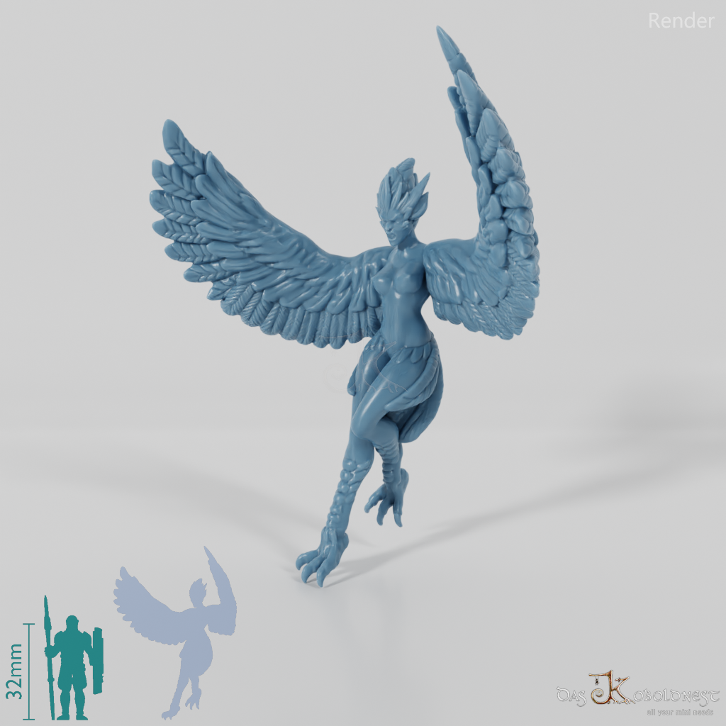Hybridwesen aus Frau und Vogel, das mit ausgestreckten Krallenbeinen zur Landung ansetzt