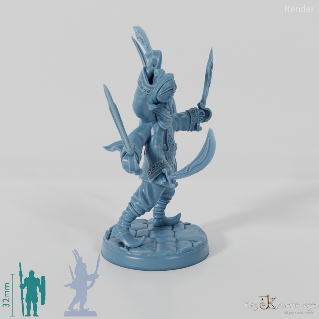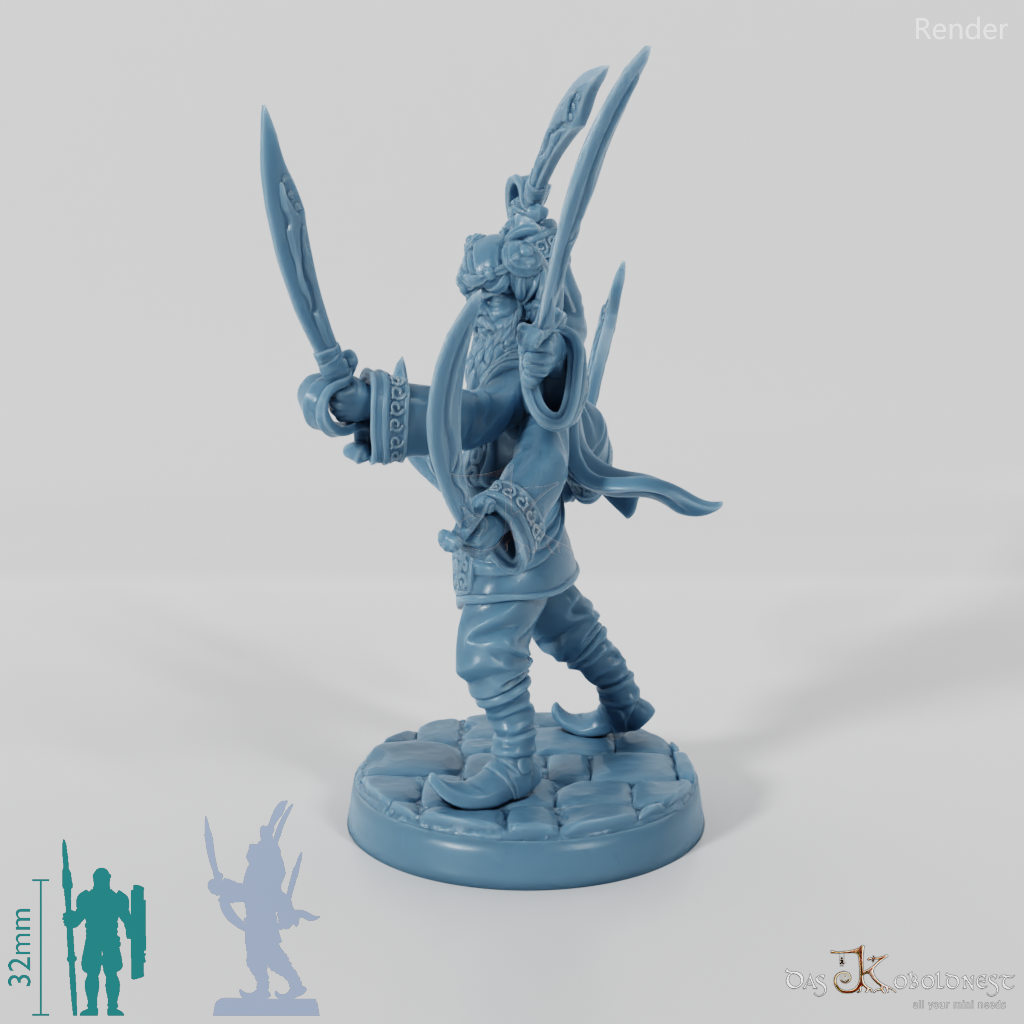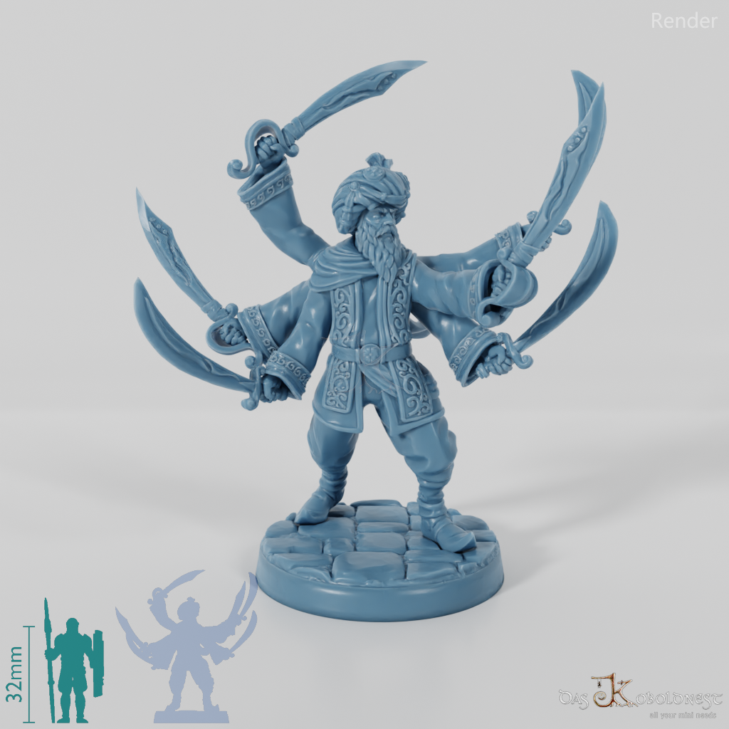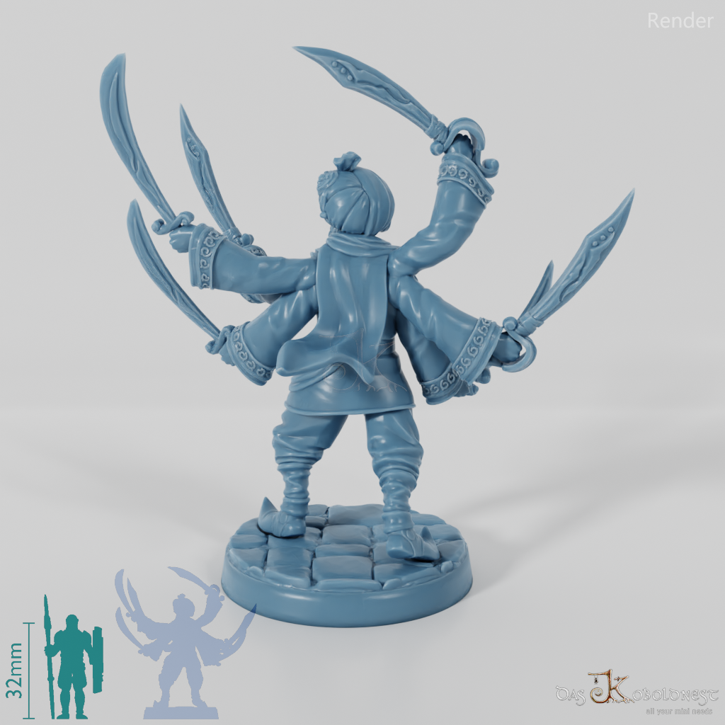 Sechsarmiger Mann mit langem Bart, Turban und edler Kleidung, der mit sechs Säbeln bewaffnet ist
