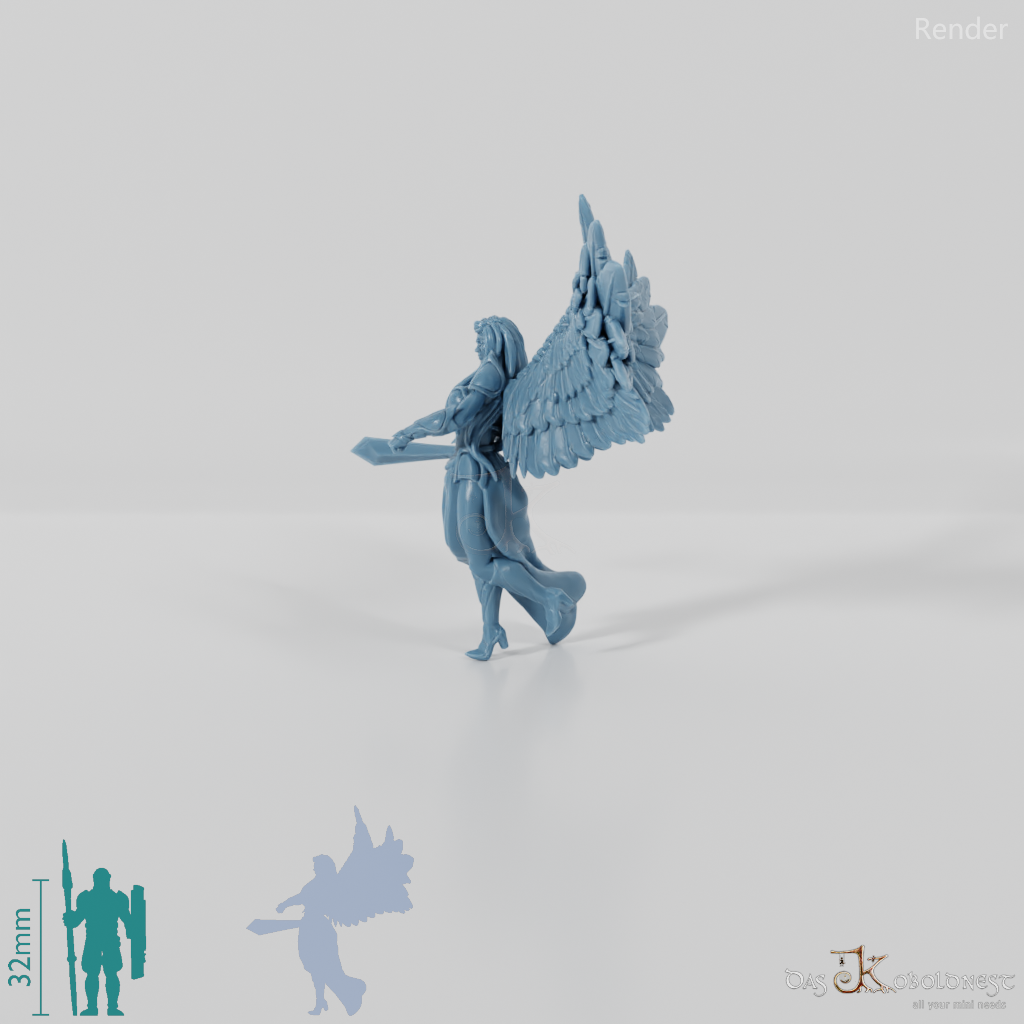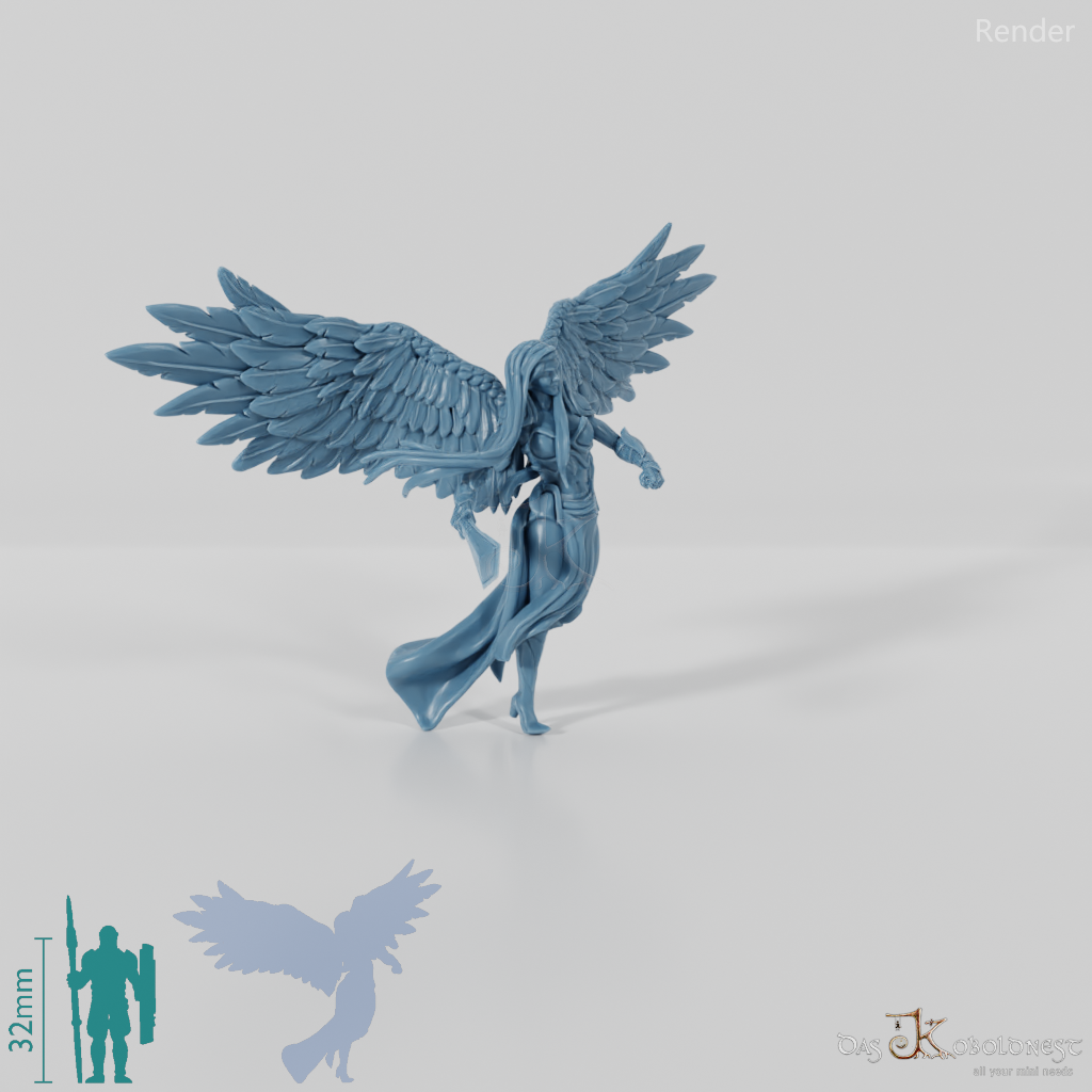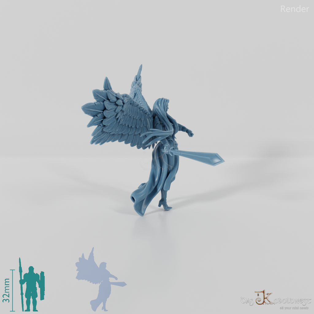 Weiblicher Engel mit ausgebreiteten Schwingen und Schwert