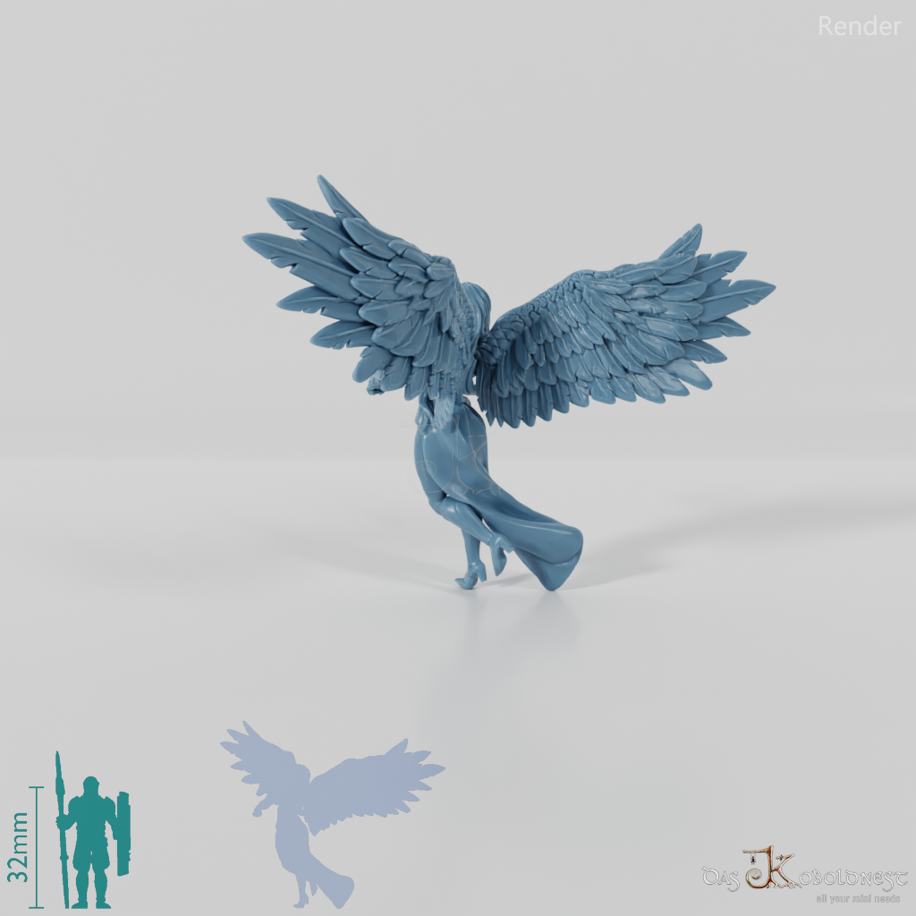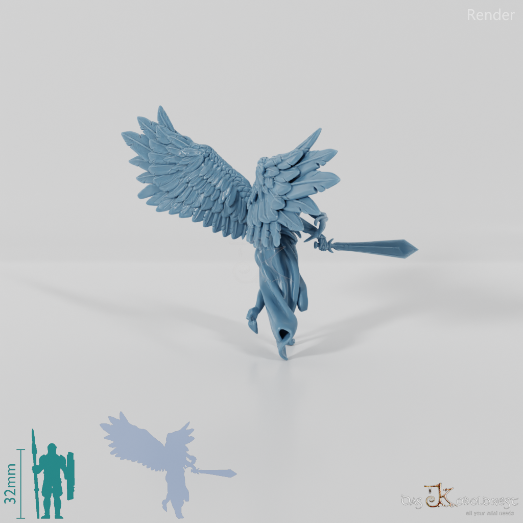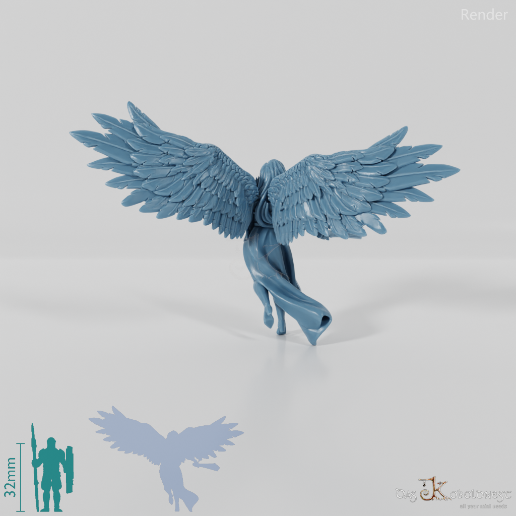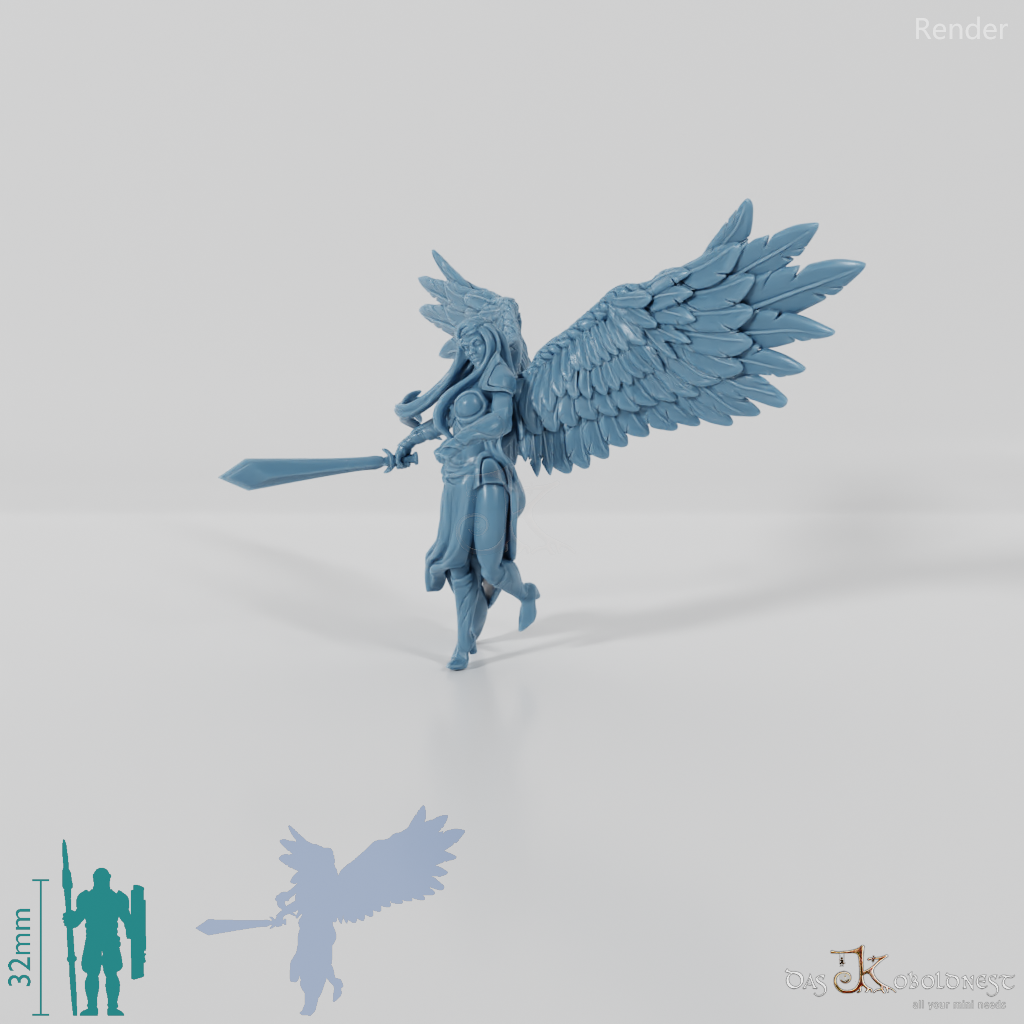 Weiblicher Engel mit ausgebreiteten Schwingen und Schwert