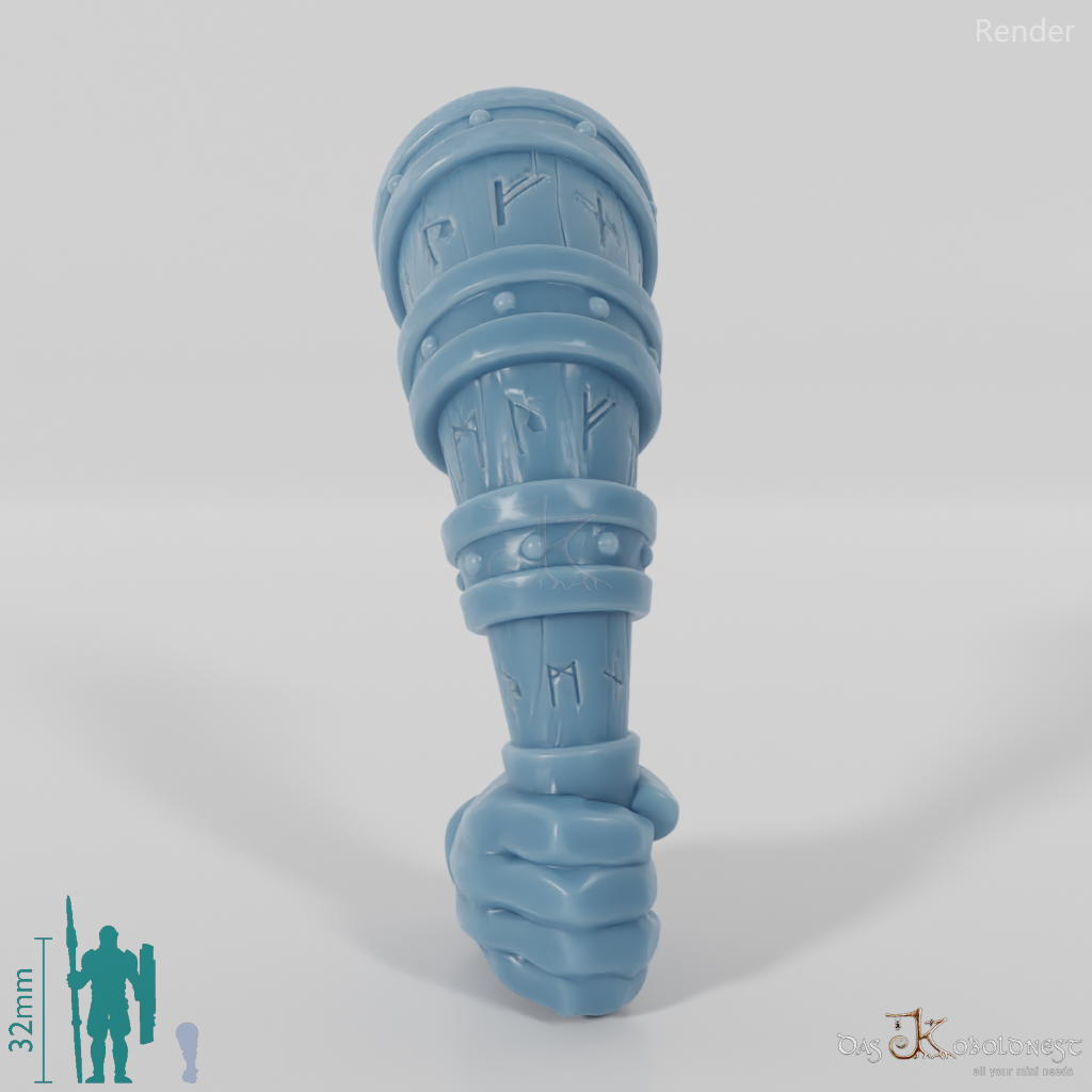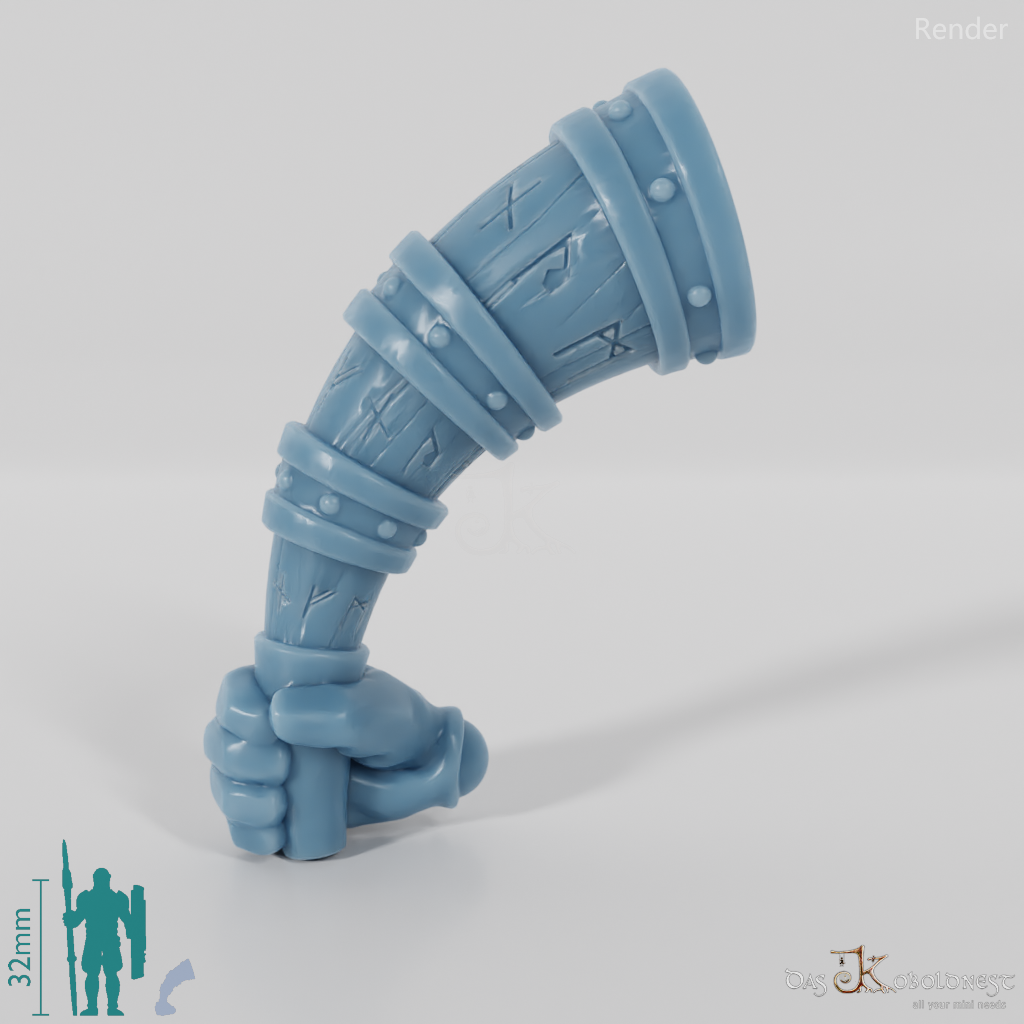 Metallbeschlagenes Horn, das von einer behandschuhten Hand gehalten wird. Das Modell kann beliebig mit den Modellen der Reihe "Zusammenruf der Zwerge" kombiniert werden. Im Customizer von The Printing Goes Ever On kannst du dir selbst eine Vorschau deiner modularen Zwerge erstellen und die perfekten Kombinationen für dich finden. Modell wahlweise mit rechter oder linker Hand an der Waffe verfügbar.
