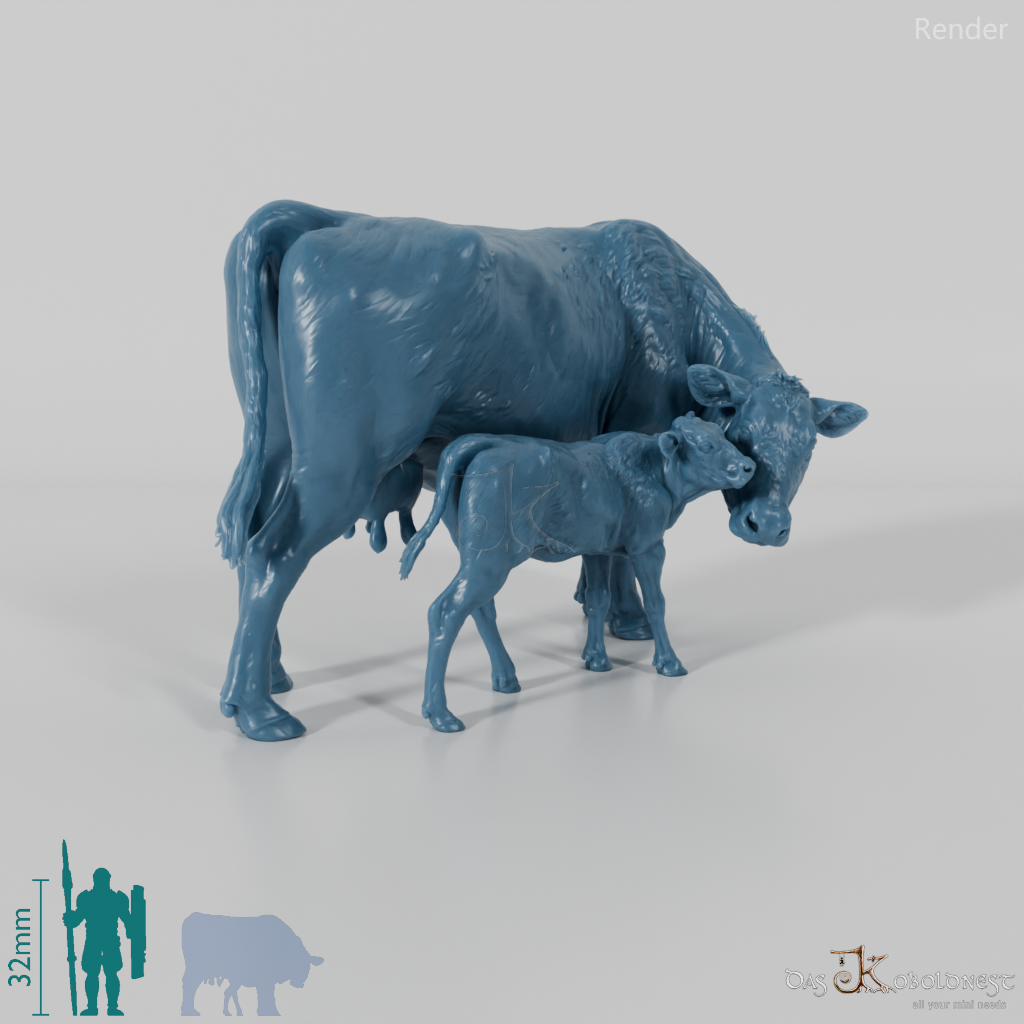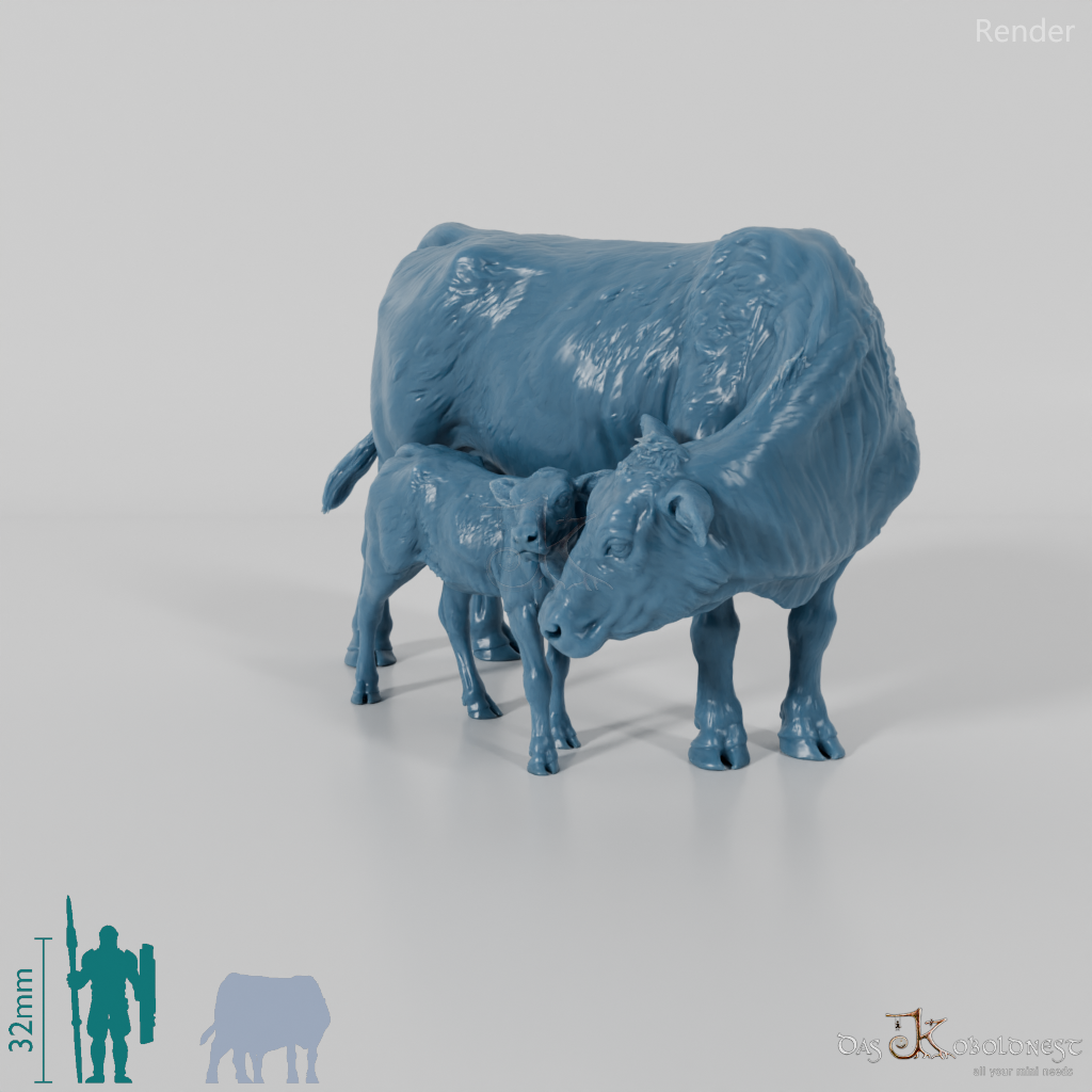 Lebensgetreue Nachbildung einer North Devon Kuh mit ihrem Kalb (Bos taurus)