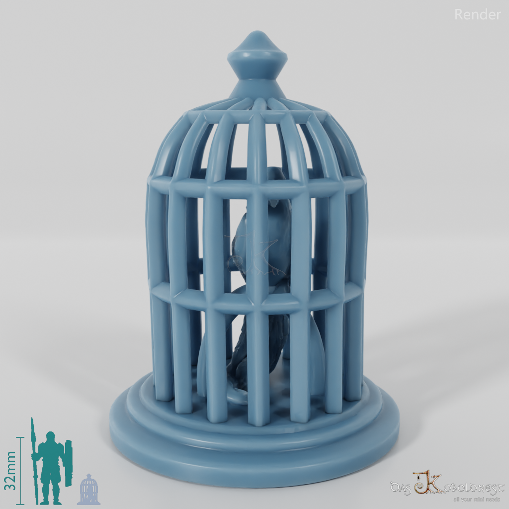 Runder Käfig, in dem ein kleiner Papageienvogel auf einer Sitzstange hockt