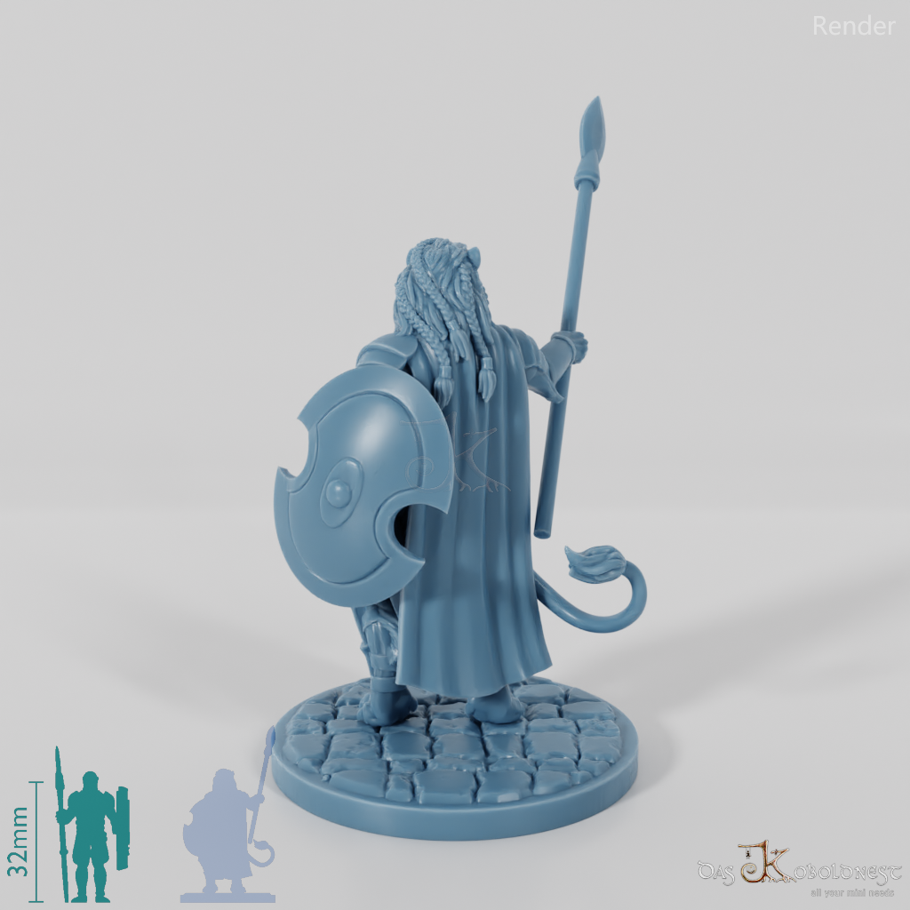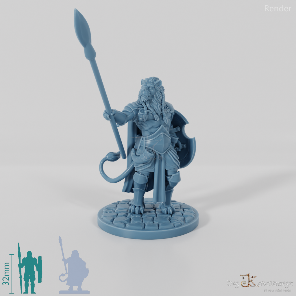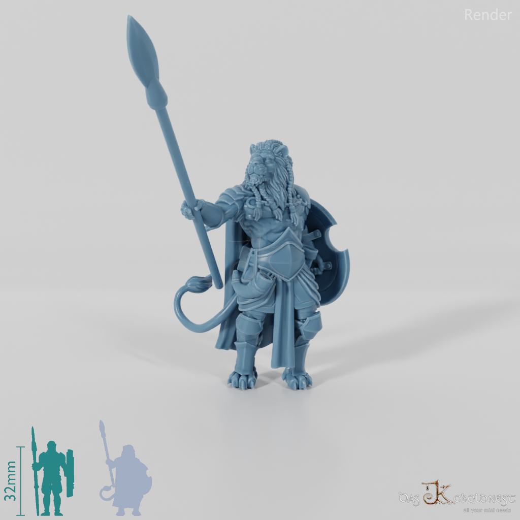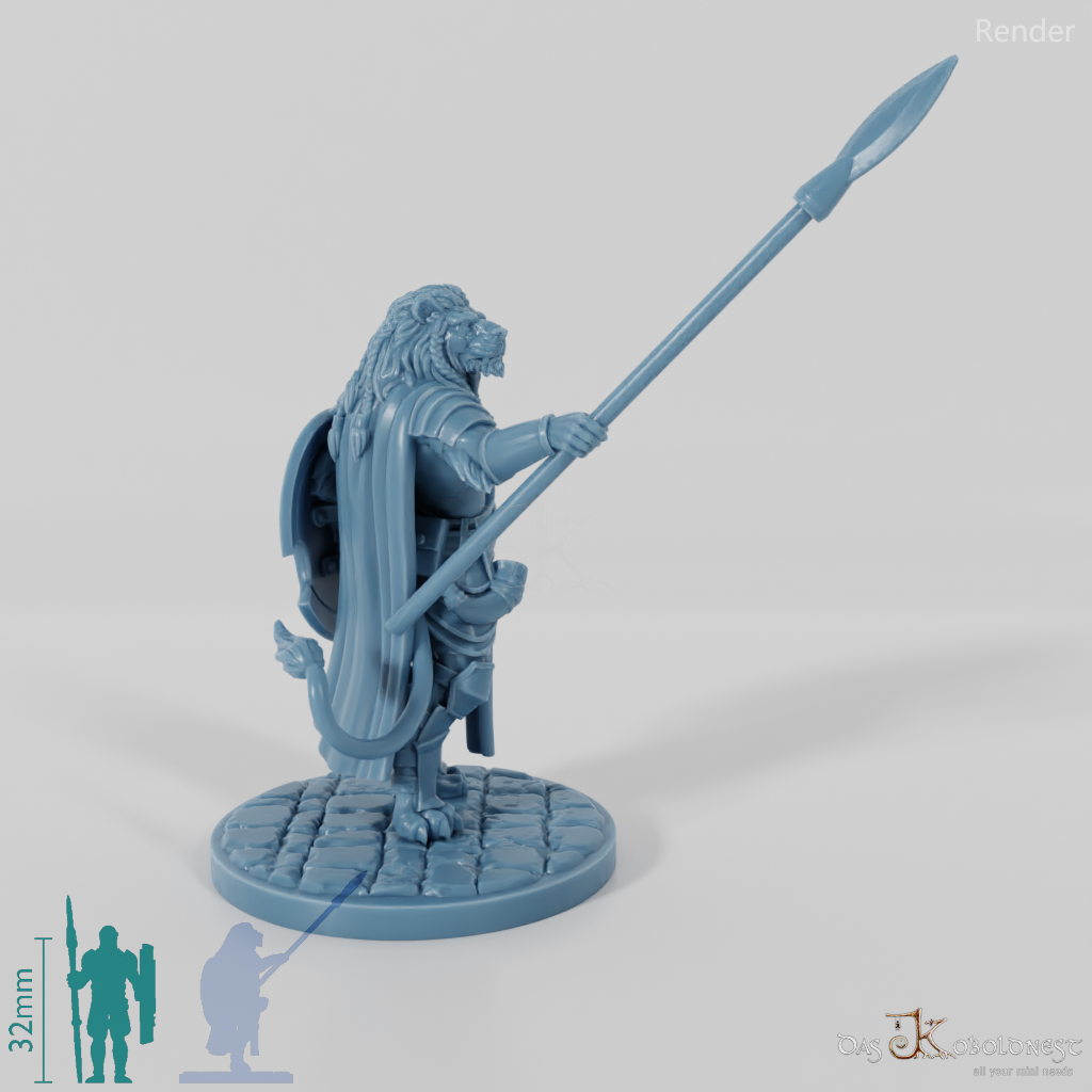 Löwenmensch mit geflochtener Mähne, der mit Plattenrüstung, Speer und Schild ausgestattet ist Modell wahlweise mit oder ohne gestaltete 25mm-Base verfügbar.