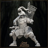 Kriegerin mit wehenden Zöpfen, Lamellenpanzer und Flügelhelm, die mit Hammer und Schild bewaffnet ist und ein Schwert am Gürtel trägt