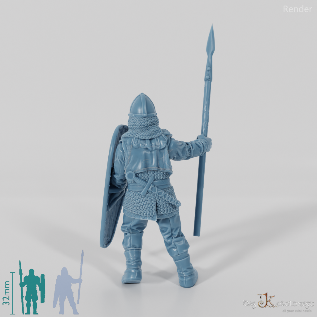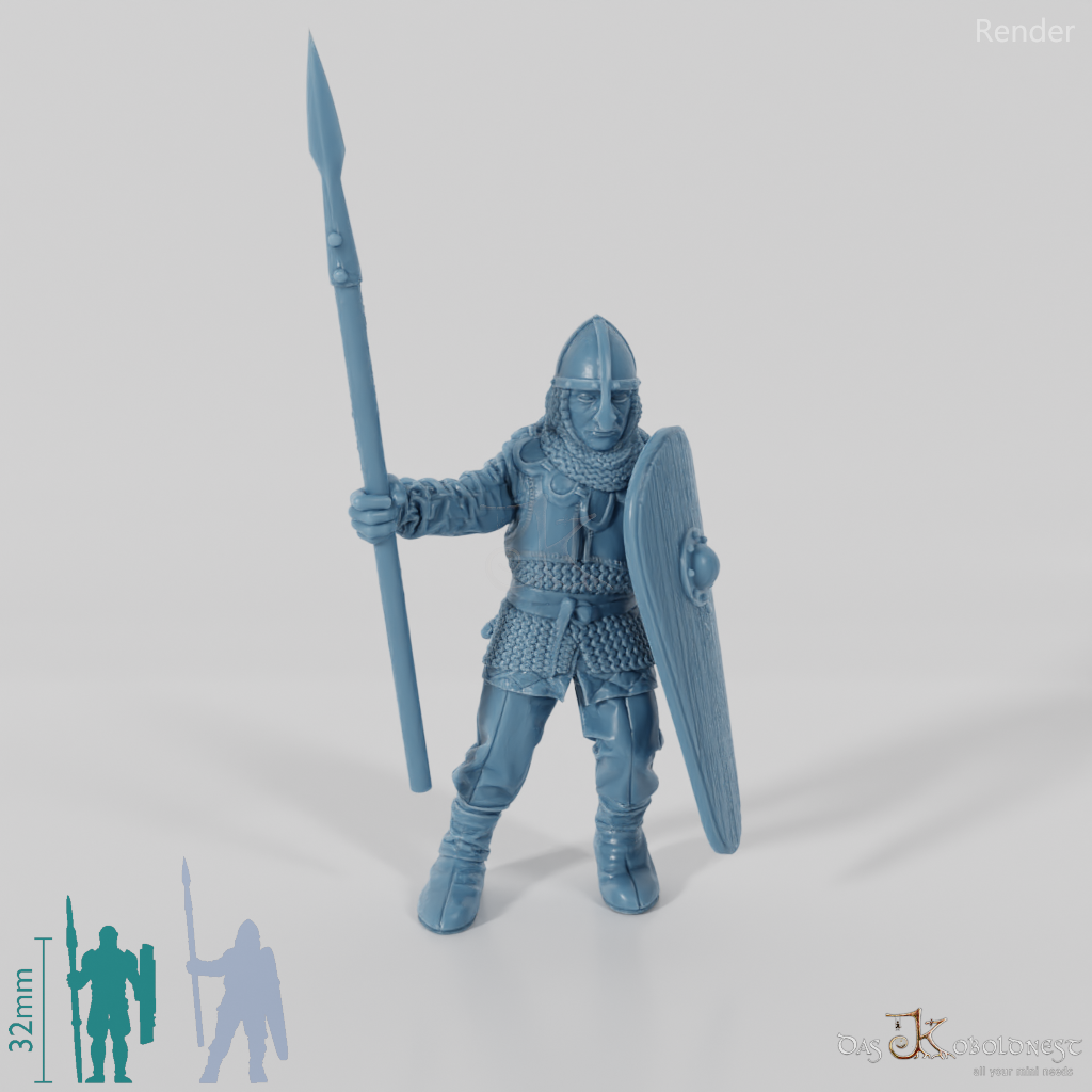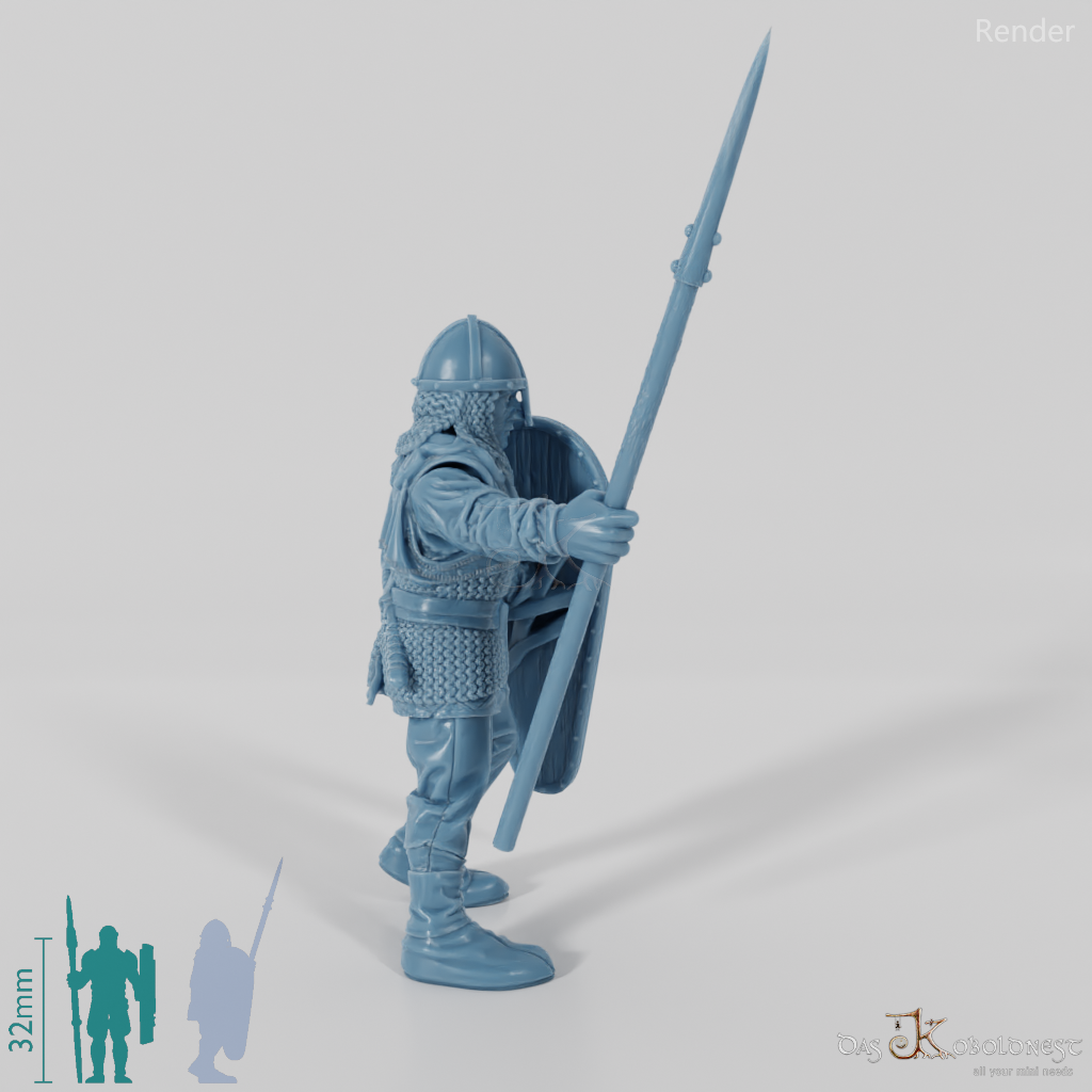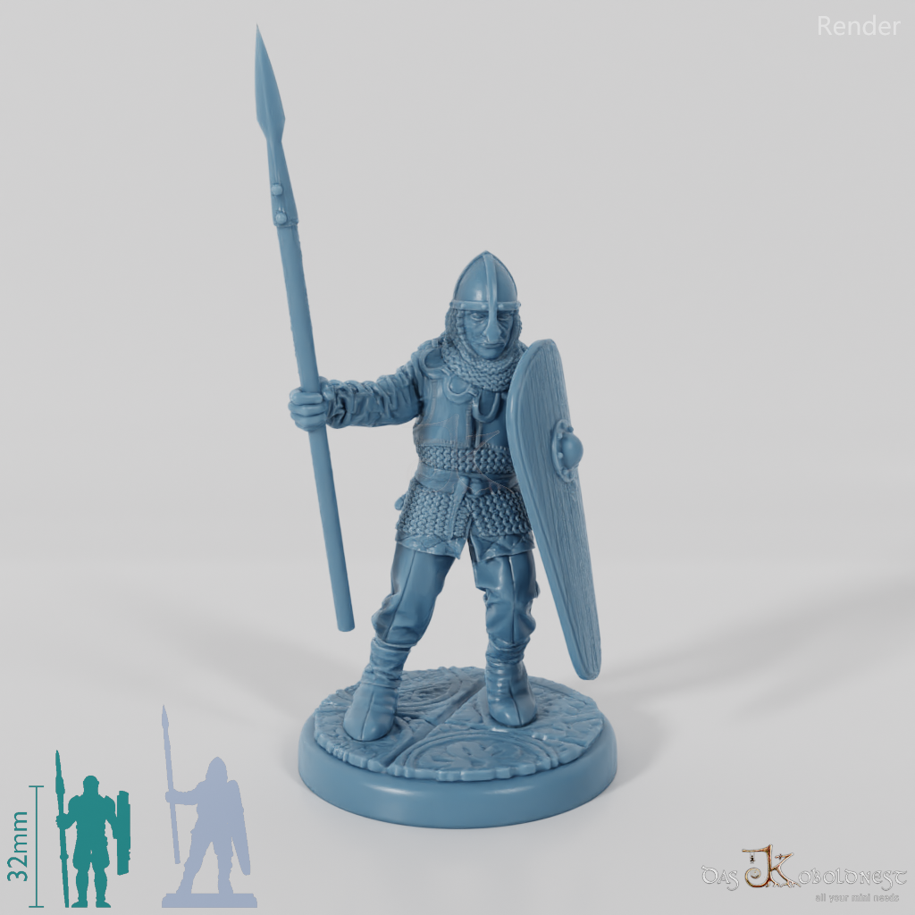 Englischer Soldat in leichter Rüstung, der mit Speer und Schild bewaffnet ist. Die Waffen werden als separate Einzelteile geliefert und können beliebig positioniert oder mit anderen Angelsachsen von Asgard Rising kombiniert werden.