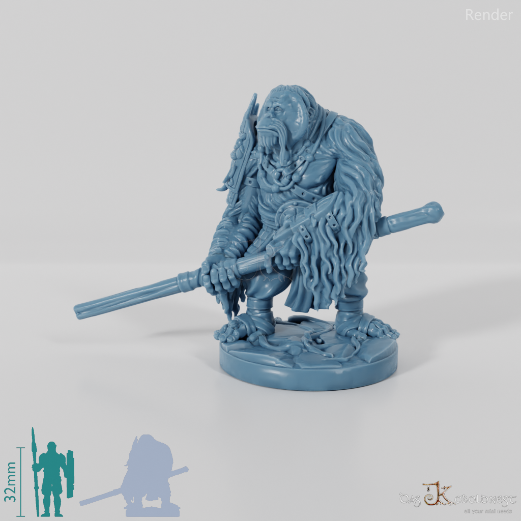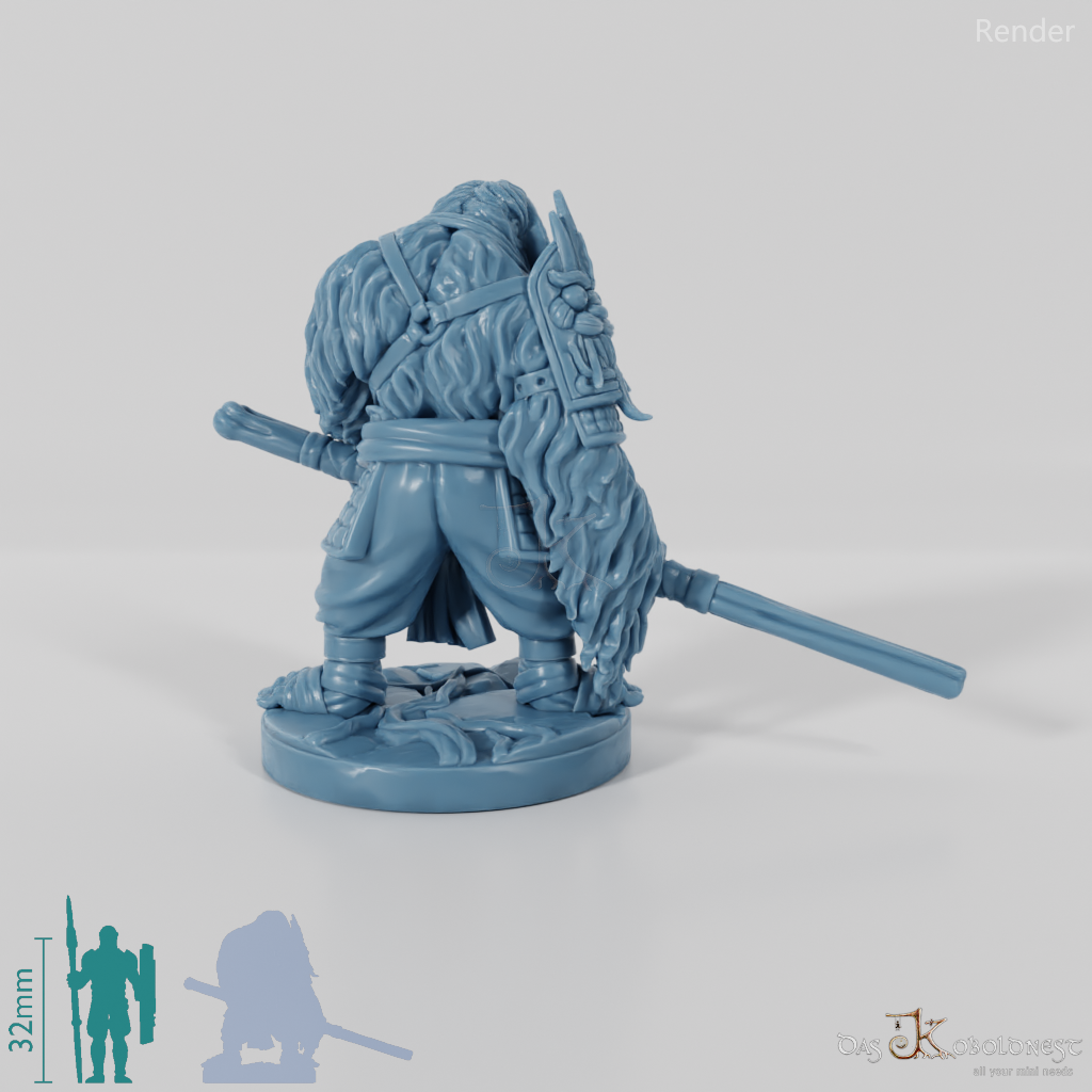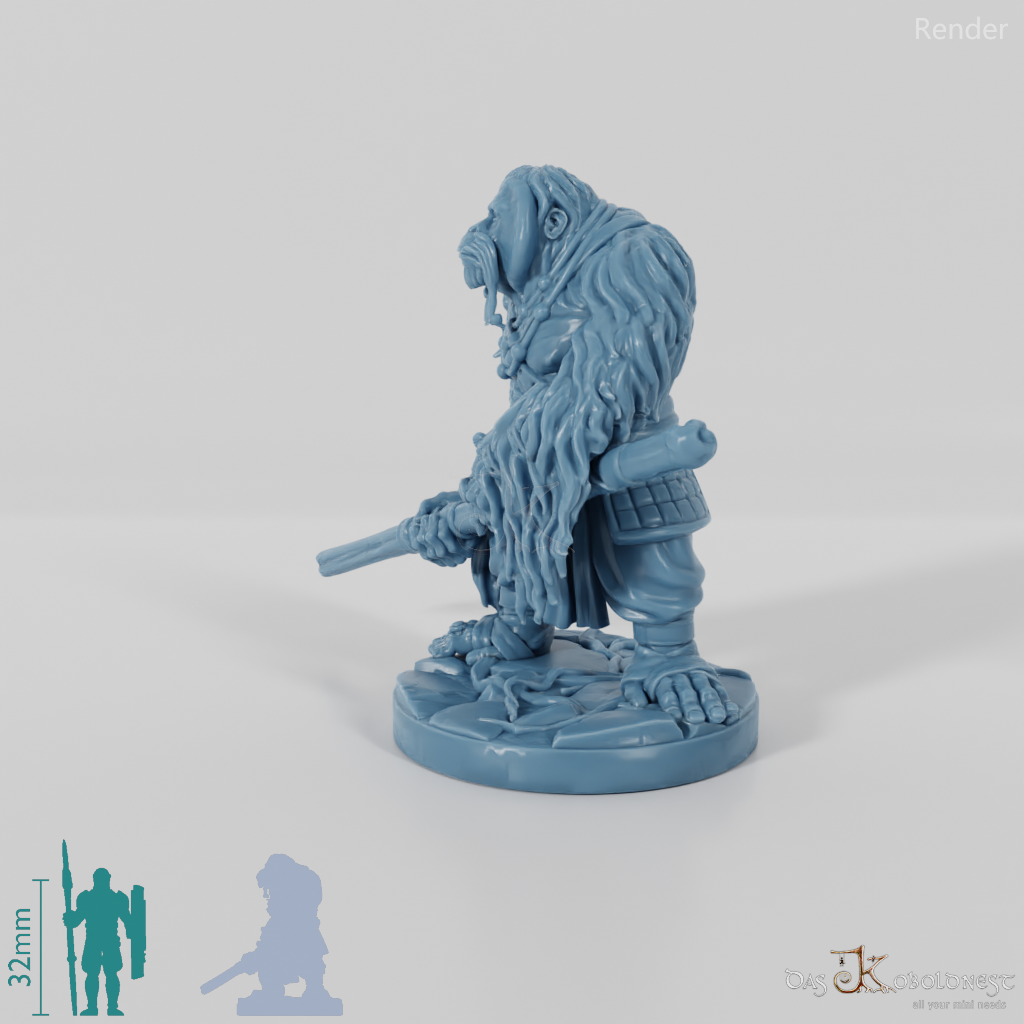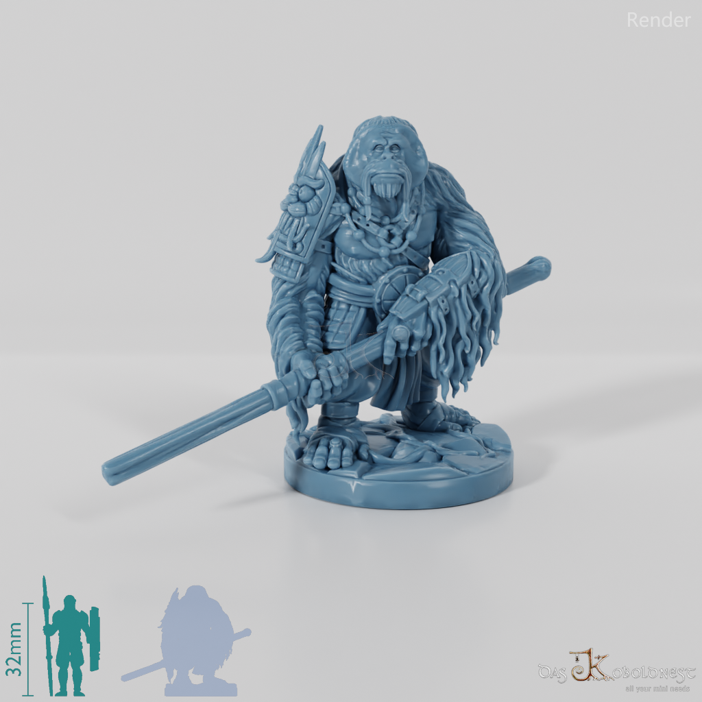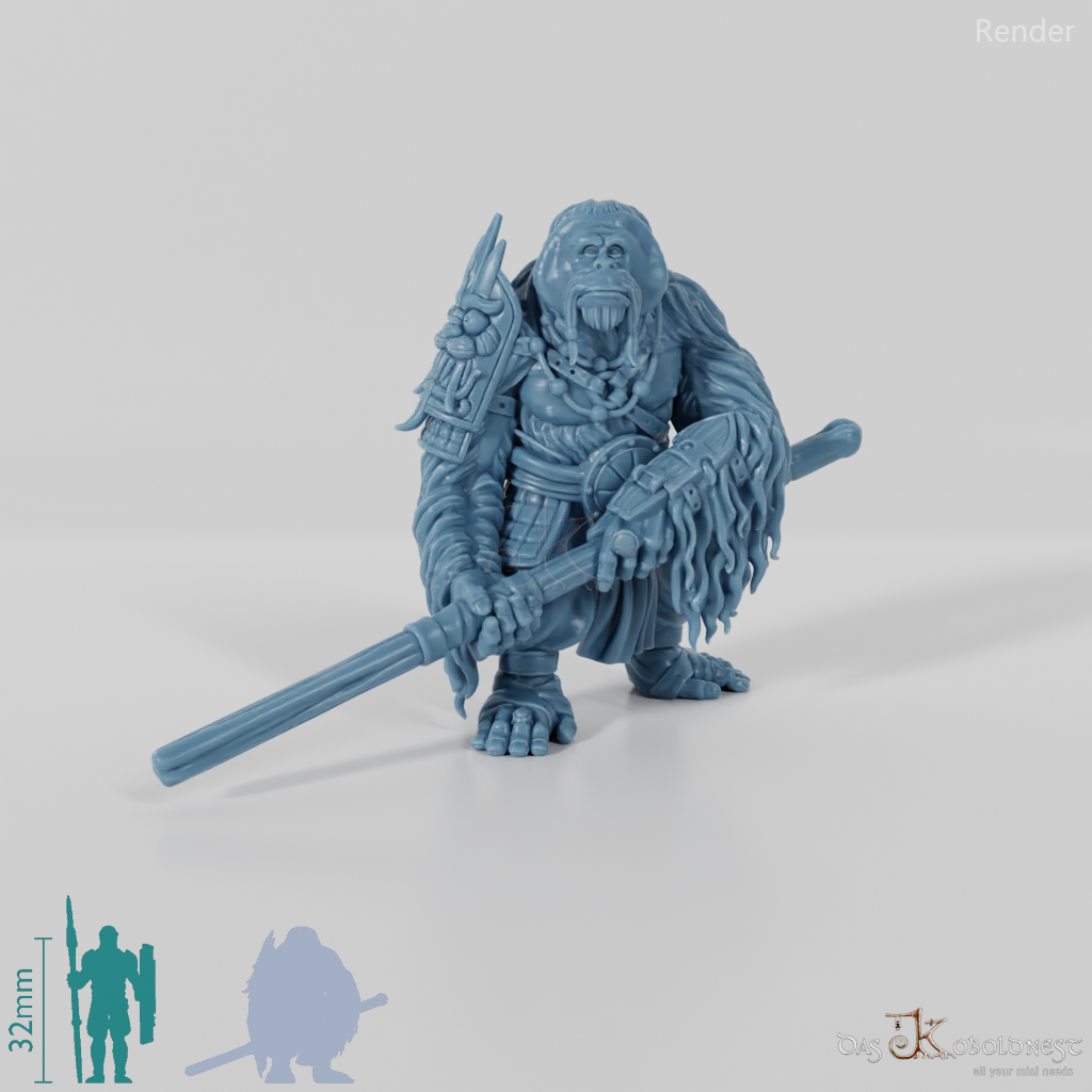 Humanoider Orang-Utan, der mit einseitiger Schulter- und Unterarmrüstung, sowie einem langen Bo ausgestattet ist Modell wahlweise mit oder ohne gestaltete 25mm-Base verfügbar.