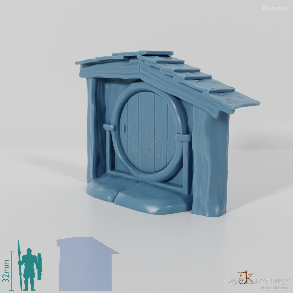 Hausfassade einer Halblinghöhle mit runder Tür und kleinem Vordach