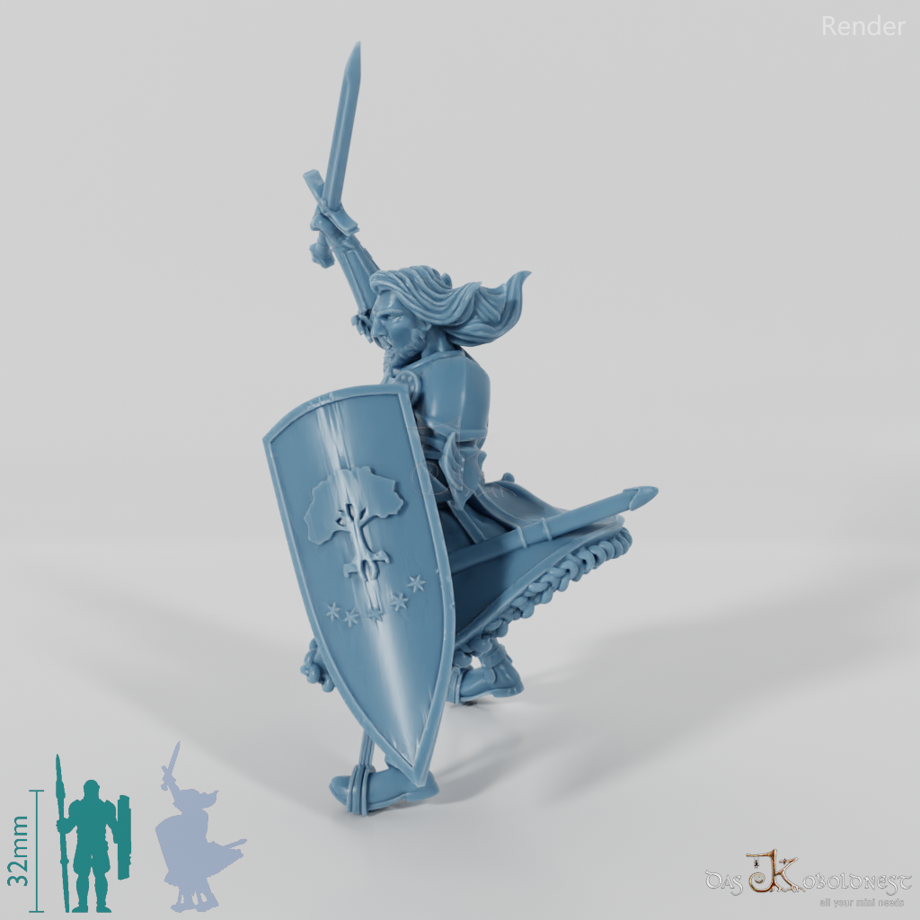 Berittener Heerführer mit wehendem Mantel und Plattenrüstung, der mit Schwert und Schild bewaffnet ist. Pferd separat erhältlich. Modell ist beliebig mit allen Pferden von Gonthan kombinierbar.