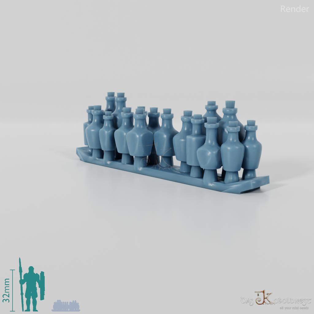 Drei Gruppen mit verschiedenen, verzierten Trankflaschen Die Modelle werden in zusammenhängendem Rahmen geliefert und müssen beispielsweise mit einem Bastelmesser abgetrennt werden. Model by Pellinor1, licensed under CC BY 4.0