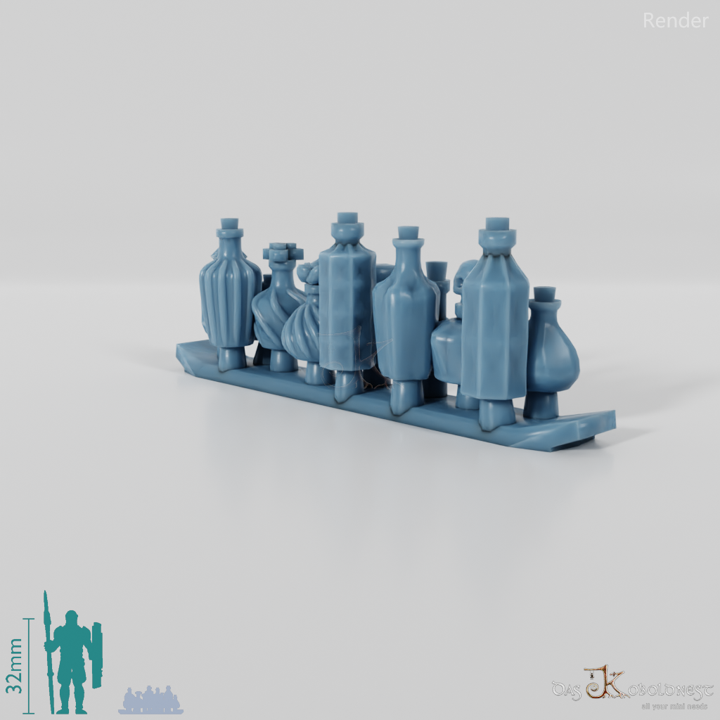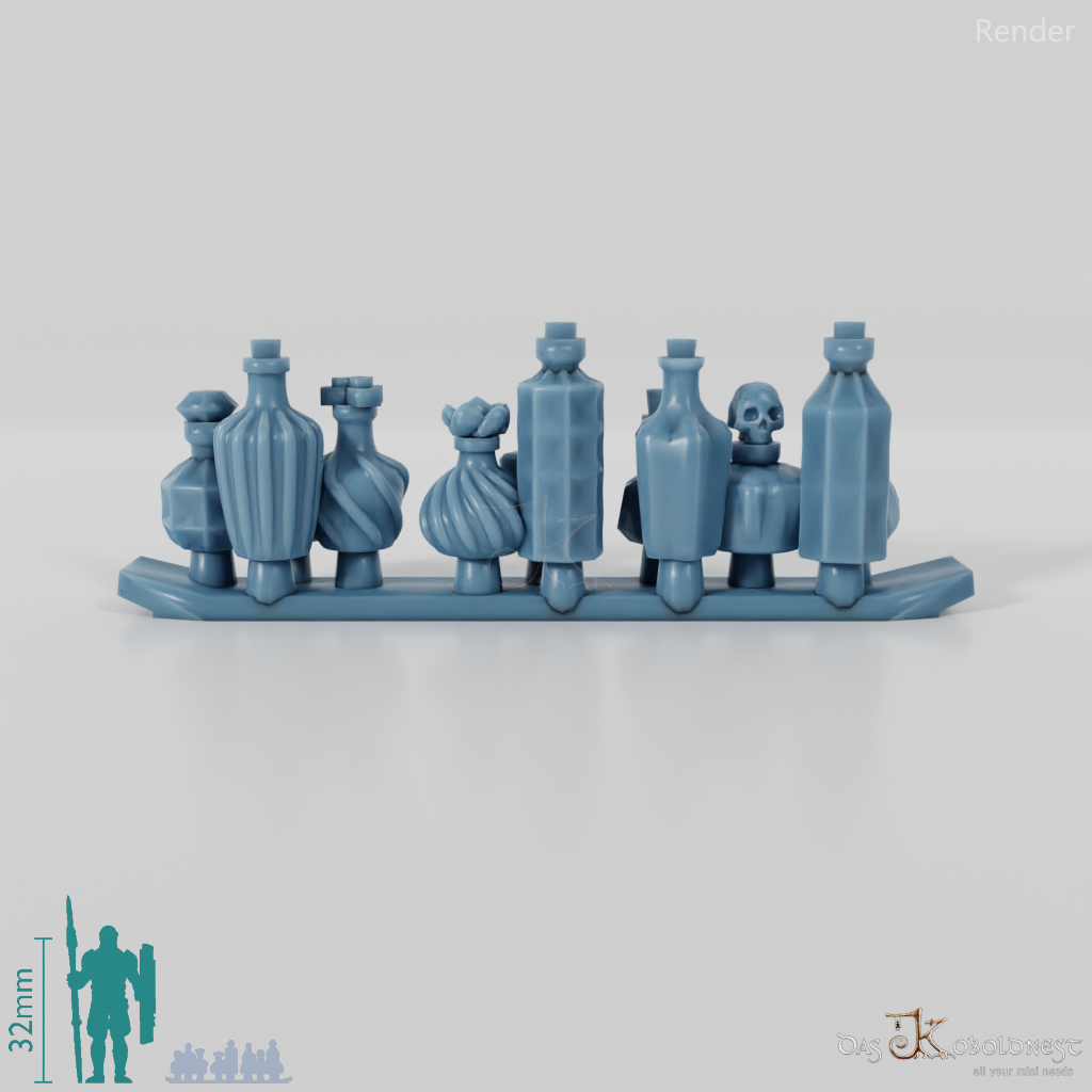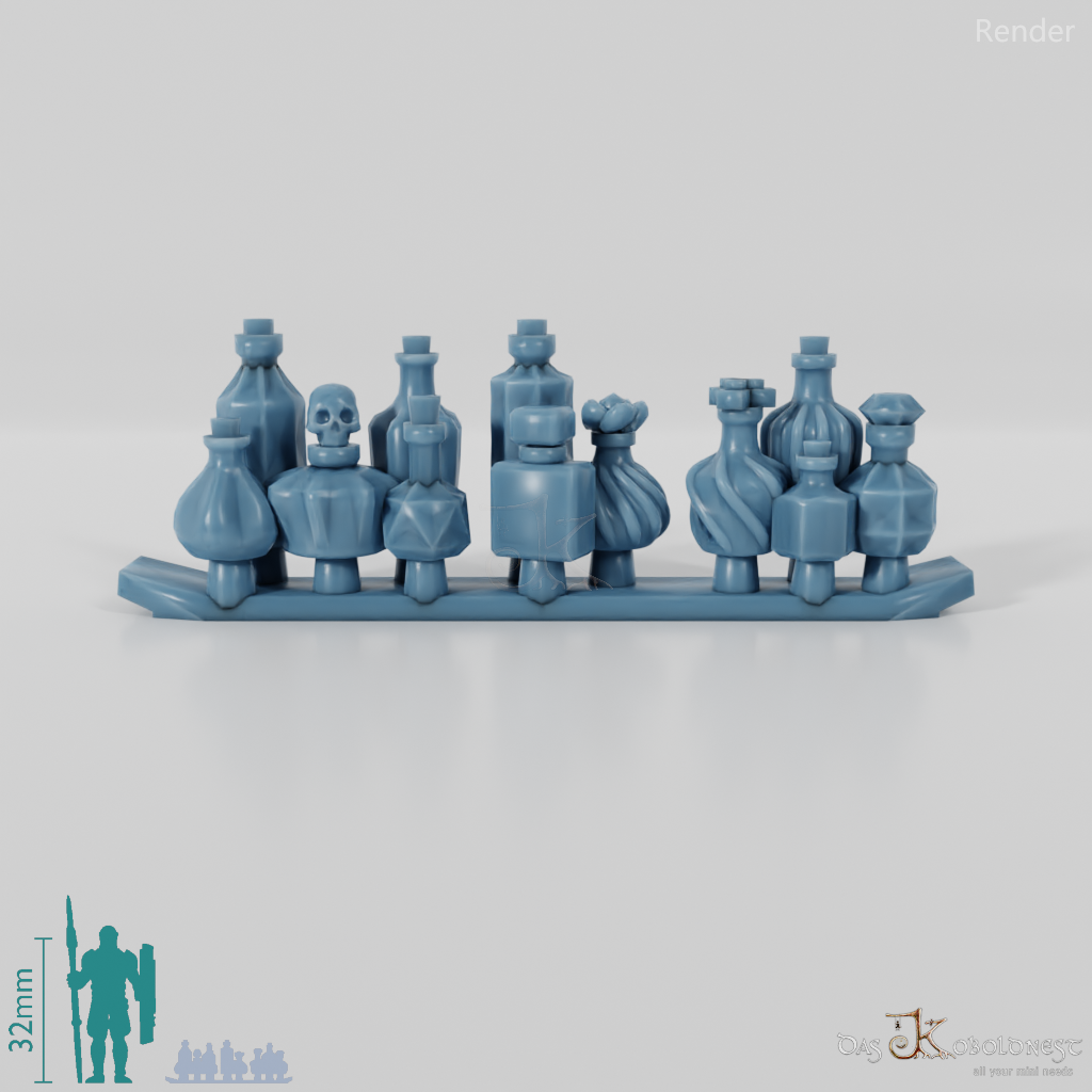 Drei Gruppen mit verschiedenen, verzierten Trankflaschen Die Modelle werden in zusammenhängendem Rahmen geliefert und müssen beispielsweise mit einem Bastelmesser abgetrennt werden. Model by Pellinor1, licensed under CC BY 4.0