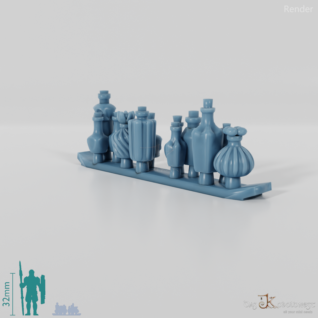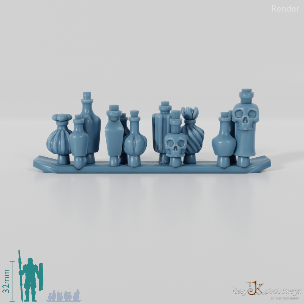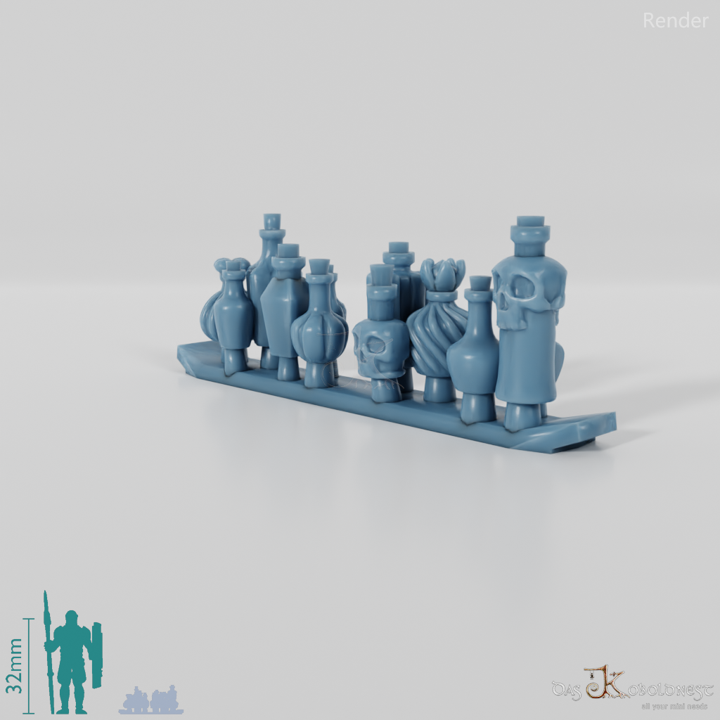 Vier Gruppen mit verschiedenen, verzierten Trankflaschen Die Modelle werden in zusammenhängendem Rahmen geliefert und müssen beispielsweise mit einem Bastelmesser abgetrennt werden. Model by Pellinor1, licensed under CC BY 4.0