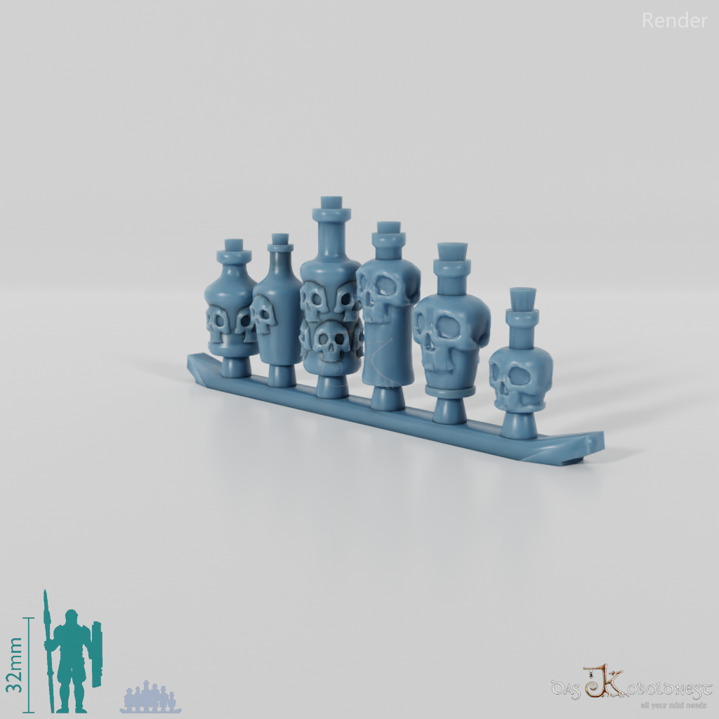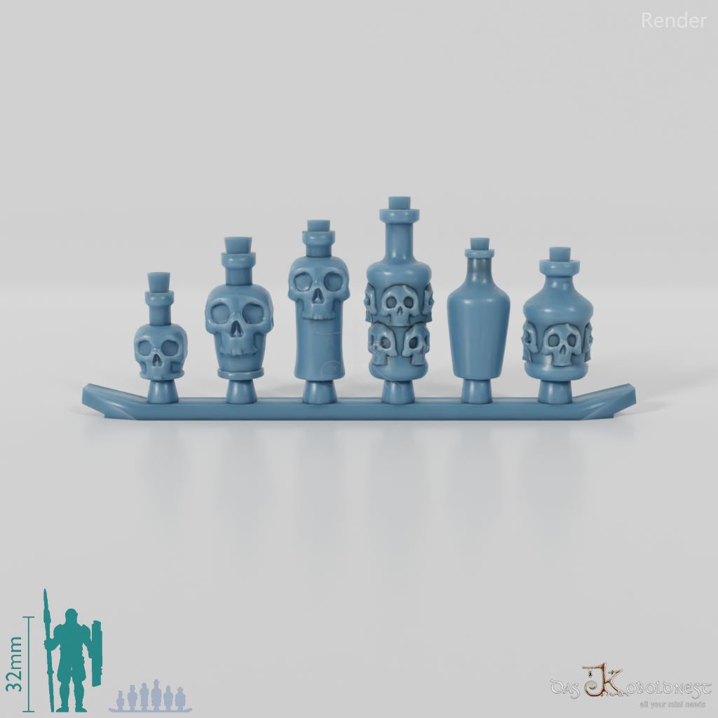 Sechs verschiedene Trankflaschen mit Schädelmotiv Die Modelle werden in zusammenhängendem Rahmen geliefert und müssen beispielsweise mit einem Bastelmesser abgetrennt werden. Model by Pellinor1, licensed under CC BY 4.0