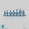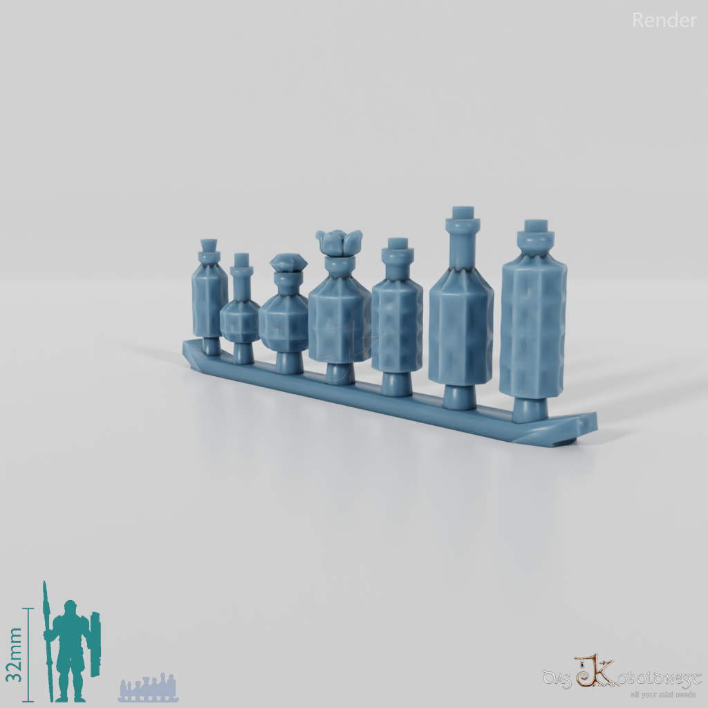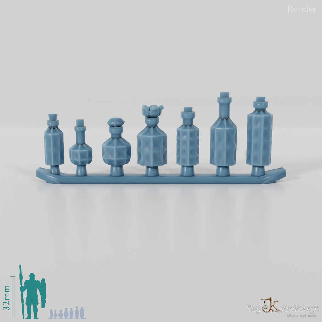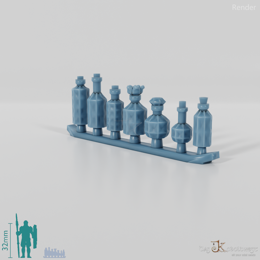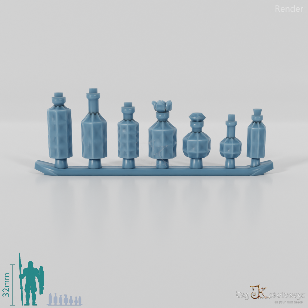 Sieben verschiedene, verkorkte Trankflaschen Die Modelle werden in zusammenhängendem Rahmen geliefert und müssen beispielsweise mit einem Bastelmesser abgetrennt werden. Model by Pellinor1, licensed under CC BY 4.0