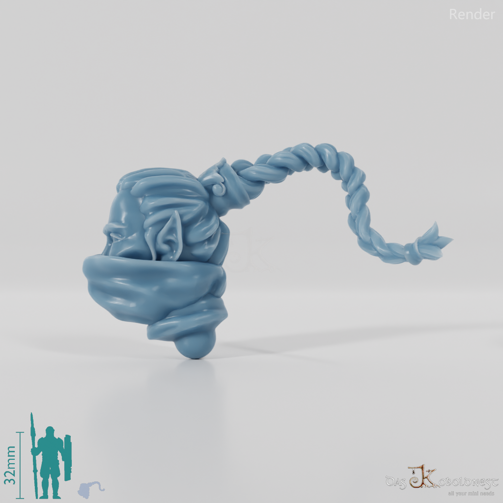 Kopf einer Elfe mit geflochtenem, nach links fallendem Zopf und Stoffmaske vor Mund und Nase. Das Modell kann beliebig mit allen modularen Modellen der Reihe "Die Elfen versammeln sich" kombiniert werden. Originalmodell sowie gespiegeltes Modell verfügbar.
