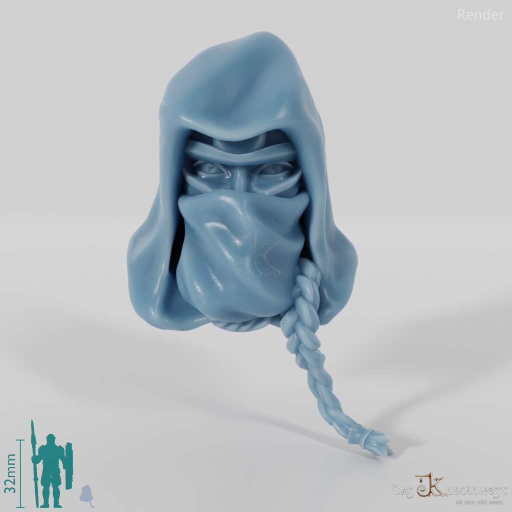 Kopf einer Elfe mit geflochtenem, nach rechts fallendem Zopf und Helm, der unter Kapuze und Maske verborgen ist. Das Modell kann beliebig mit allen modularen Modellen der Reihe "Die Elfen versammeln sich" kombiniert werden. Originalmodell sowie gespiegeltes Modell verfügbar.