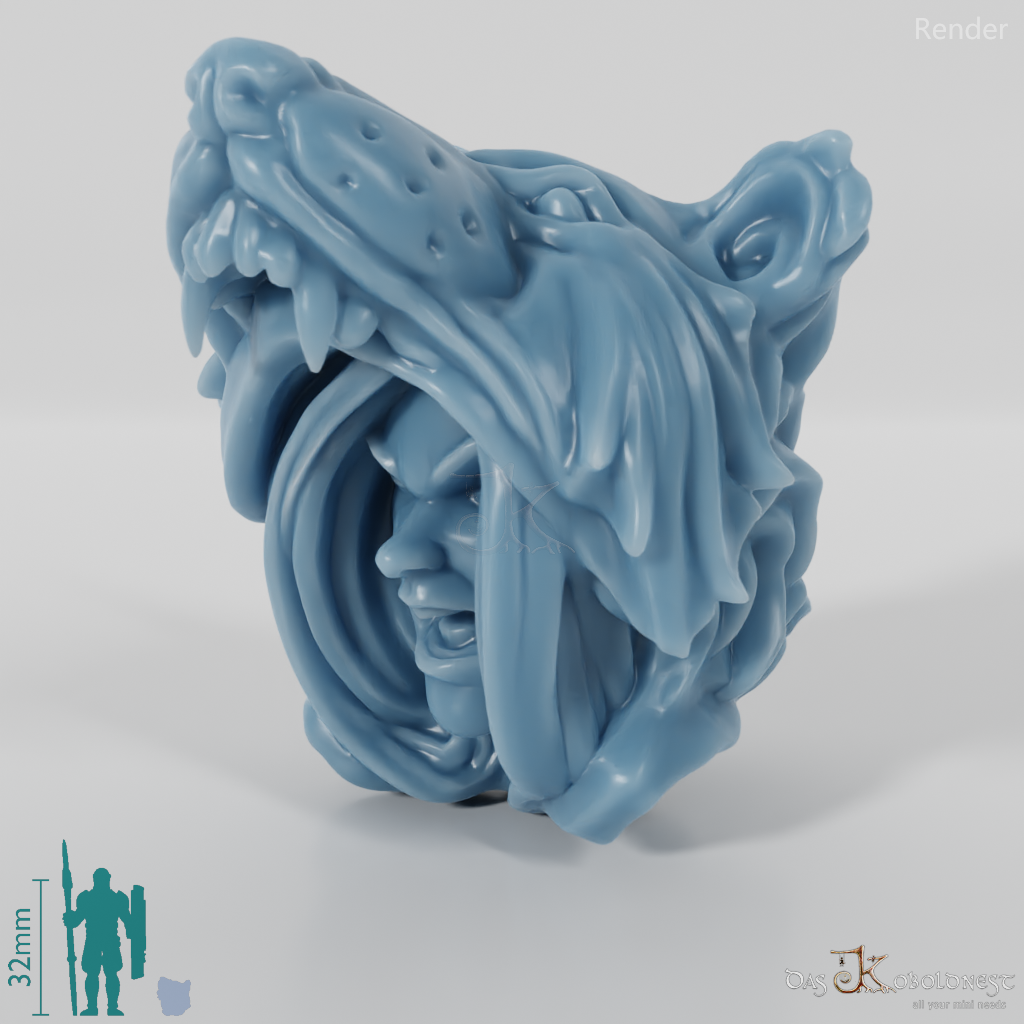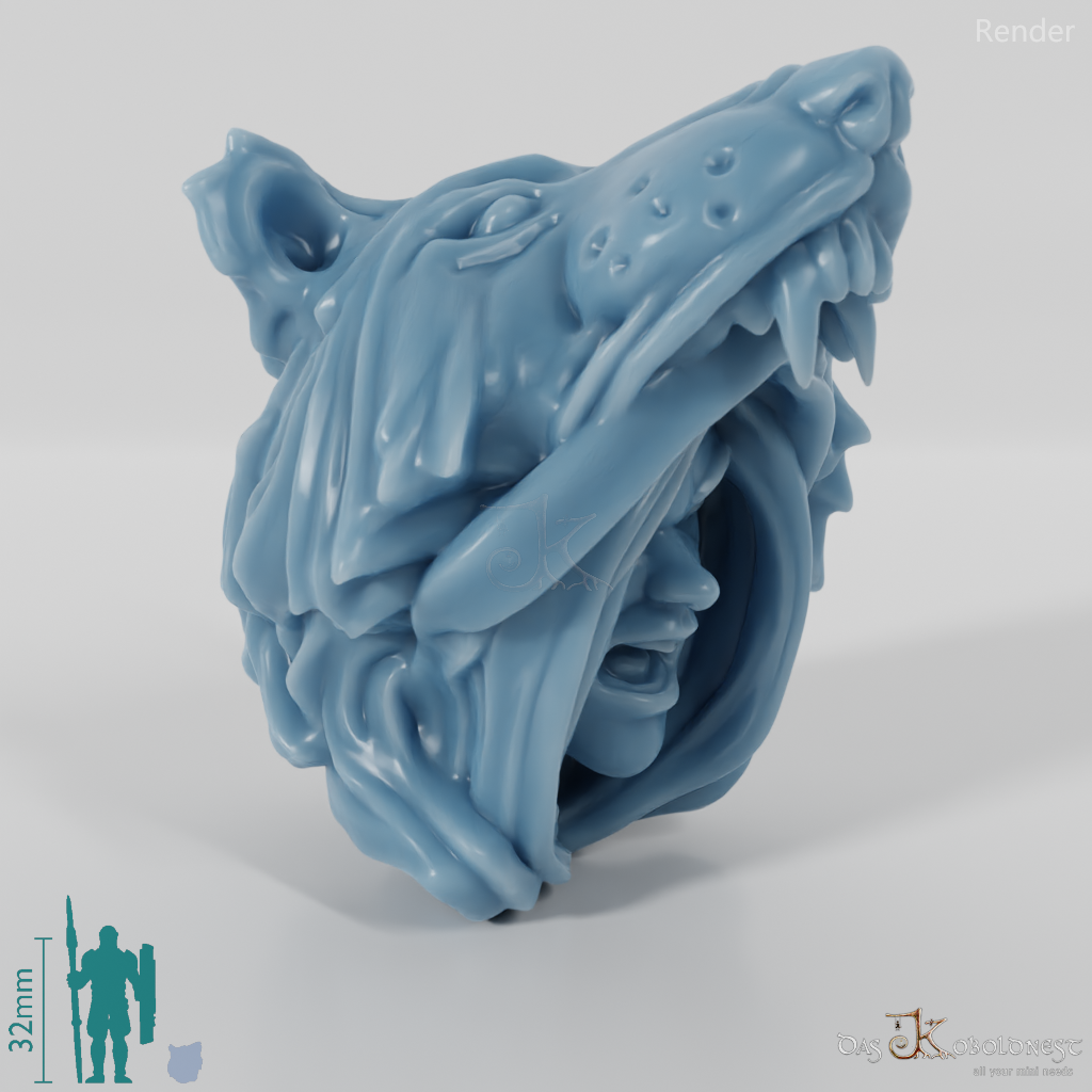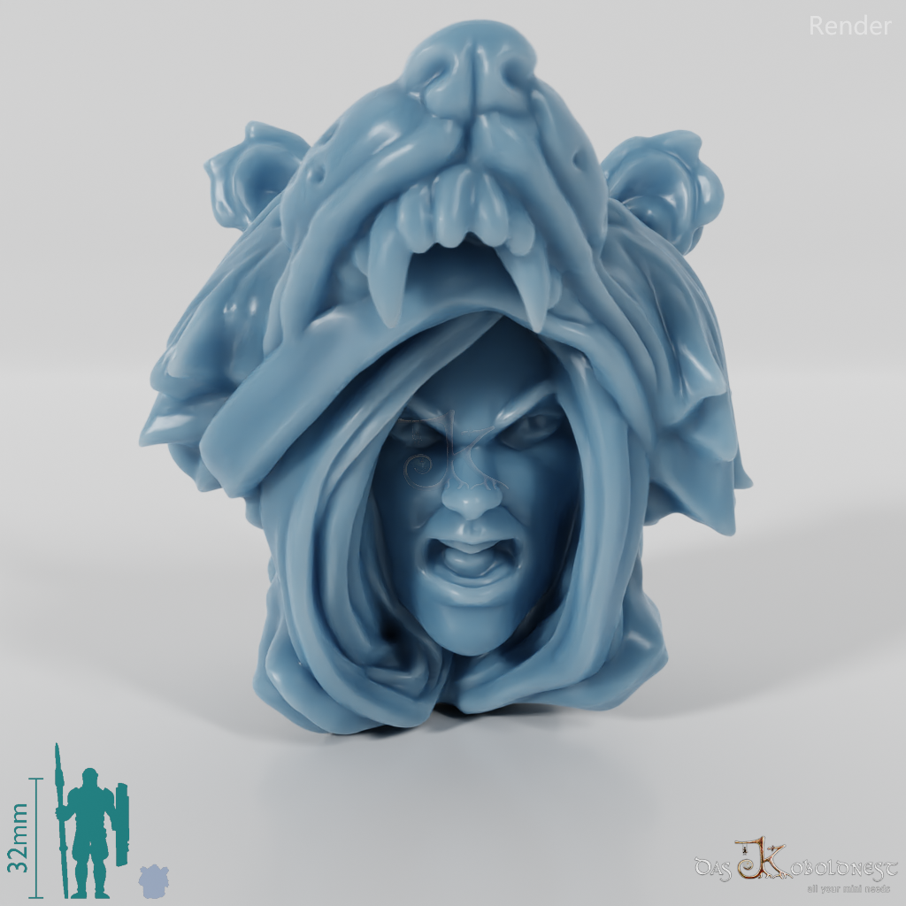 Schreiender Frauenkopf mit schulterlangen Haaren und einem Bärenkopf auf dem Kopf