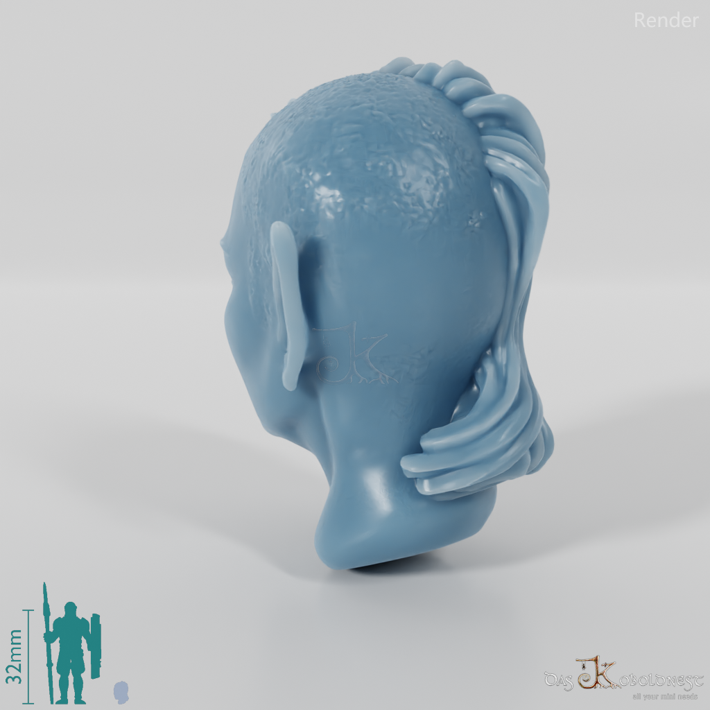 Kopf einer Elfin mit geschorenen Haaren auf einer, schulterlangen Haaren auf der anderen Seite