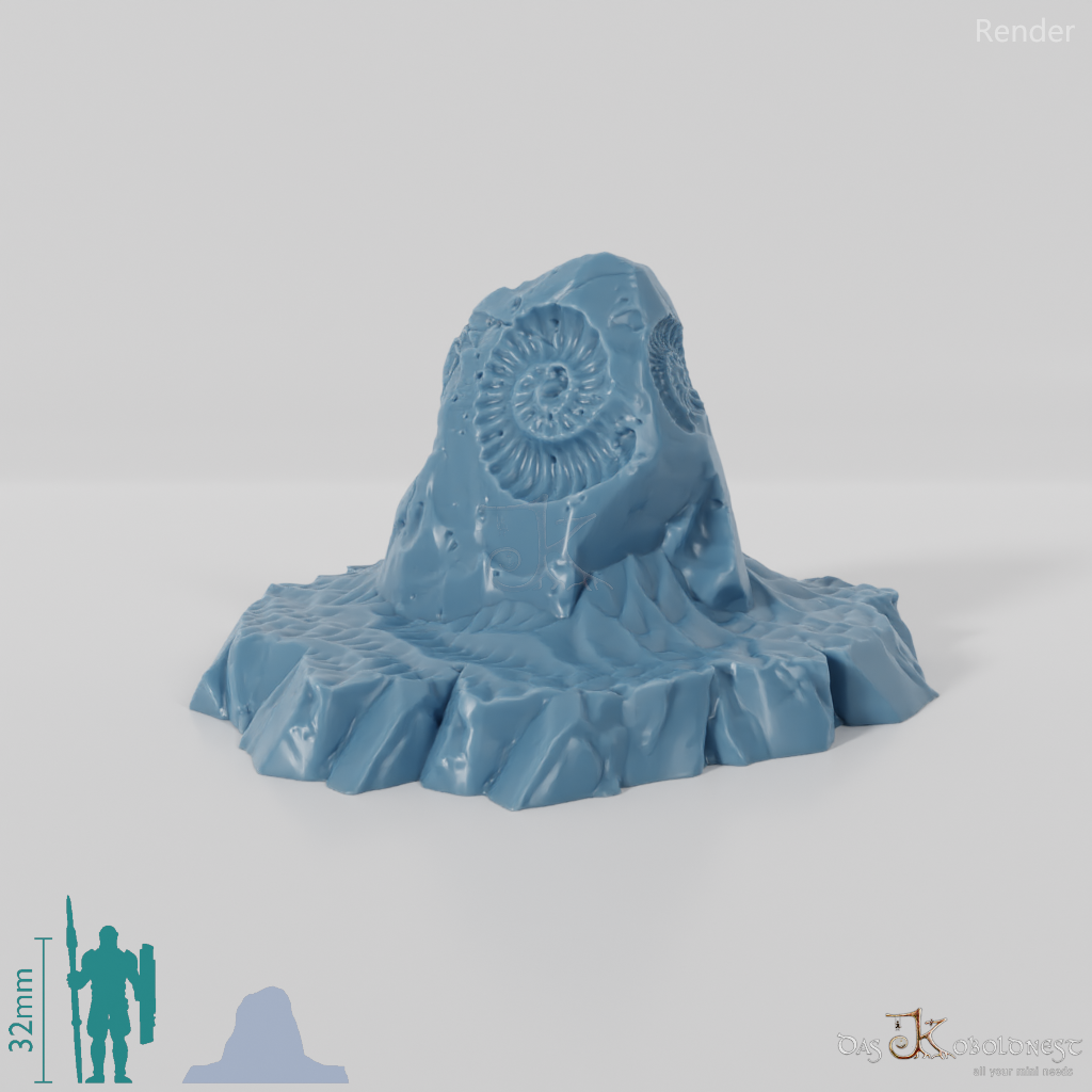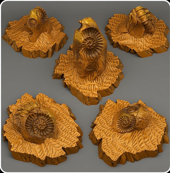 Aus dem Sand hervorstehende Felsen, die von großen Abdrücken fossilisierter Schnecken bedeckt sind