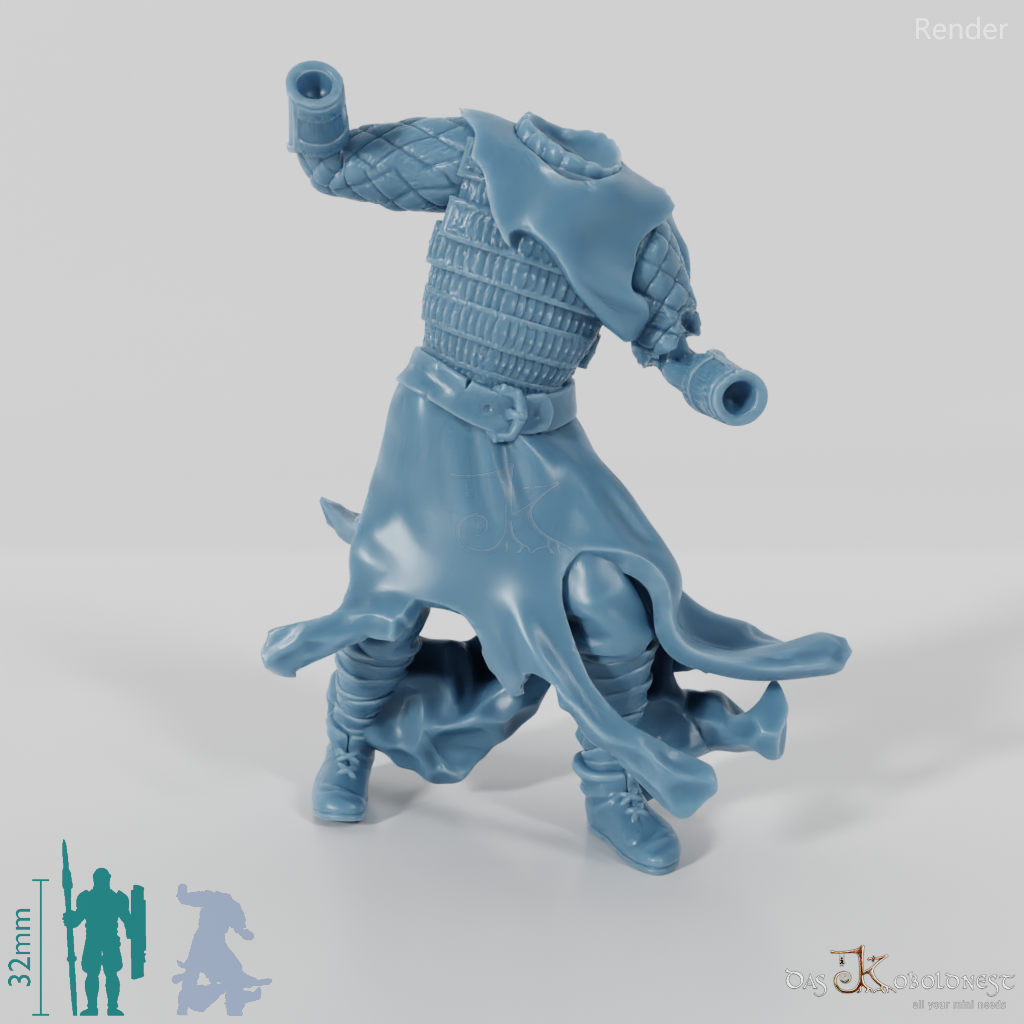 Untotenkörper ohne Kopf und Hände mit wehenden Stofffetzen und Rüstung. Das Modell kann beliebig mit allen modularen Köpfen und Waffen der Reihe "Die Armee der Toten" kombiniert werden. Im Customizer von The Printing Goes Ever On kannst du dir selbst eine Vorschau deiner modularen Geisterarmee erstellen und die perfekten Kombinationen für dich finden.