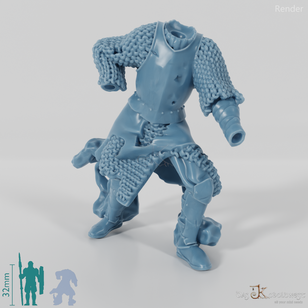 Untotenkörper ohne Kopf und Hände mit wehenden Stofffetzen und Rüstung. Das Modell kann beliebig mit allen modularen Köpfen und Waffen der Reihe "Die Armee der Toten" kombiniert werden. Im Customizer von The Printing Goes Ever On kannst du dir selbst eine Vorschau deiner modularen Geisterarmee erstellen und die perfekten Kombinationen für dich finden.