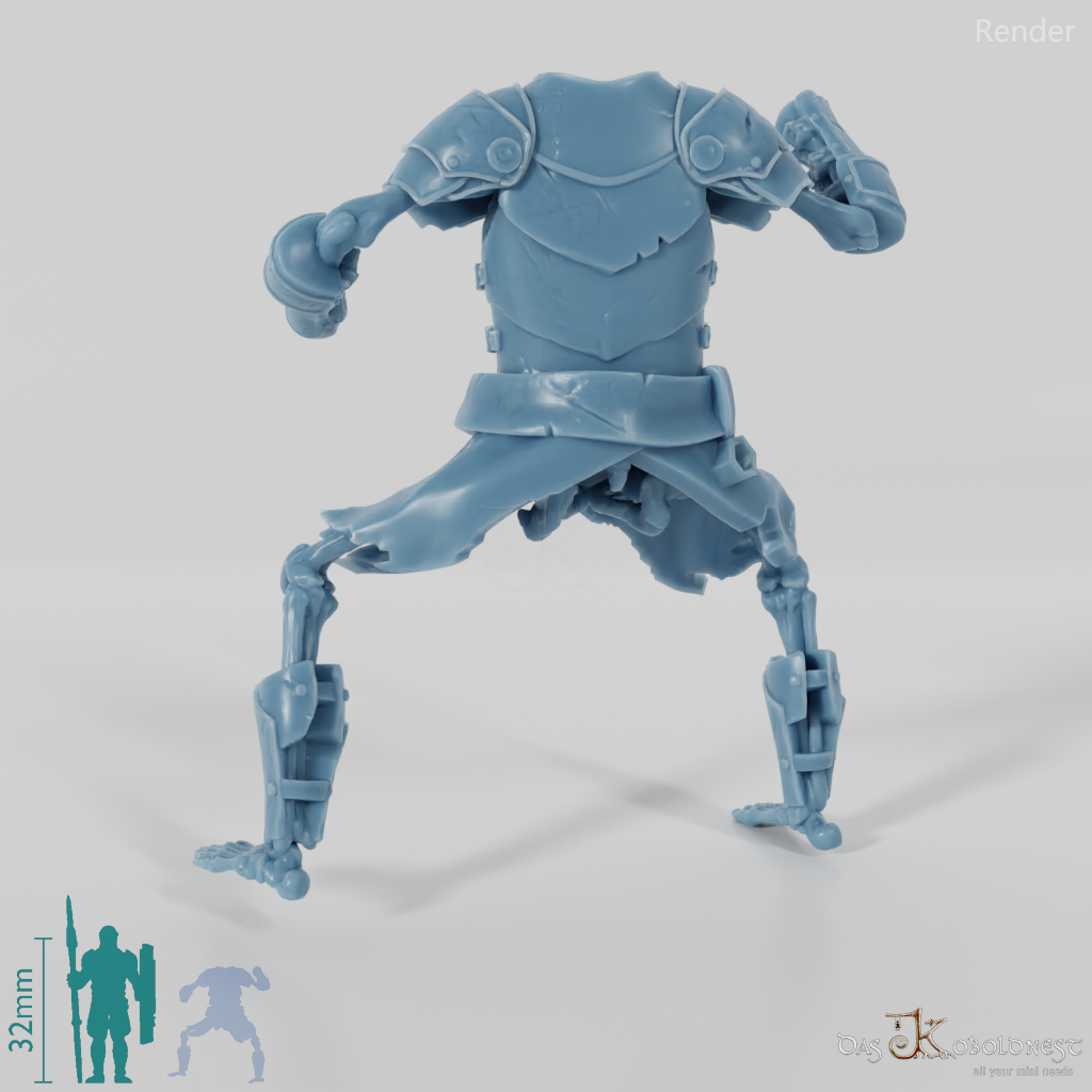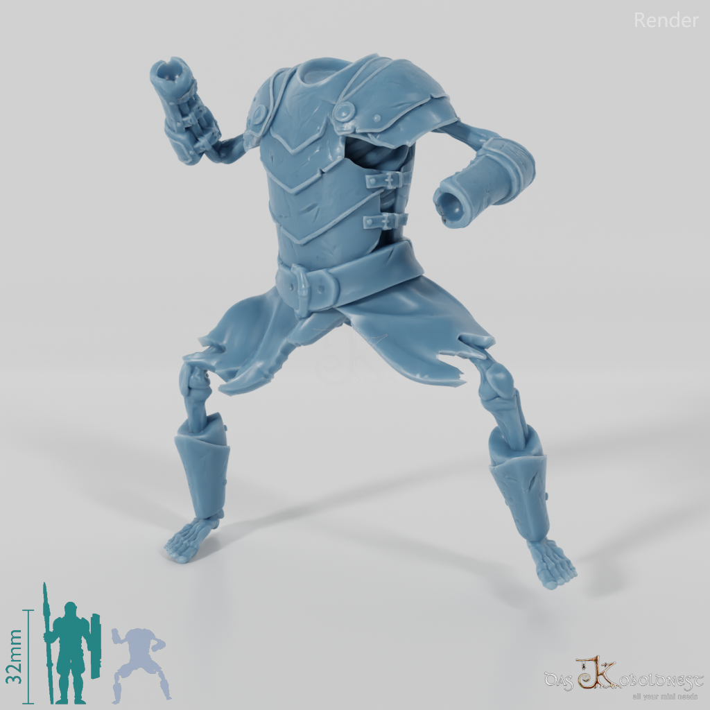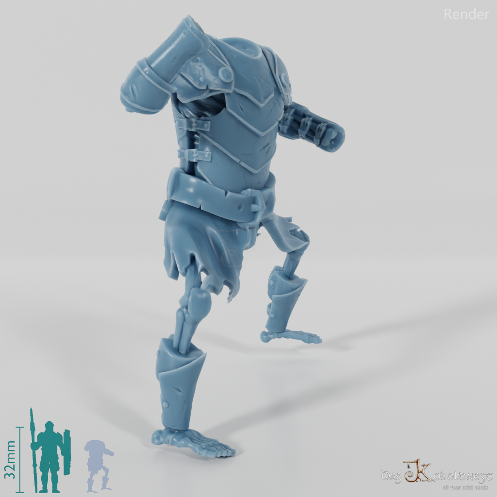 Untotenkörper ohne Kopf und Hände mit skelettiertem Körper in Rüstung. Das Modell kann beliebig mit allen modularen Köpfen und Waffen der Reihe "Die Armee der Toten" kombiniert werden. Im Customizer von The Printing Goes Ever On kannst du dir selbst eine Vorschau deiner modularen Geisterarmee erstellen und die perfekten Kombinationen für dich finden.