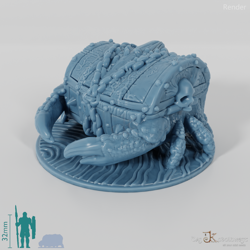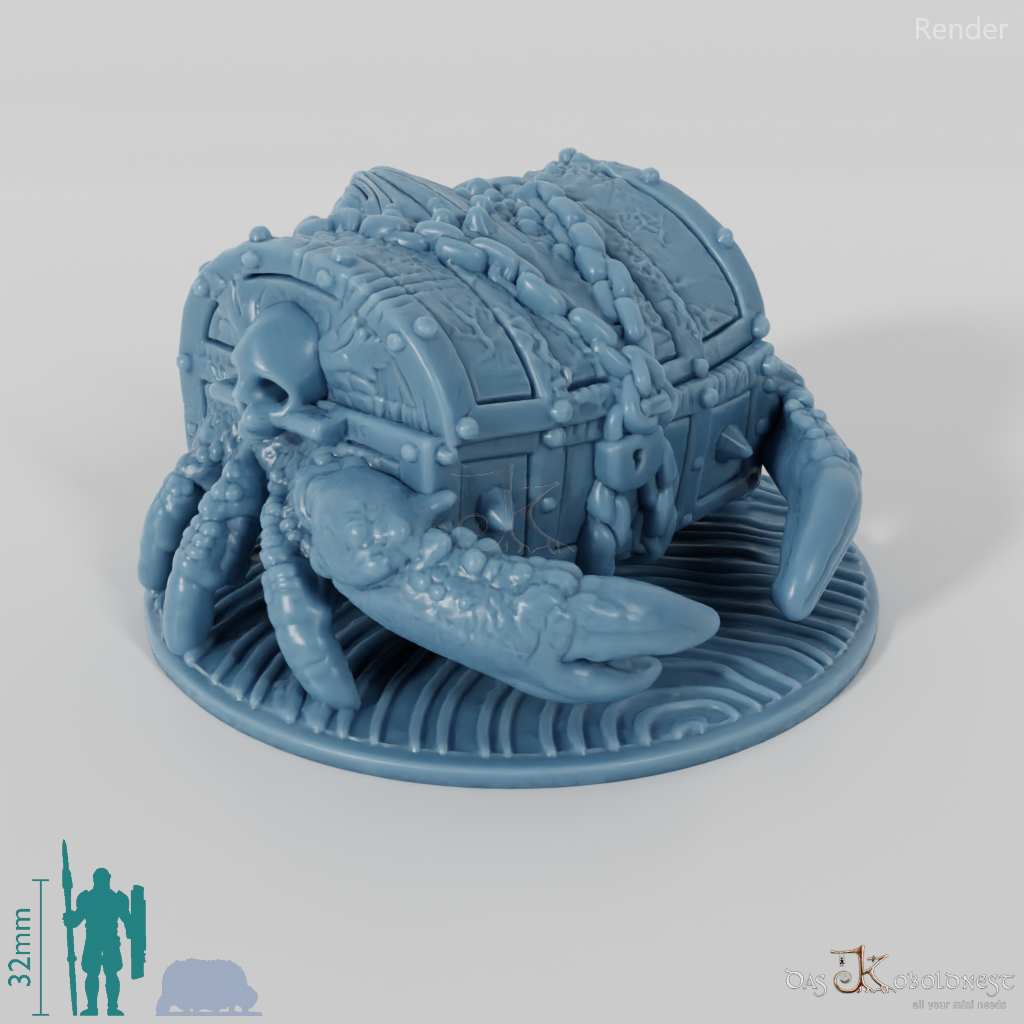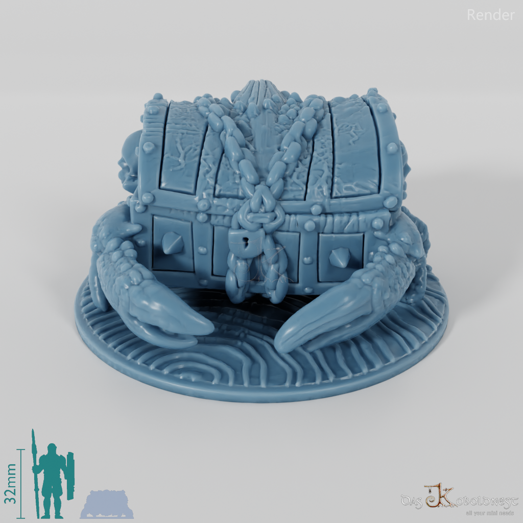 Große, sechsbeinige Schatztruhe mit zwei großen Krebsscheren, deren Deckel mit Ketten umwickelt und mit einem Schloss verschlossen ist. Das Modell steht auf einer Base mit Sandstruktur mit 25mm Durchmesser.