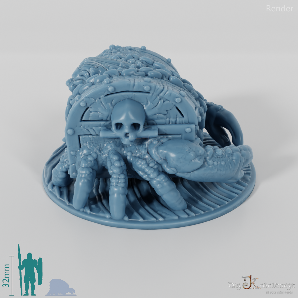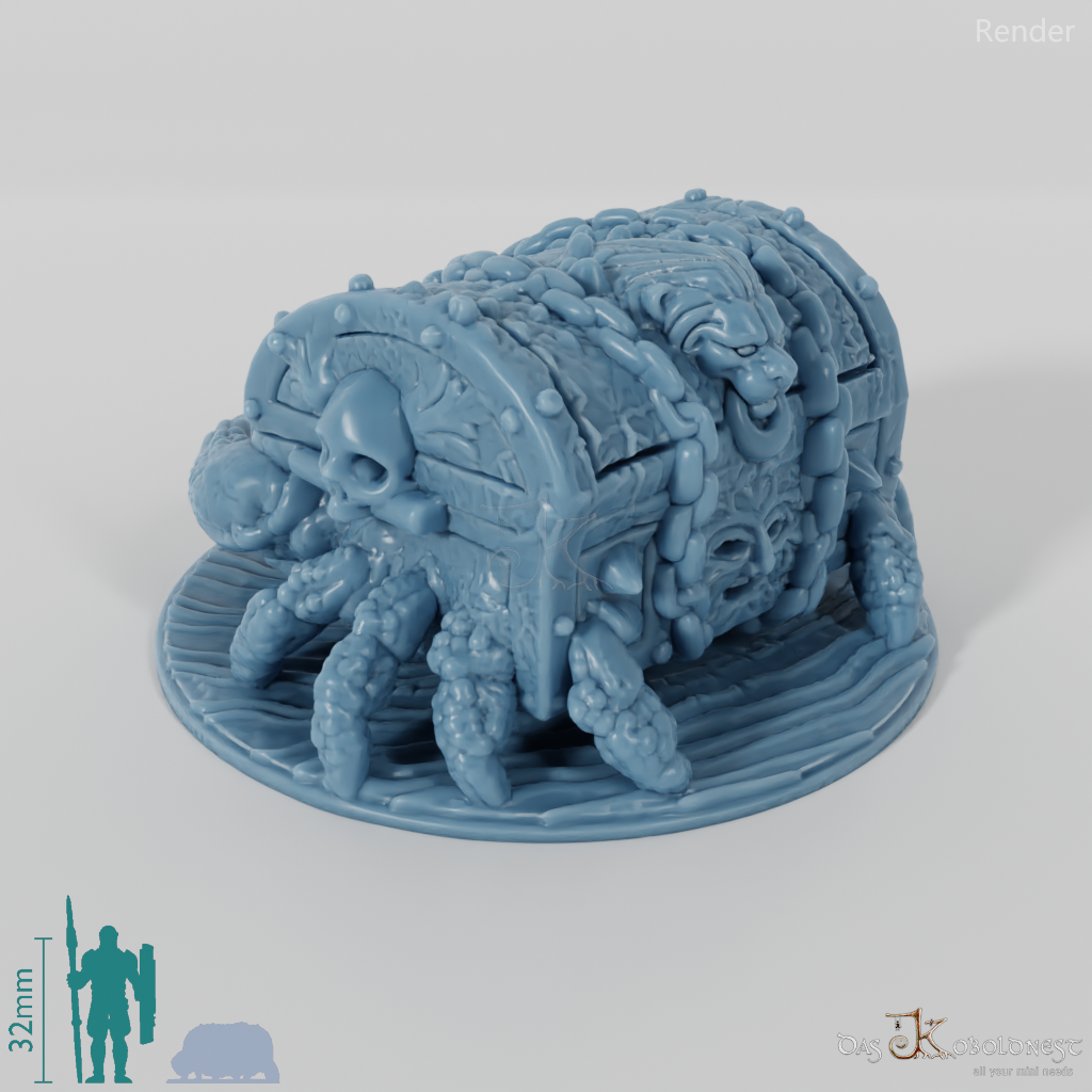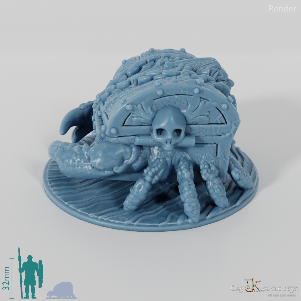 Große, sechsbeinige Schatztruhe mit zwei großen Krebsscheren, deren Deckel mit Ketten umwickelt und mit einem Schloss verschlossen ist. Das Modell steht auf einer Base mit Sandstruktur mit 25mm Durchmesser.