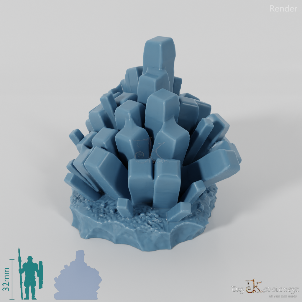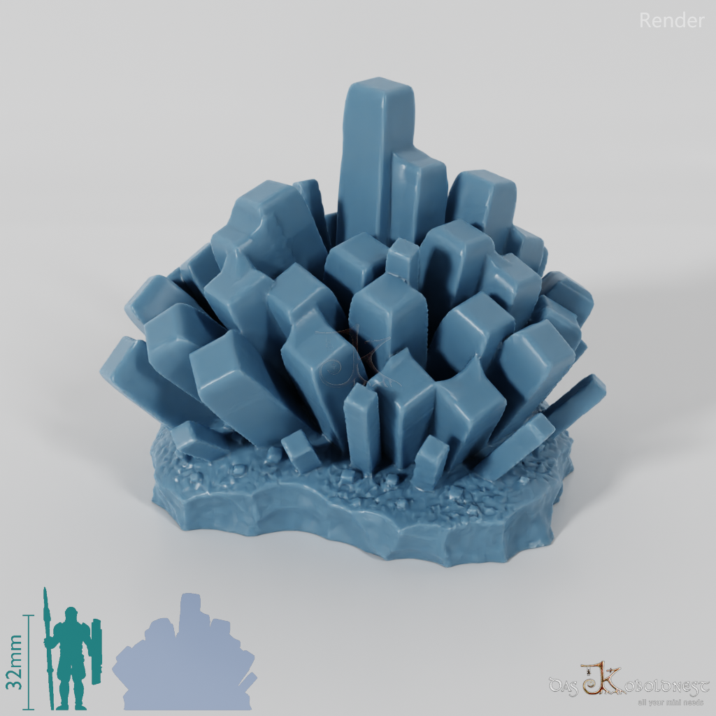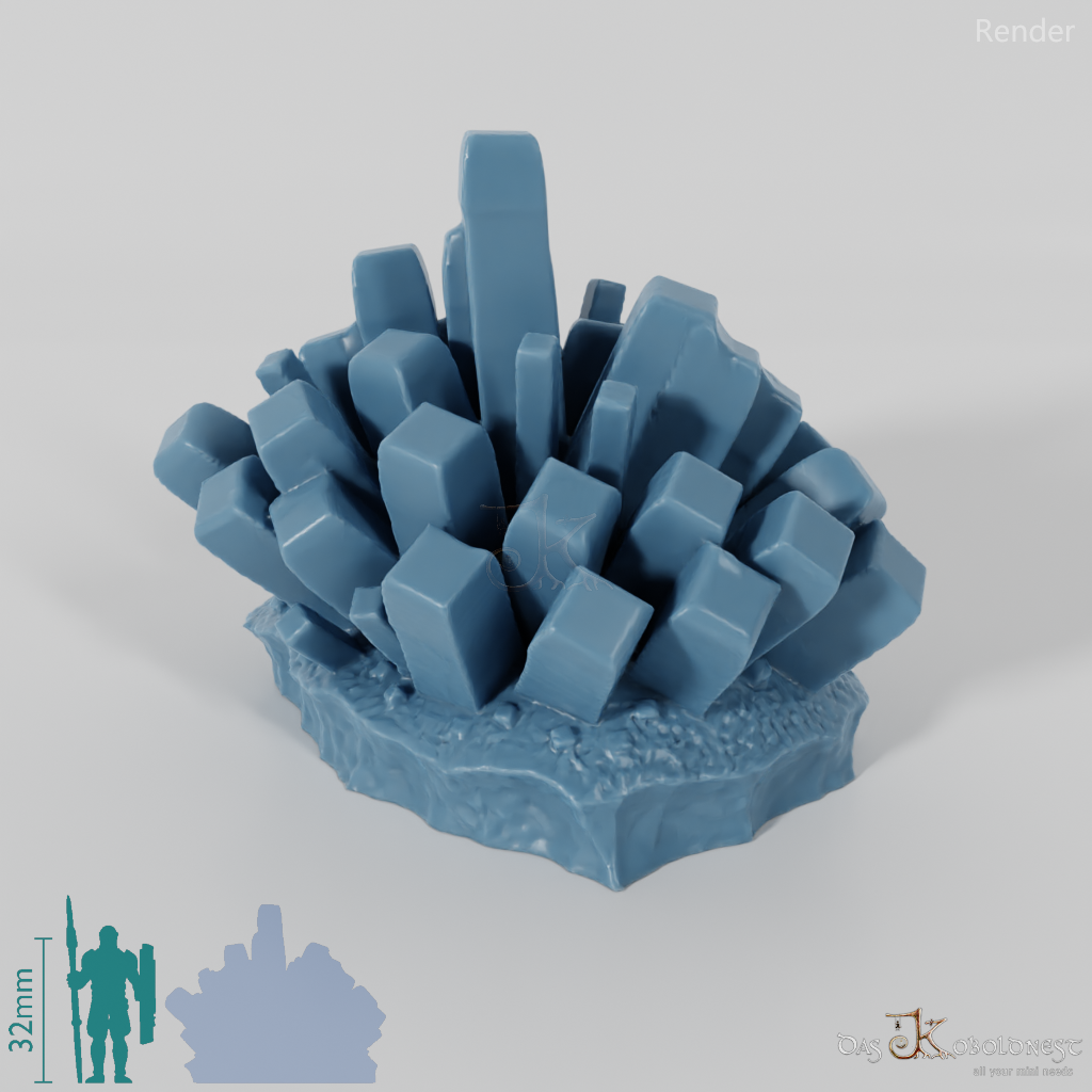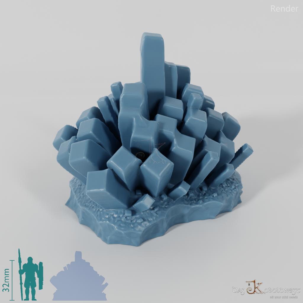 Meterhohe Formationen viereckiger Kristalle, die aus dem Boden ragen Modell: Cube Crystal Scifi/Fantasy Wargame terrain by rexxthunder, lizenziert unter CC BY 3.0.