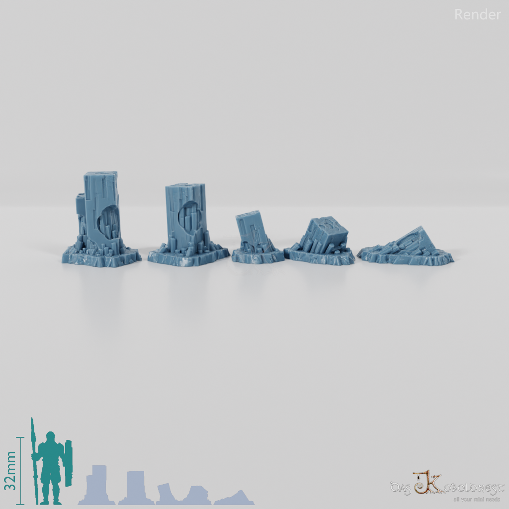 Aufgebrochene, viereckige Säulen, die von Kristallstrukturen durchsetzt und überzogen sind