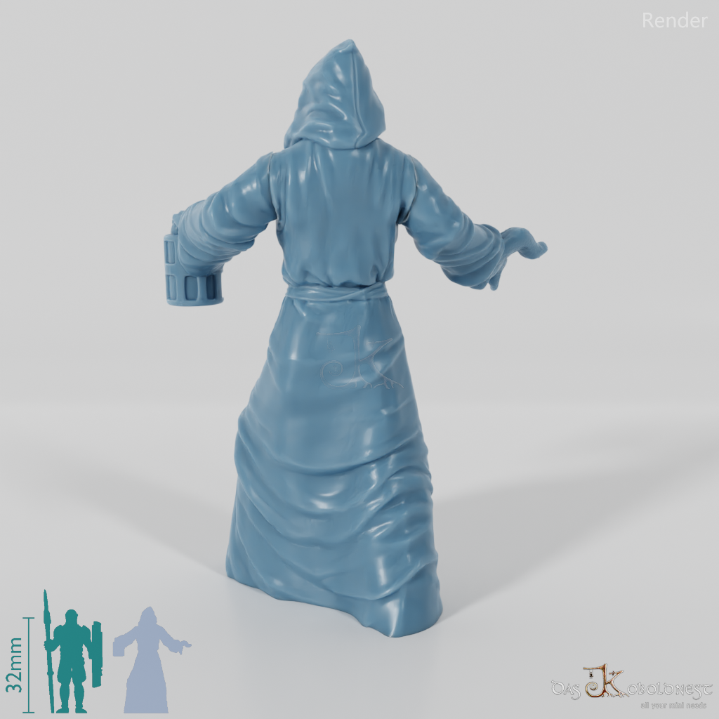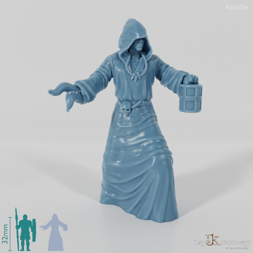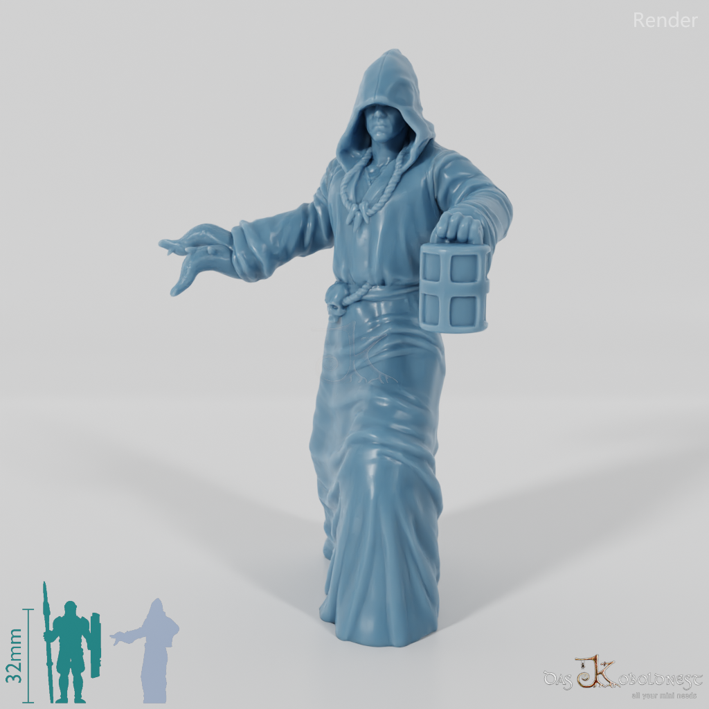 Kultist in Robe mit Tentakelhand, der eine Laterne hält Modell: Cultist by 3DArtGuy, lizenziert unter CC BY 3.0.