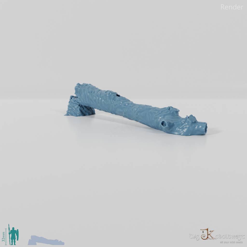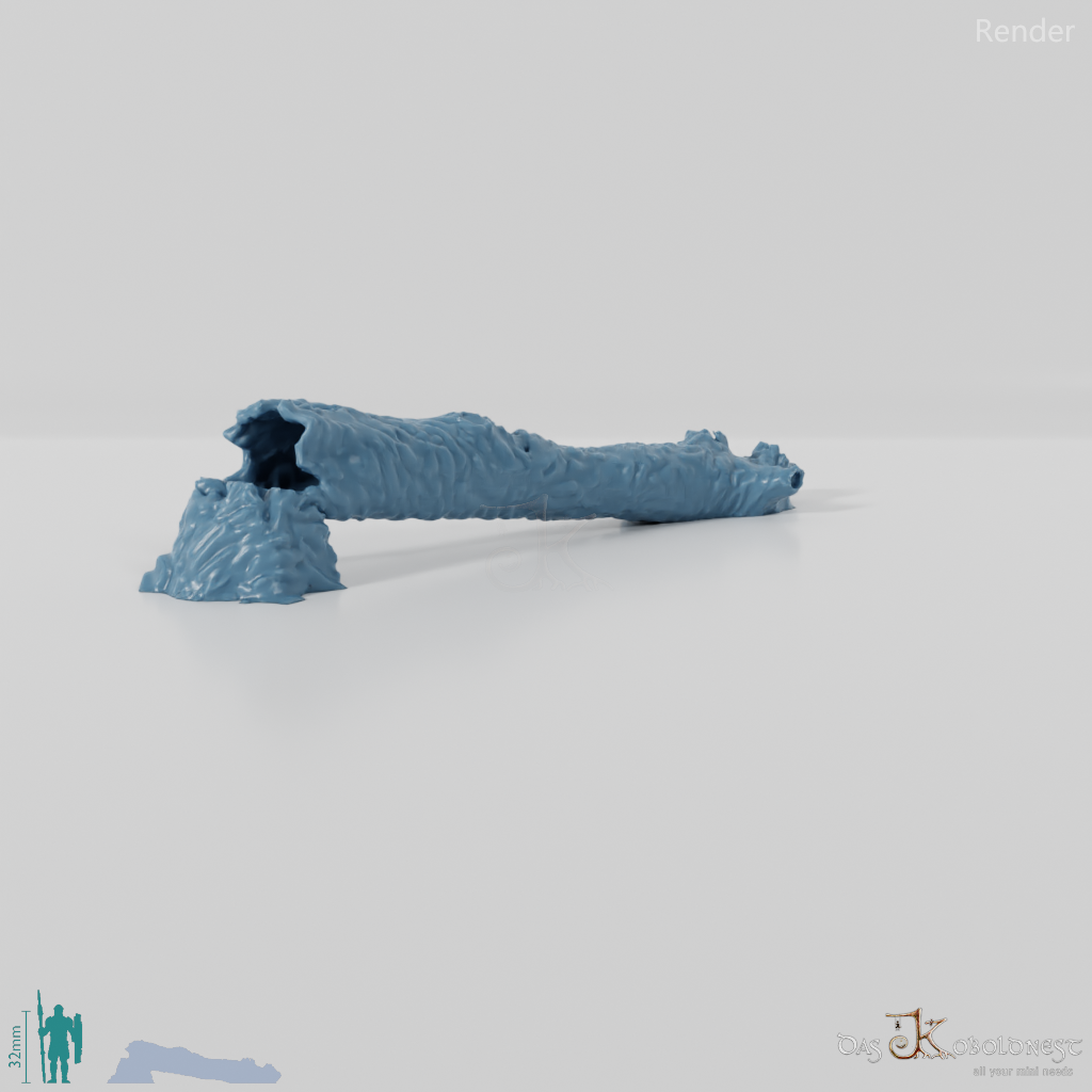 Gefällter oder umgestürzter Baum, der teils auf dem Boden, teils auf seinem Stumpf aufliegt und keine Äste mehr hat.   Modell: Fallen Tree and Stump by Curufin, lizenziert unter CC BY 3.0.