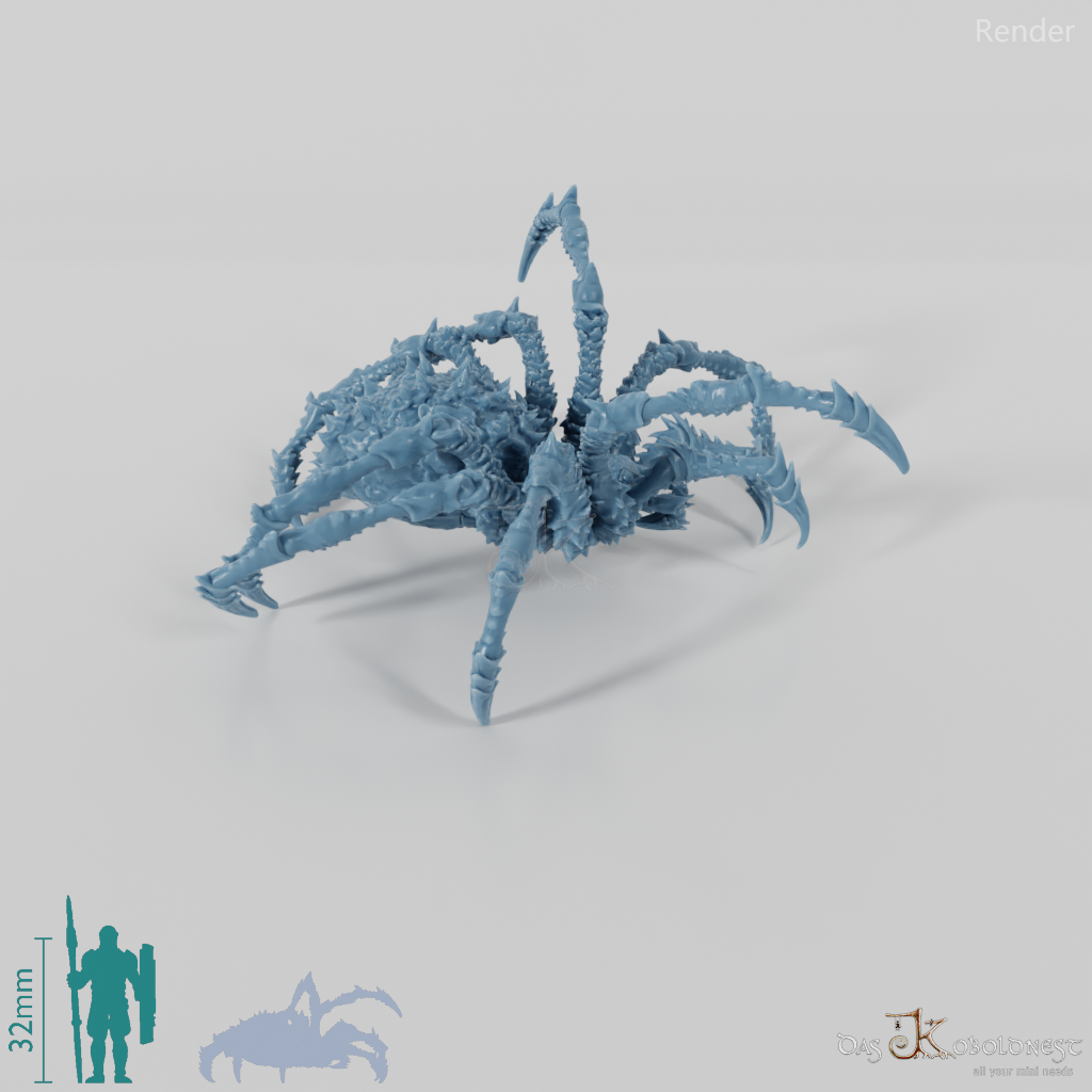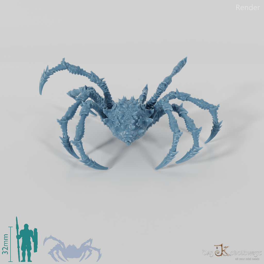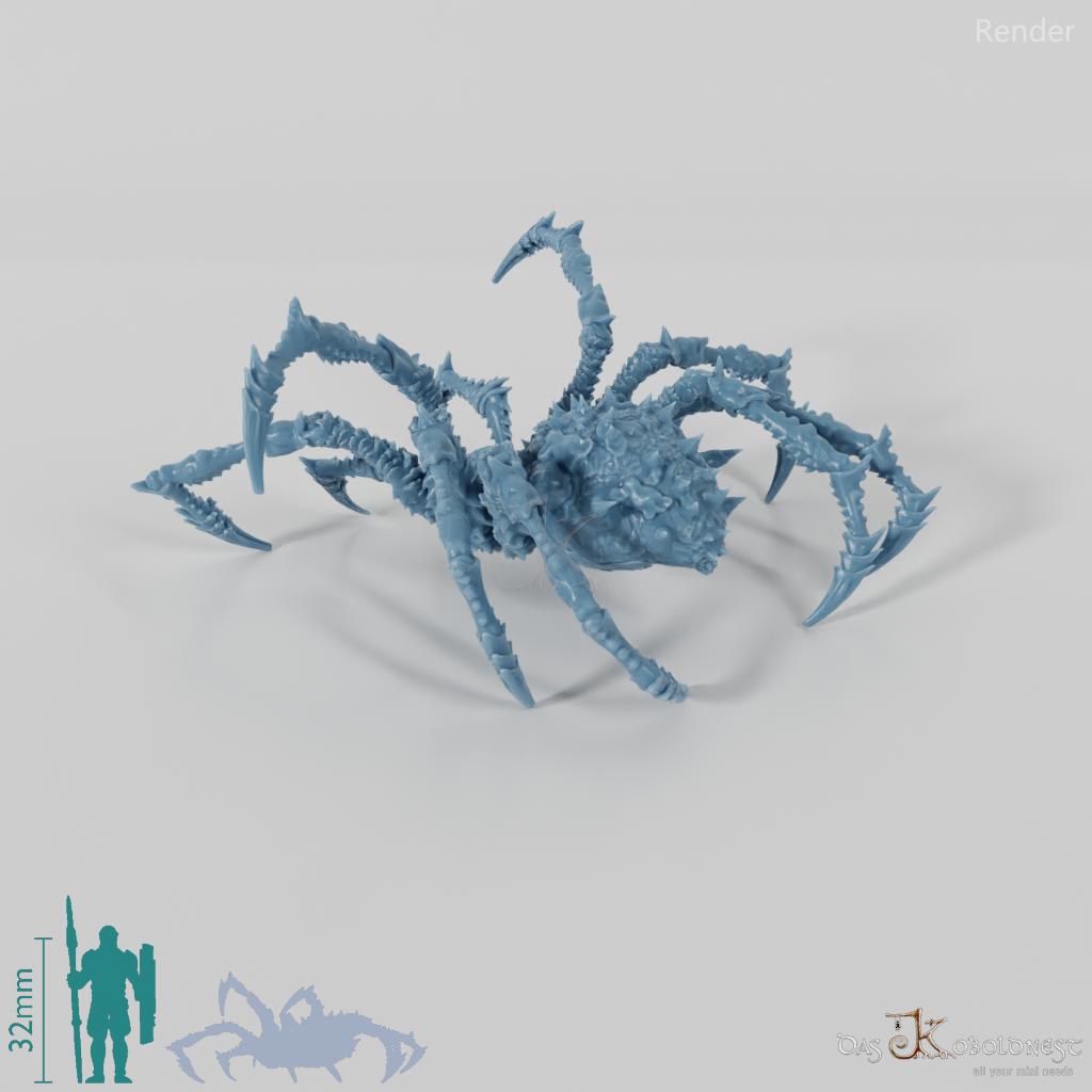 Riesenspinne mit stacheligem Körper und Beinen. Modell passt knapp auf eine 40mm-Rundbase und bequem auf 50- und 60mm-Rundbases.